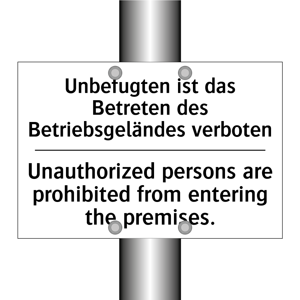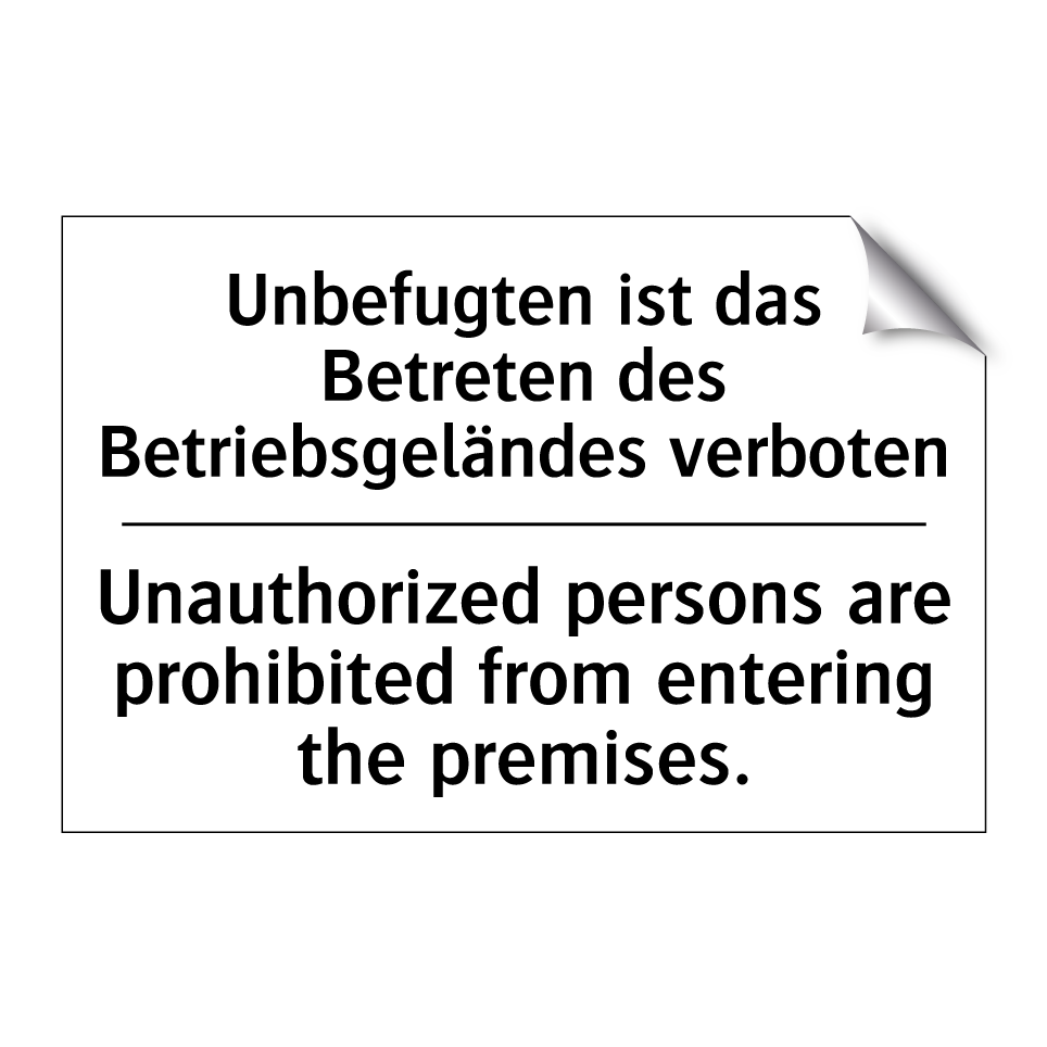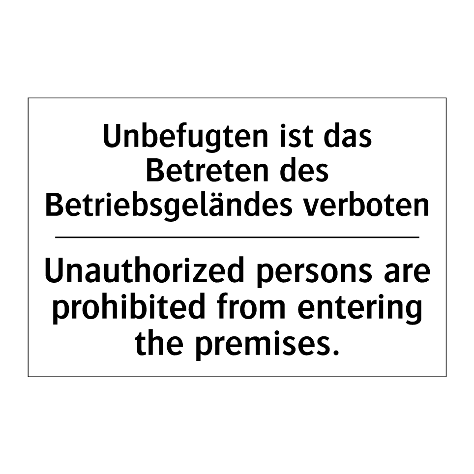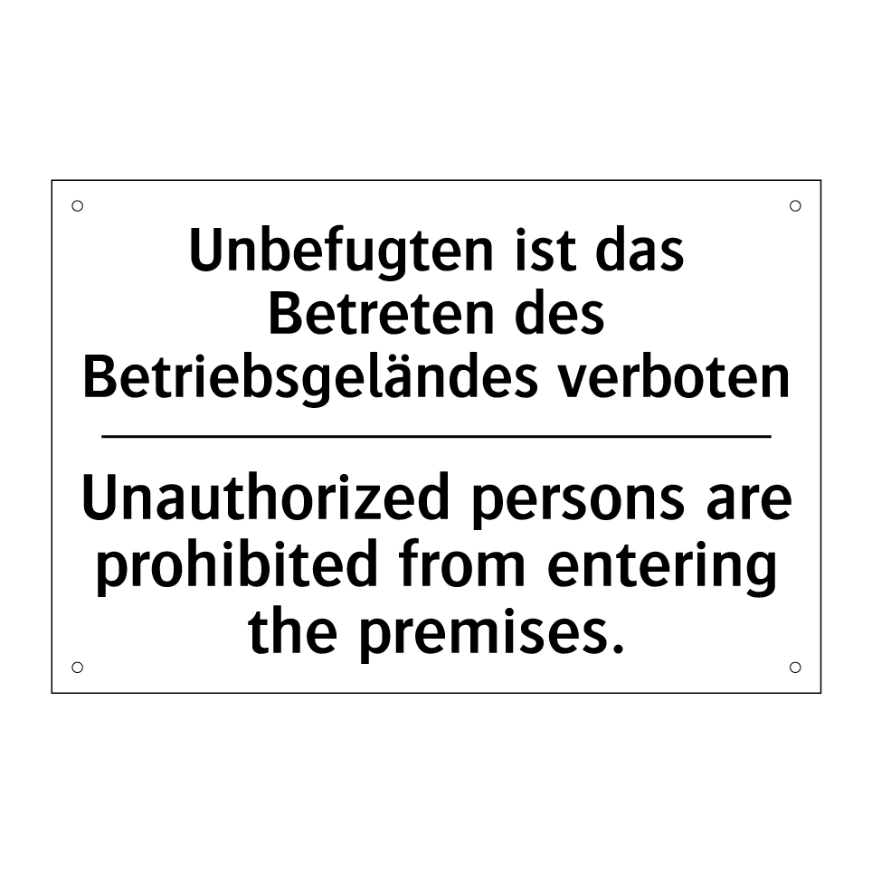 Zweisprachiges Verbotsschild mit deutschem Text Unbefugten ist das Betreten des Betriebsgeländes verboten und englischem Text Unauthorized persons are prohibited from entering the premises.