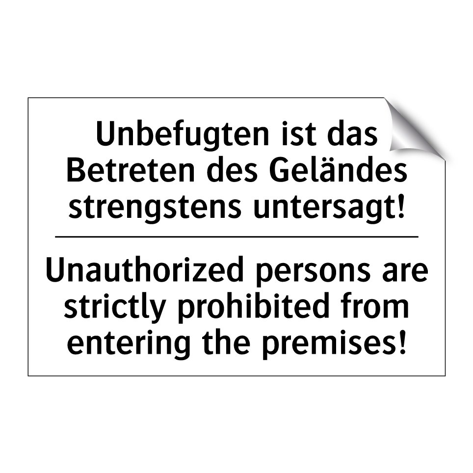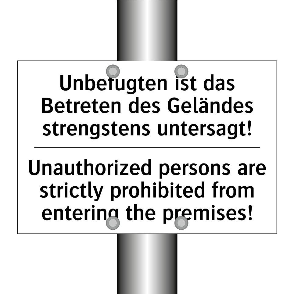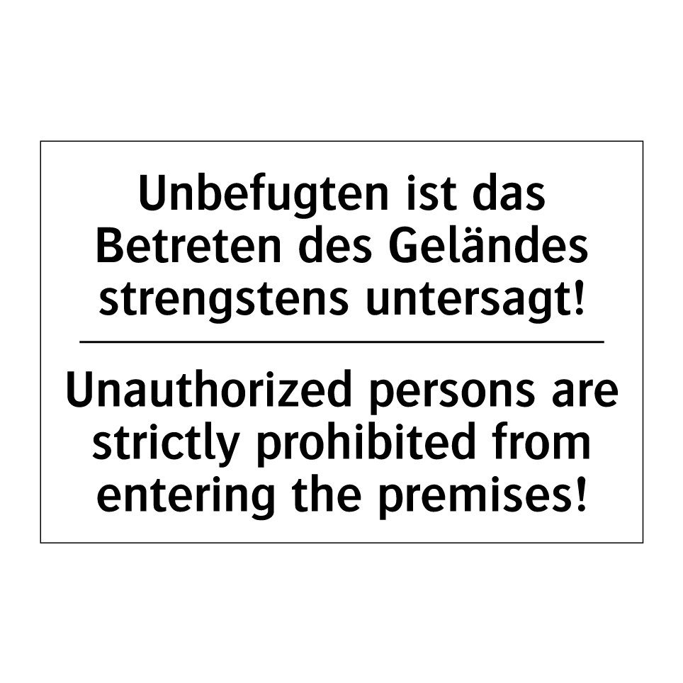 Zweisprachiges Verbotsschild mit deutschem Text Unbefugten ist das Betreten des Geländes strengstens untersagt! und englischem Text Unauthorized persons are strictly prohibited from entering the premises!
