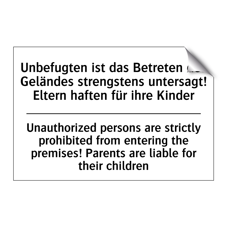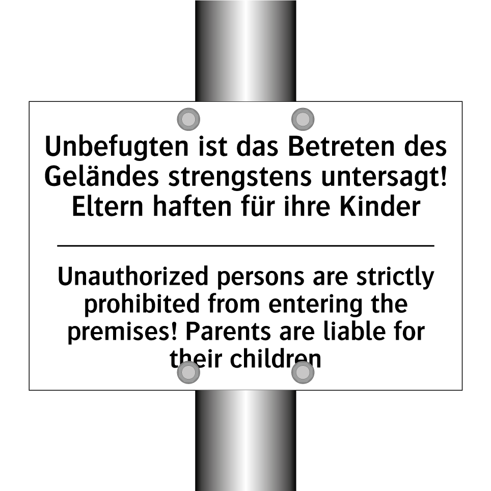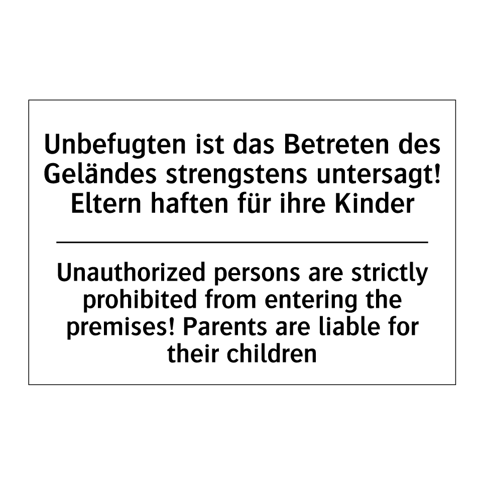 Zweisprachiges Verbotsschild mit deutschem Text Unbefugten ist das Betreten des Geländes strengstens untersagt! Eltern haften für ihre Kinder und englischem Text Unauthorized persons are strictly prohibited from entering the premises! Parents are liable for their children