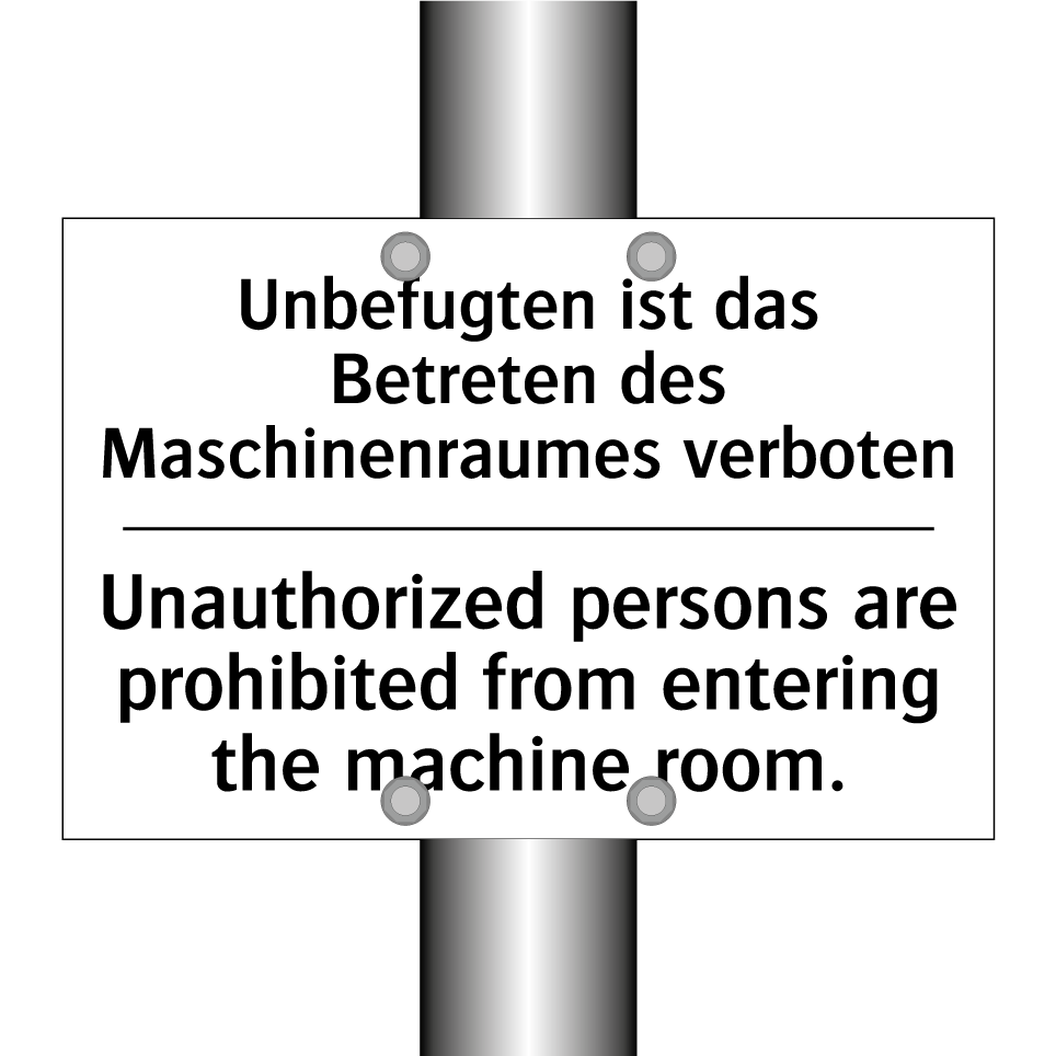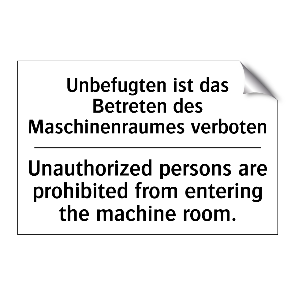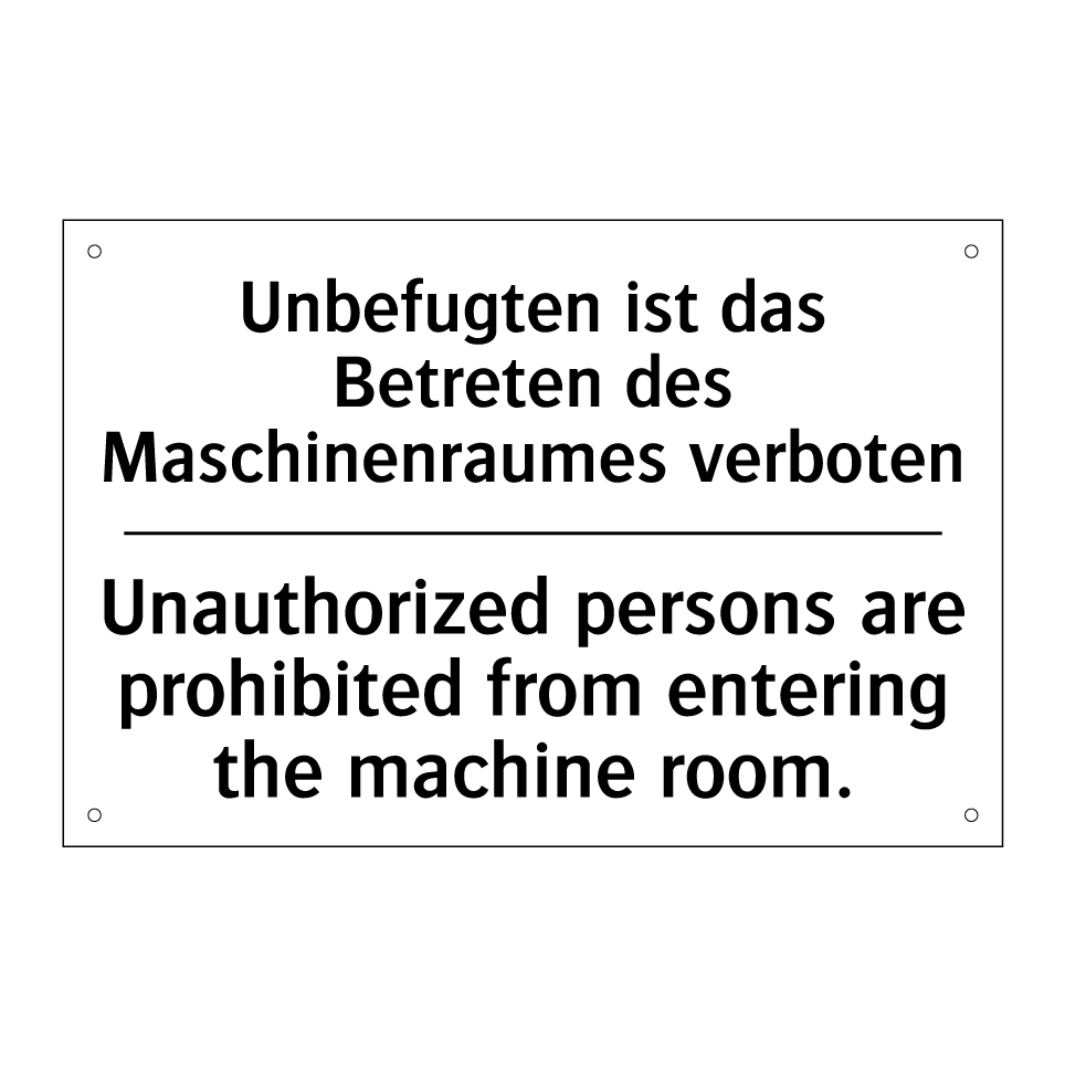 Zweisprachiges Verbotsschild mit deutschem Text Unbefugten ist das Betreten des Maschinenraumes verboten und englischem Text Unauthorized persons are prohibited from entering the machine room.