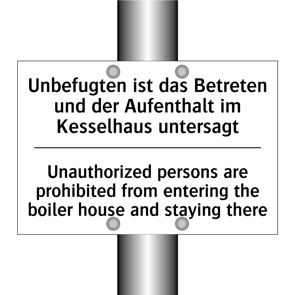 Zweisprachiges Verbotsschild mit deutschem Text Unbefugten ist das Betreten und der Aufenthalt im Kesselhaus untersagt und englischem Text Unauthorized persons are prohibited from entering the boiler house and staying there