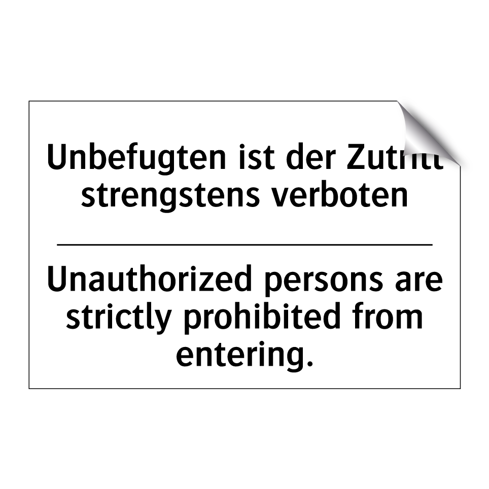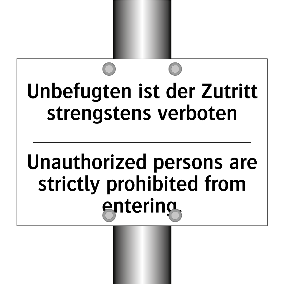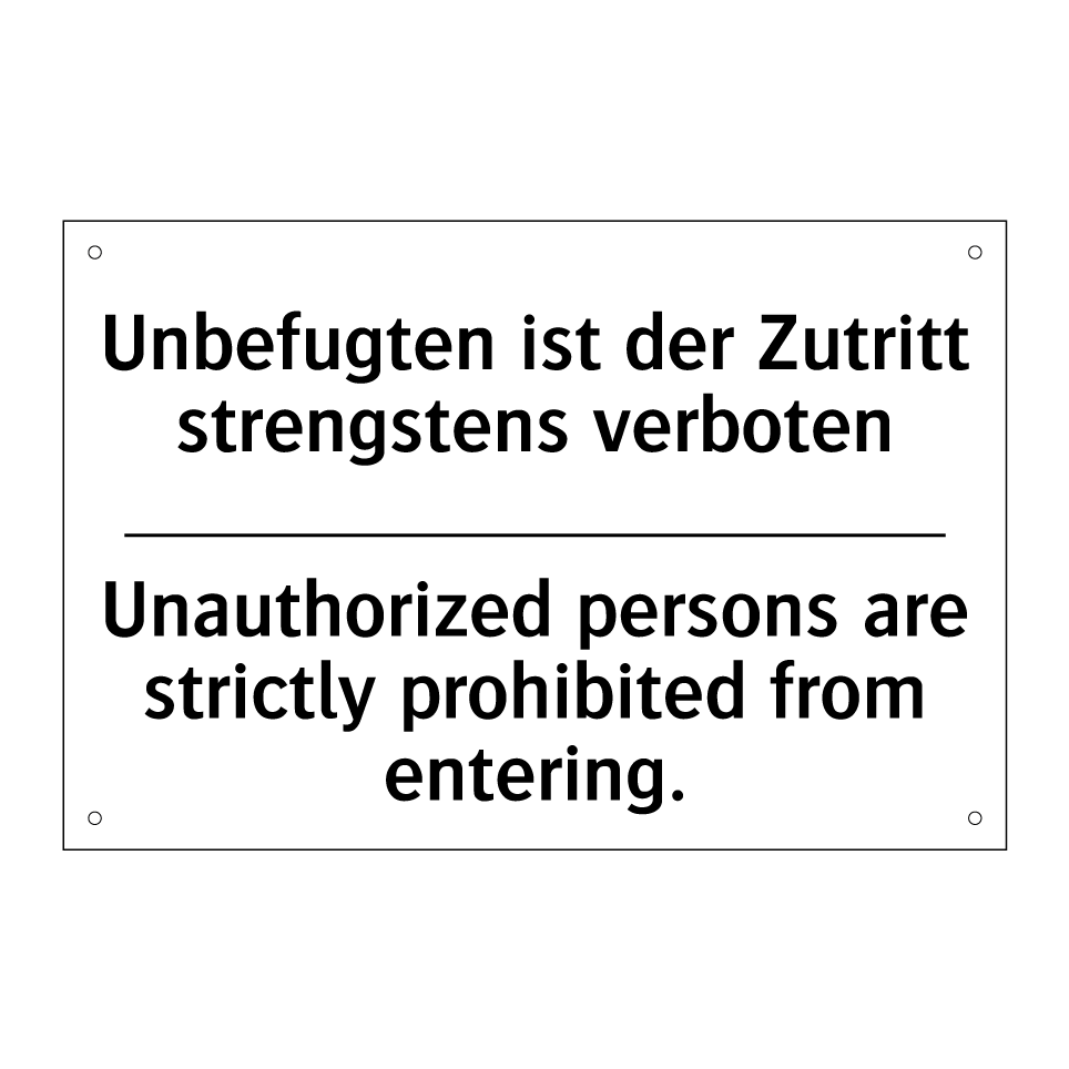 Zweisprachiges Verbotsschild mit deutschem Text Unbefugten ist der Zutritt strengstens verboten und englischem Text Unauthorized persons are strictly prohibited from entering.