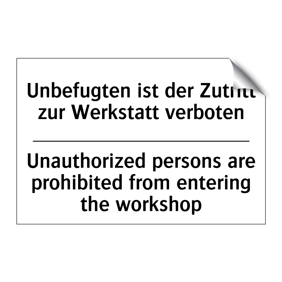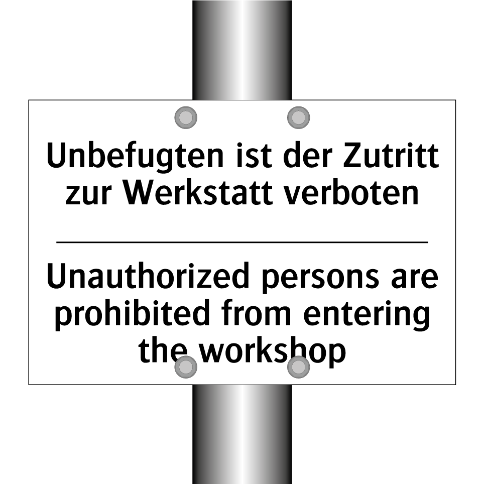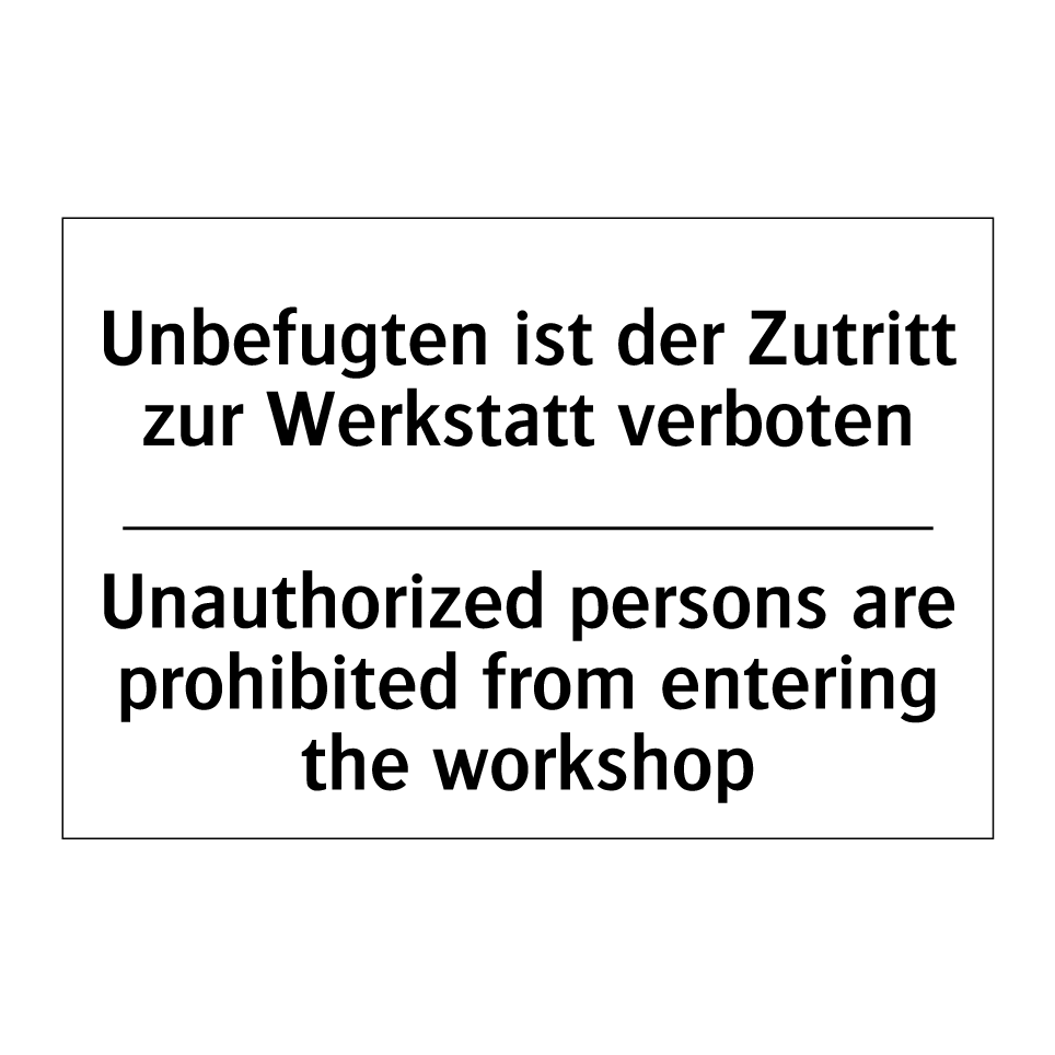Zweisprachiges Verbotsschild mit deutschem Text Unbefugten ist der Zutritt zur Werkstatt verboten und englischem Text Unauthorized persons are prohibited from entering the workshop