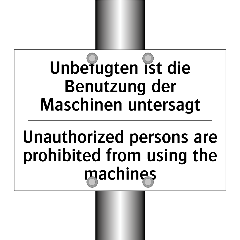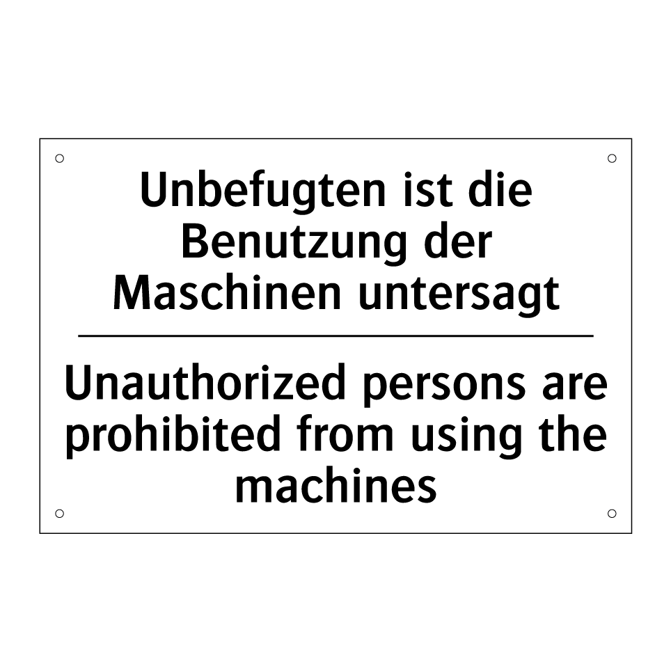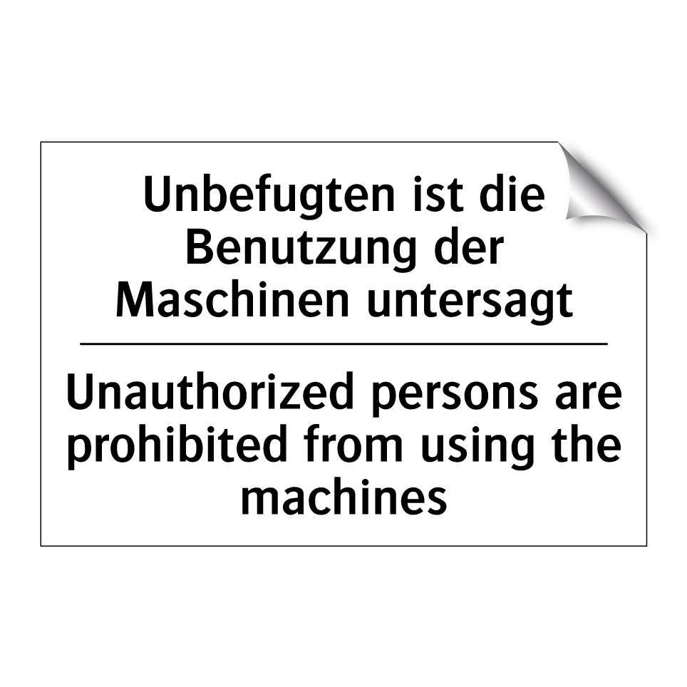 Zweisprachiges Verbotsschild mit deutschem Text Unbefugten ist die Benutzung der Maschinen untersagt und englischem Text Unauthorized persons are prohibited from using the machines
