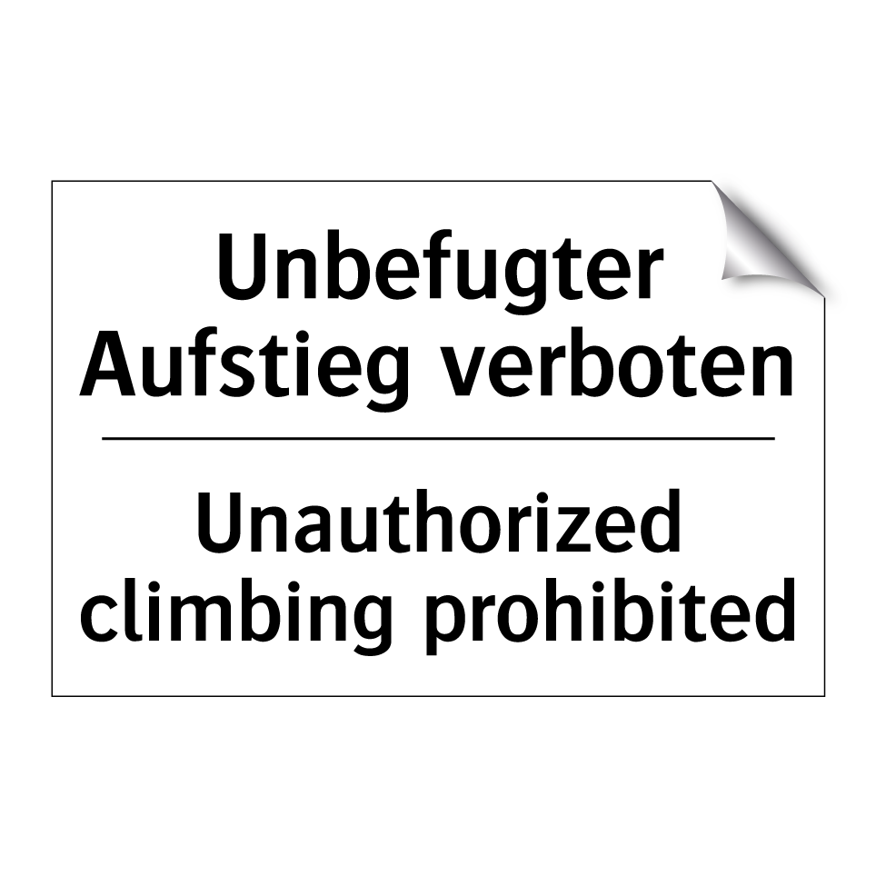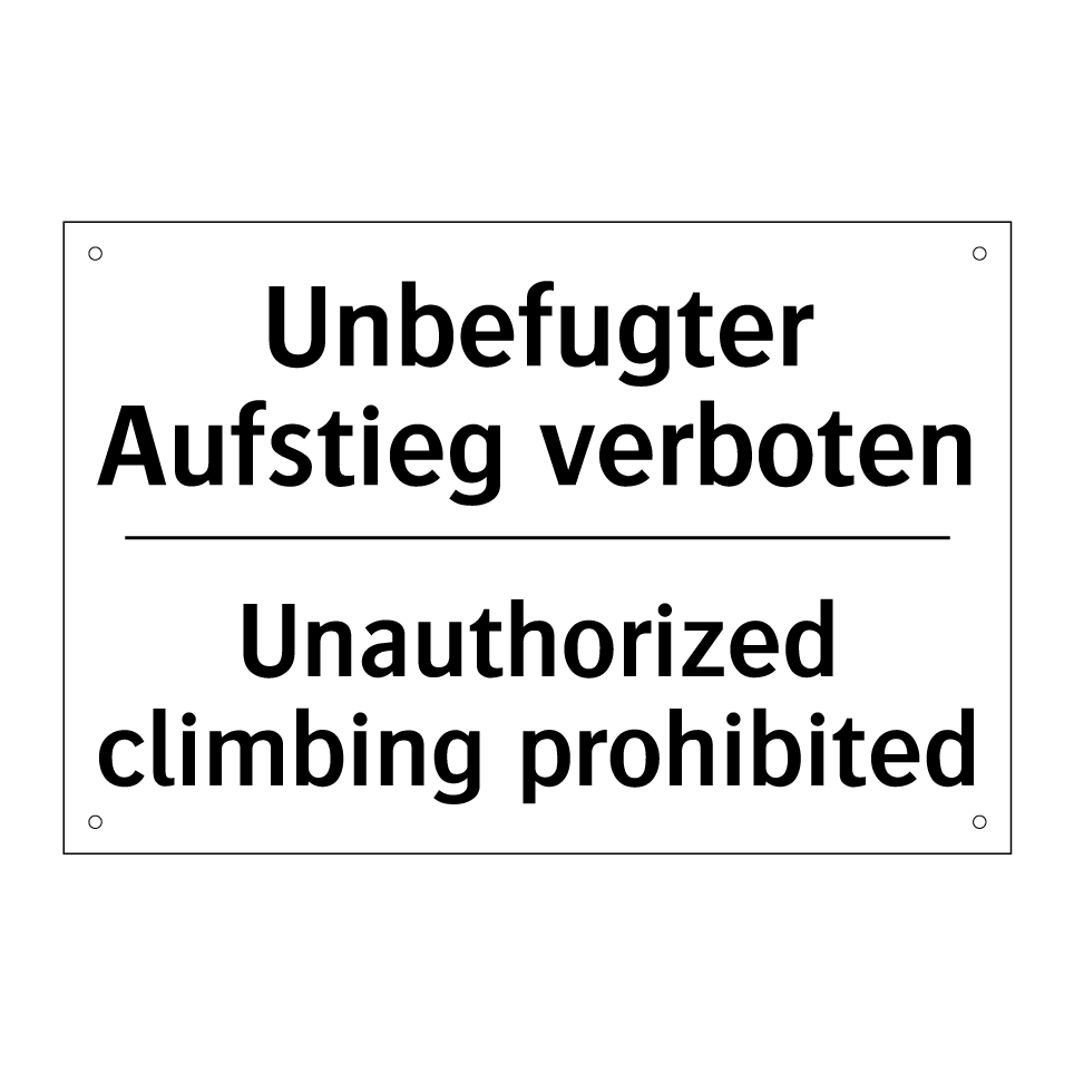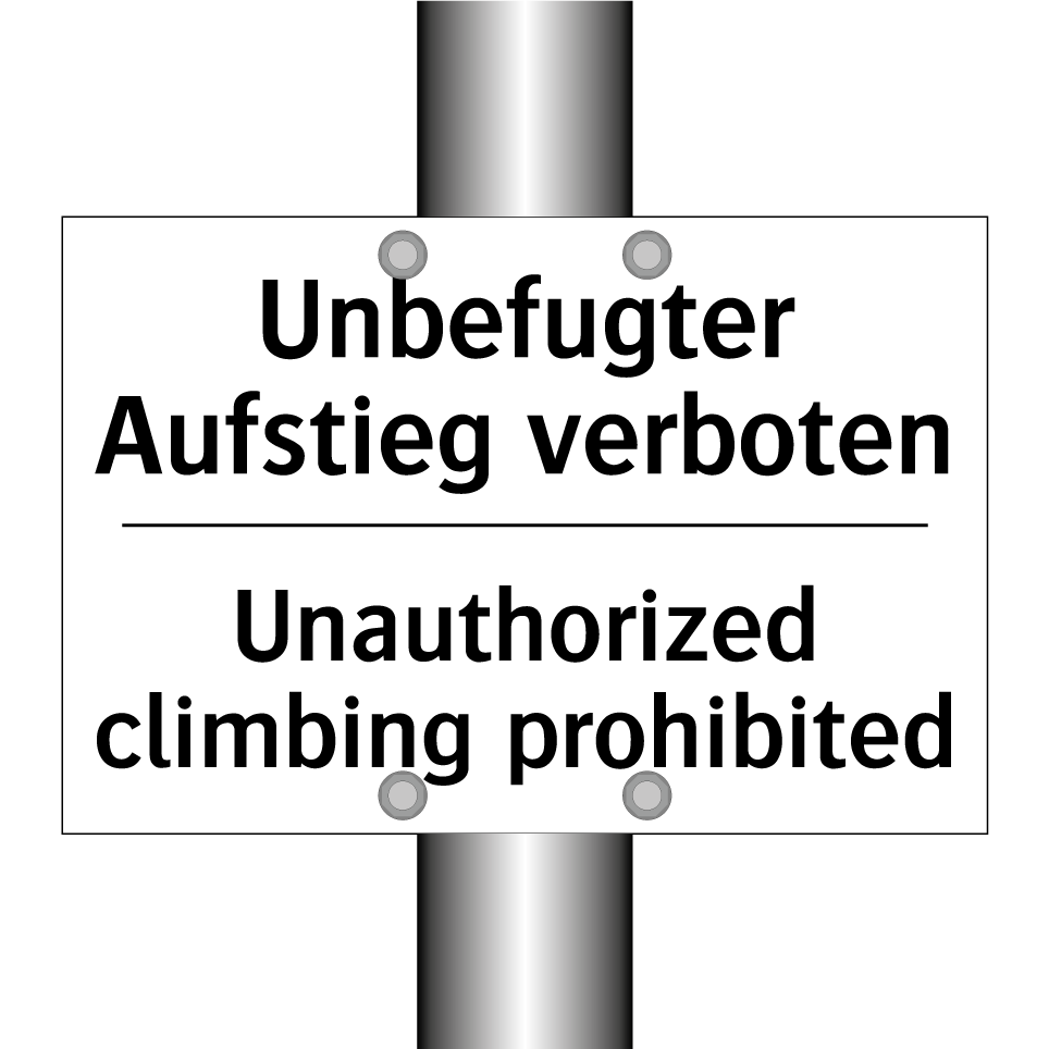 Zweisprachiges Verbotsschild mit deutschem Text Unbefugter Aufstieg verboten und englischem Text Unauthorized climbing prohibited