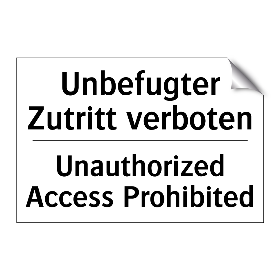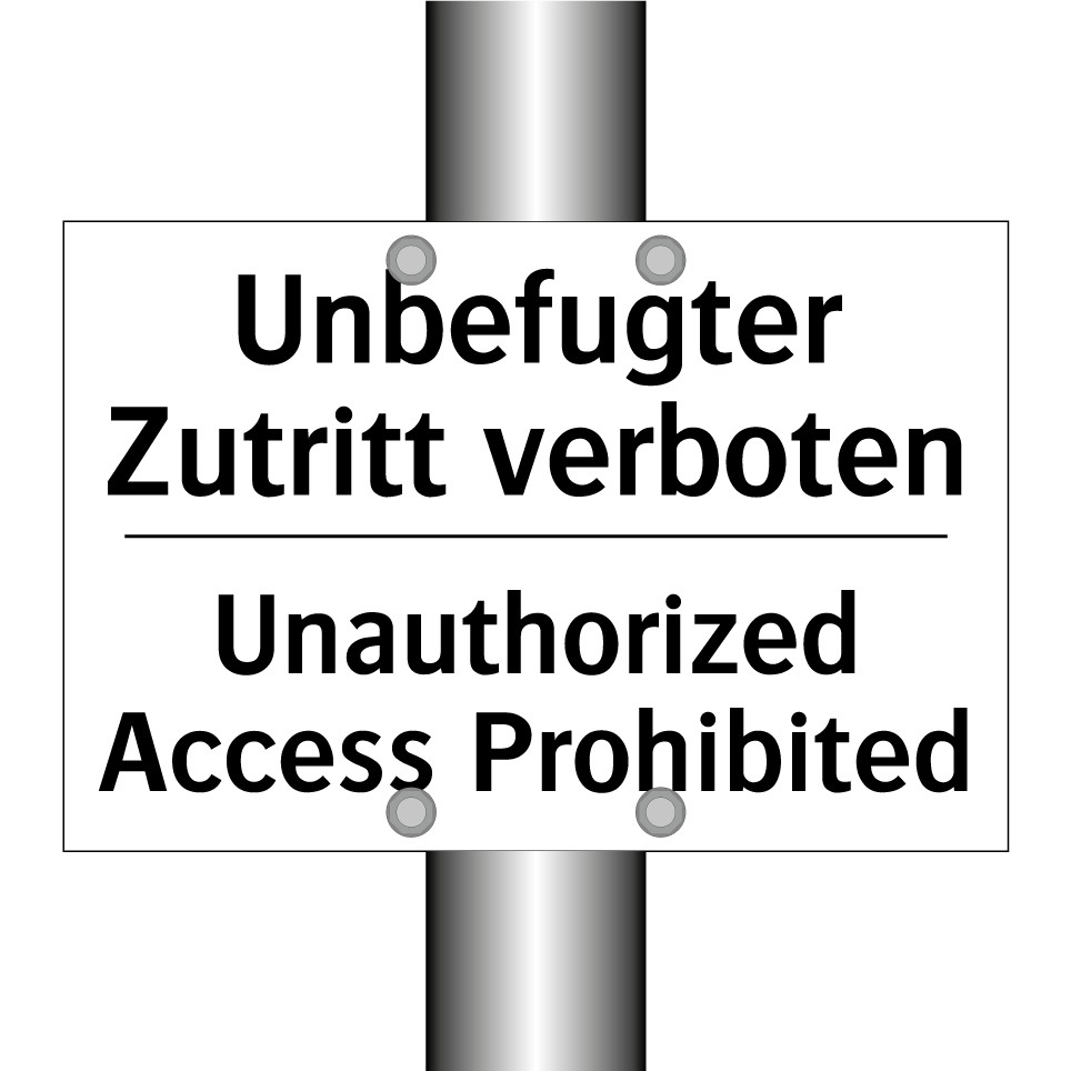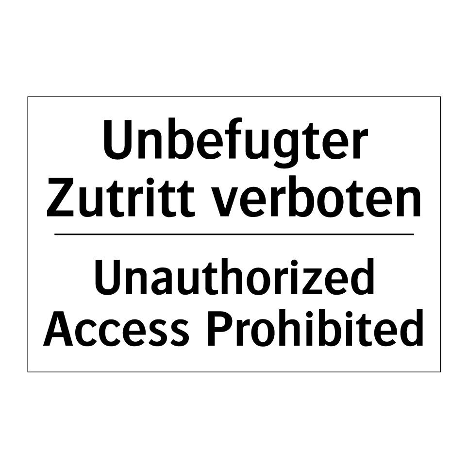 Zweisprachiges Verbotsschild mit deutschem Text Unbefugter Zutritt verboten und englischem Text Unauthorized Access Prohibited