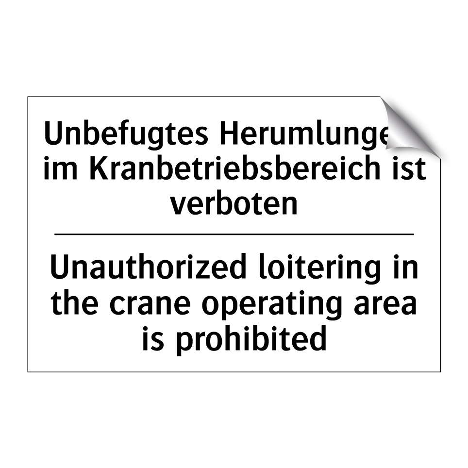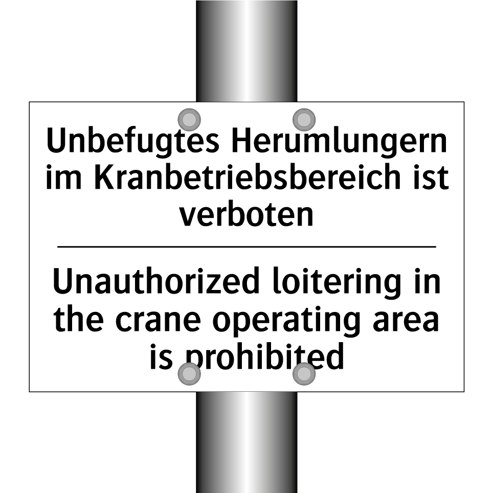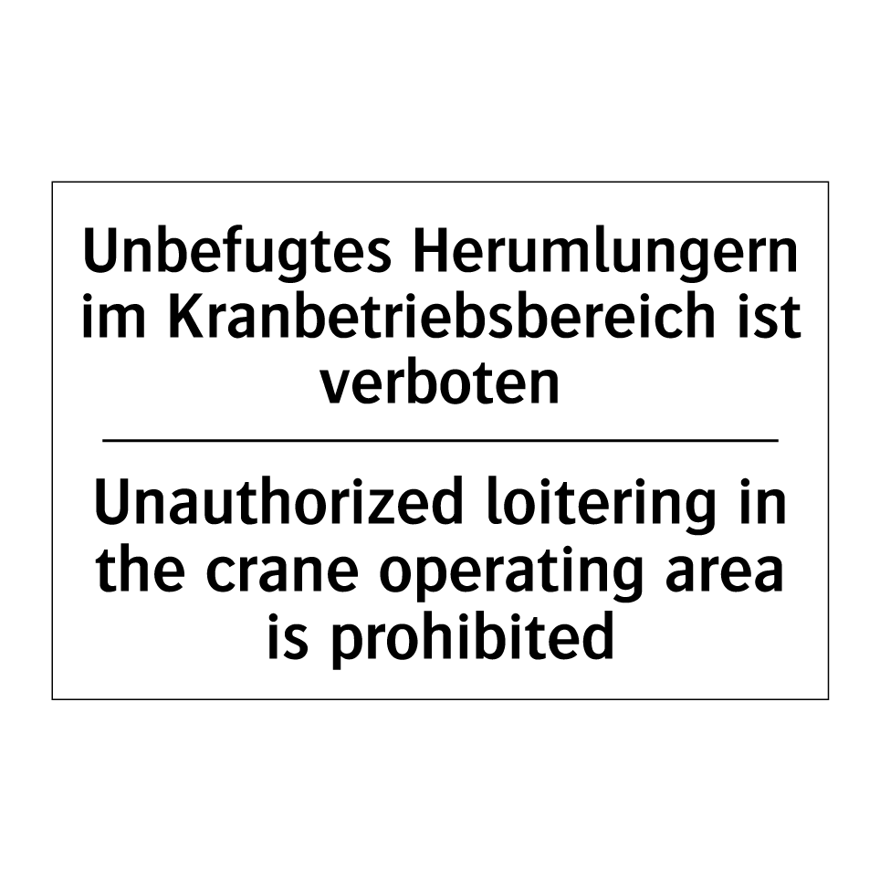 Zweisprachiges Verbotsschild mit deutschem Text Unbefugtes Herumlungern im Kranbetriebsbereich ist verboten und englischem Text Unauthorized loitering in the crane operating area is prohibited