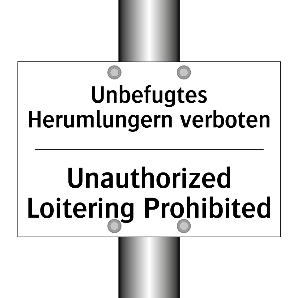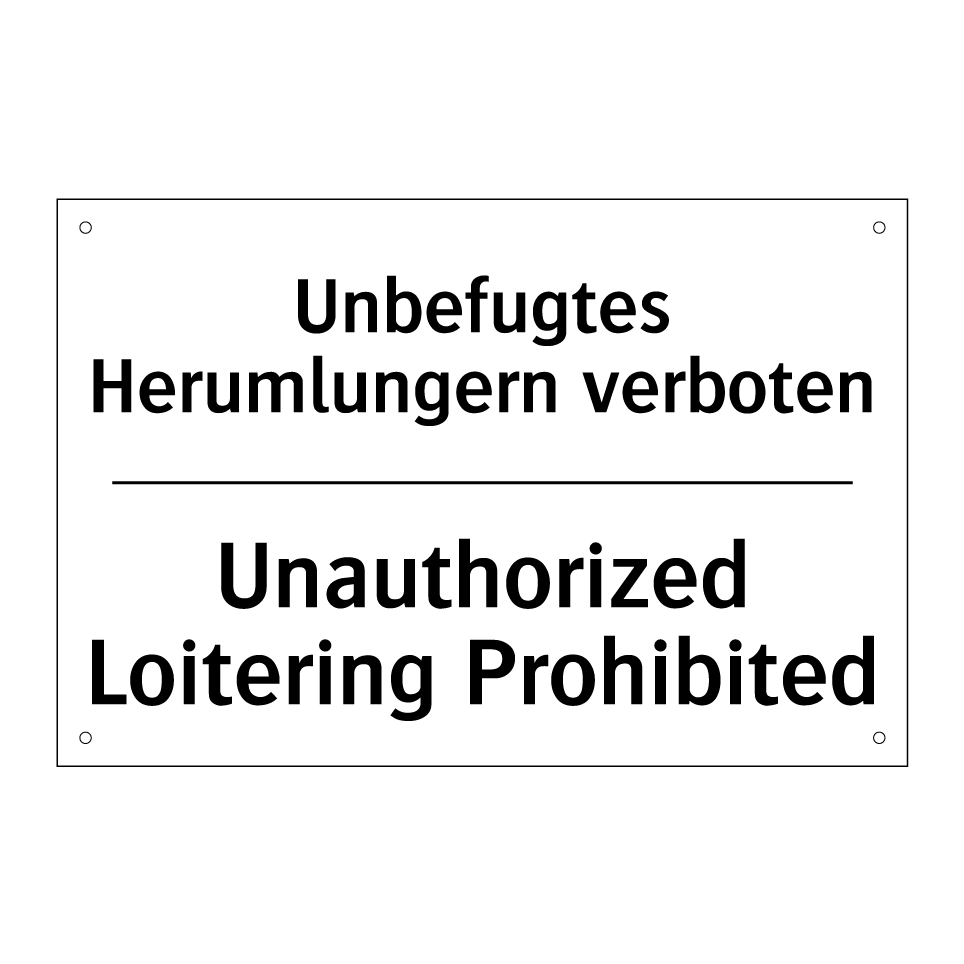 Zweisprachiges Verbotsschild mit deutschem Text Unbefugtes Herumlungern verboten und englischem Text Unauthorized Loitering Prohibited