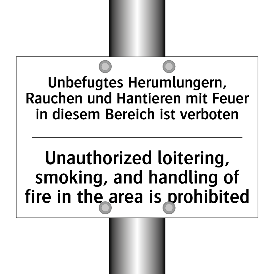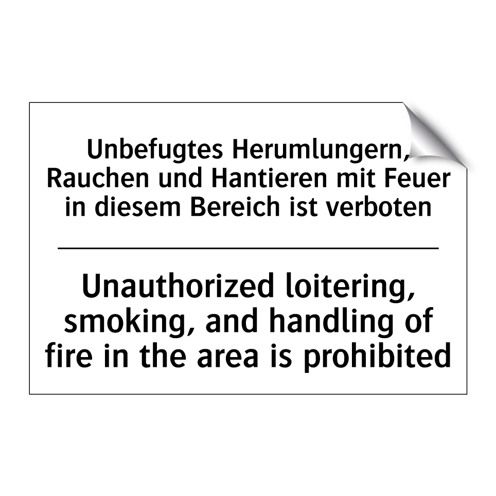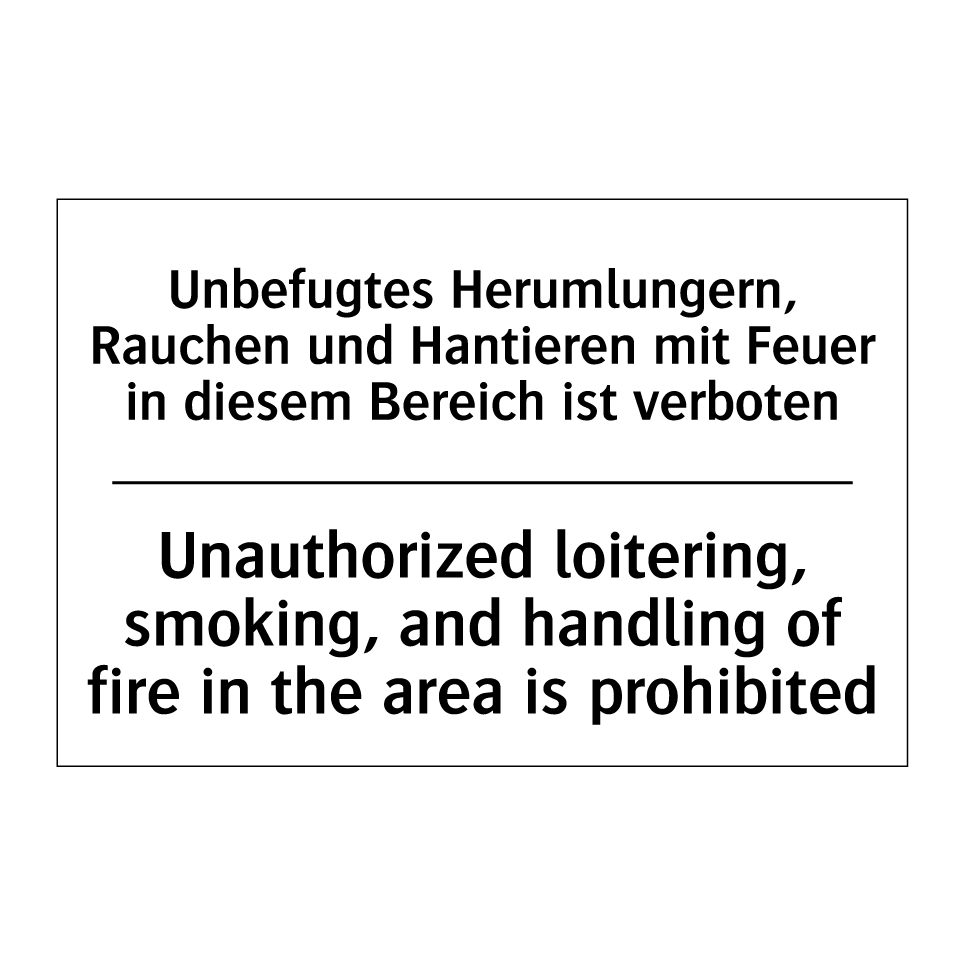 Zweisprachiges Verbotsschild mit deutschem Text Unbefugtes Herumlungern, Rauchen und Hantieren mit Feuer in diesem Bereich ist verboten und englischem Text Unauthorized loitering, smoking, and handling of fire in the area is prohibited