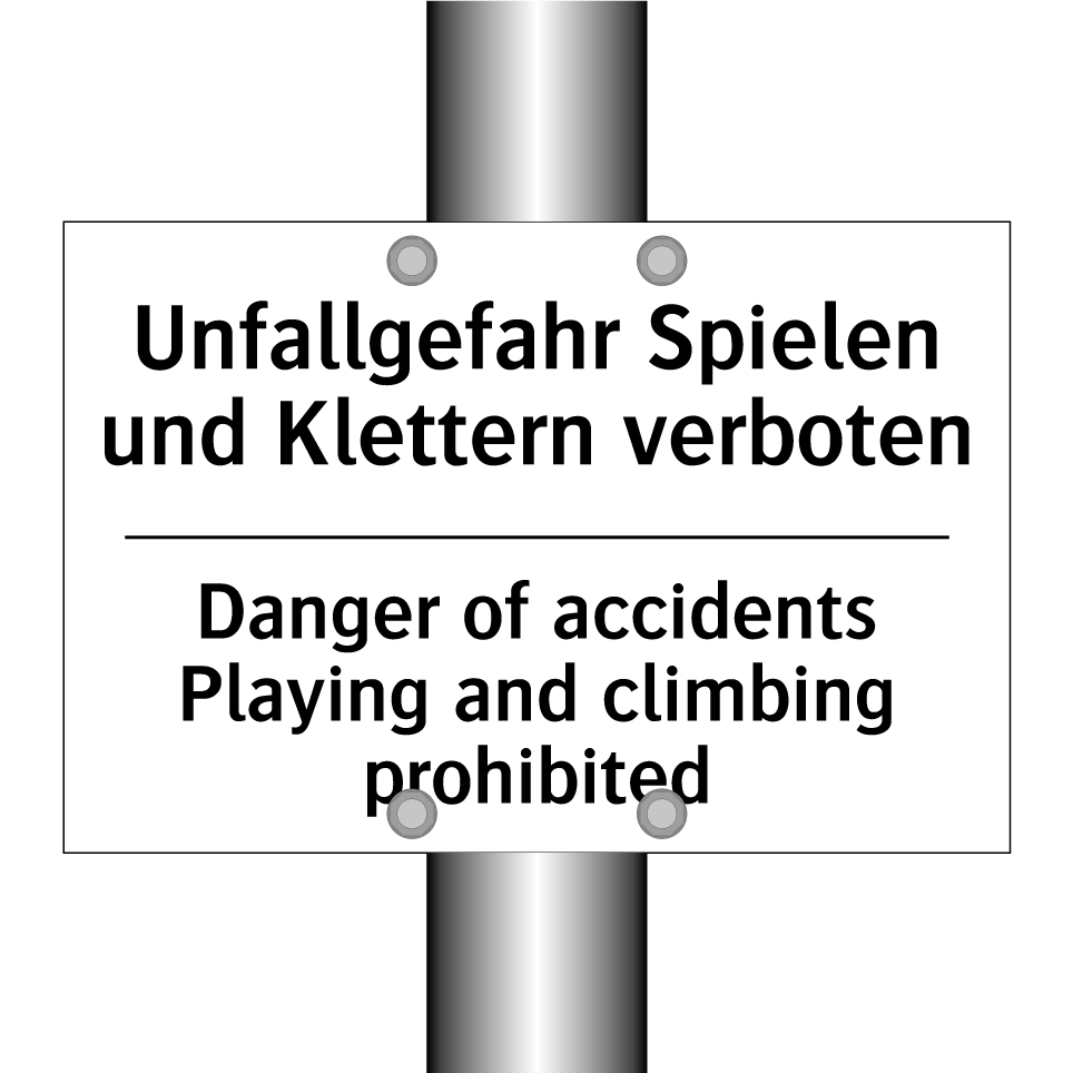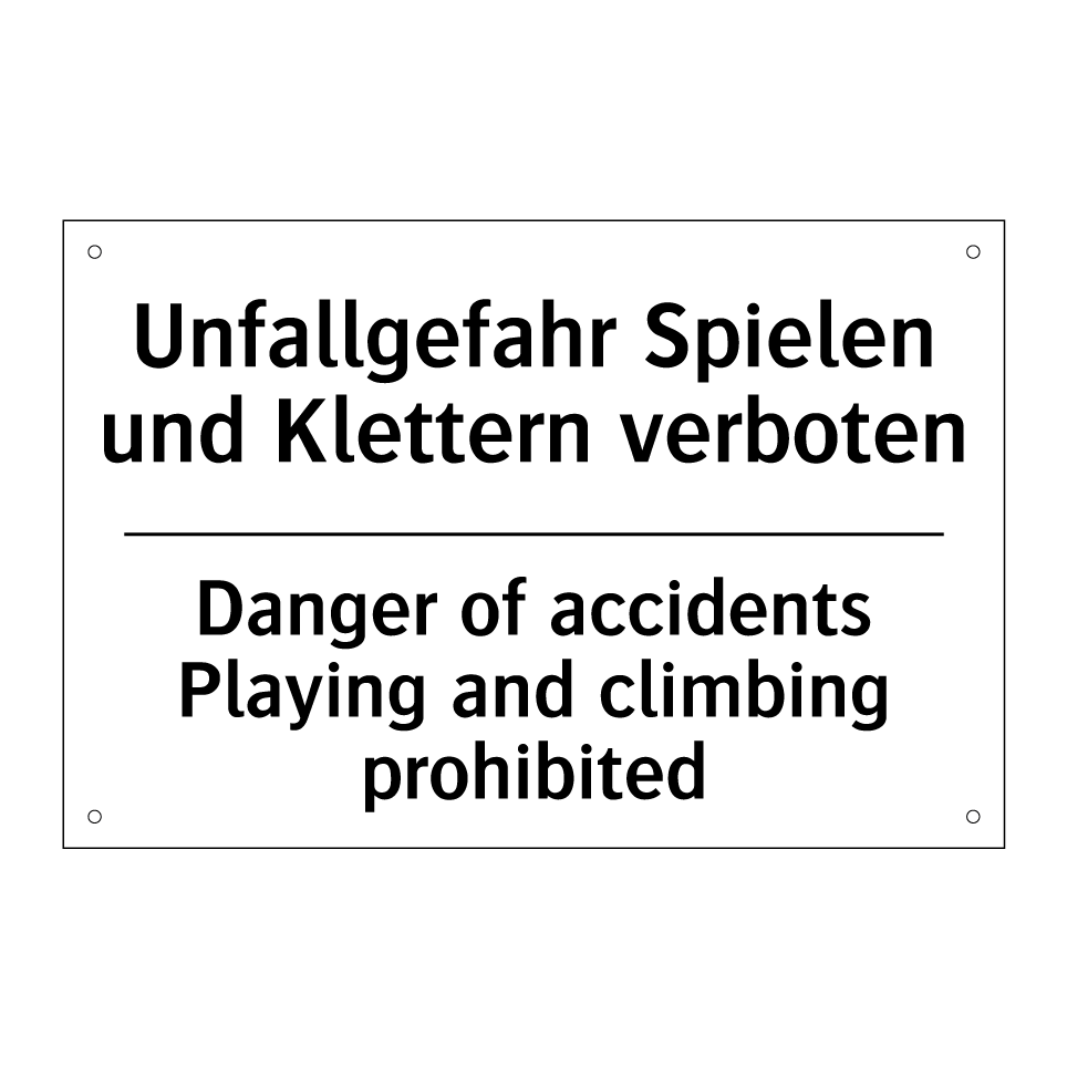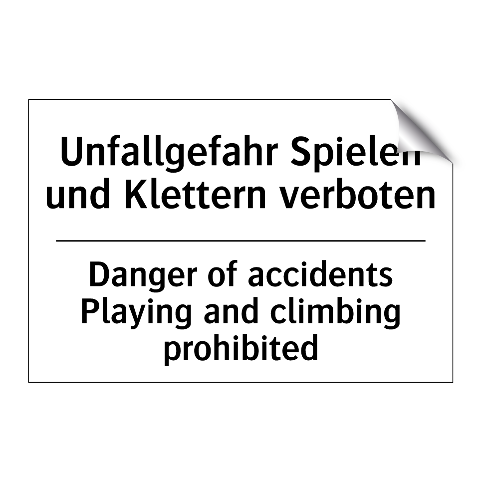 Zweisprachiges Verbotsschild mit deutschem Text Unfallgefahr Spielen und Klettern verboten und englischem Text Danger of accidents Playing and climbing prohibited