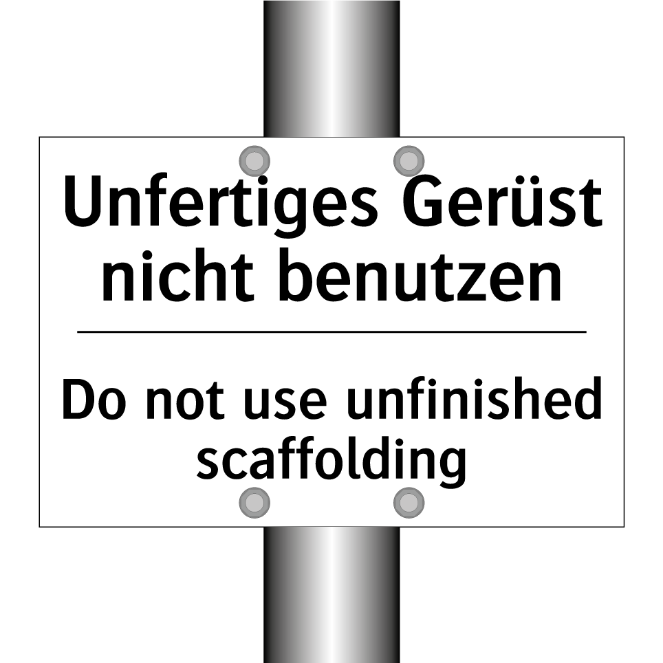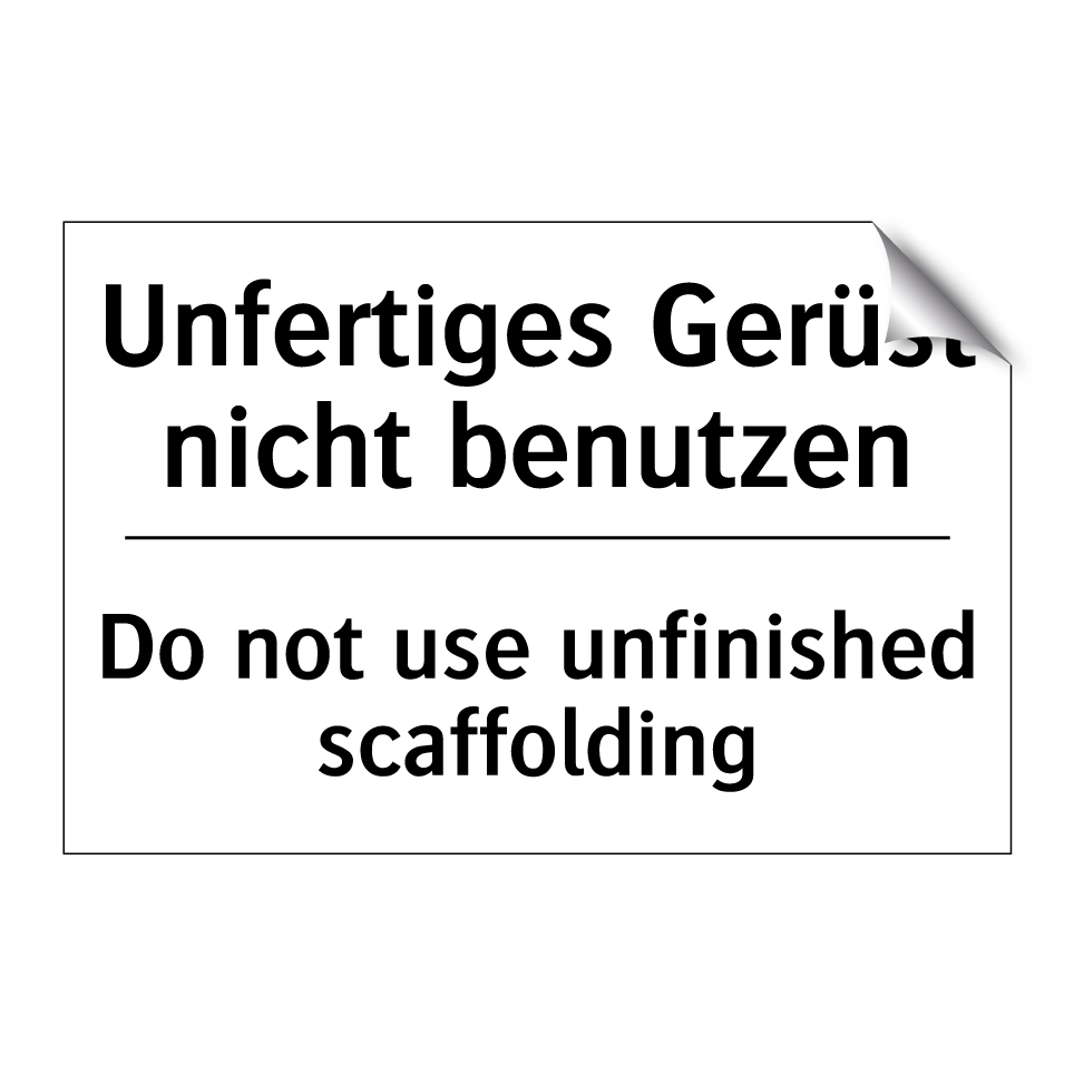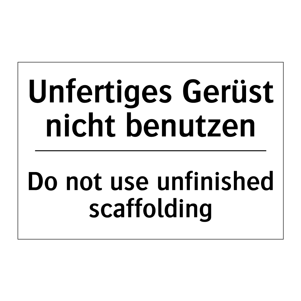 Zweisprachiges Verbotsschild mit deutschem Text Unfertiges Gerüst nicht benutzen und englischem Text Do not use unfinished scaffolding