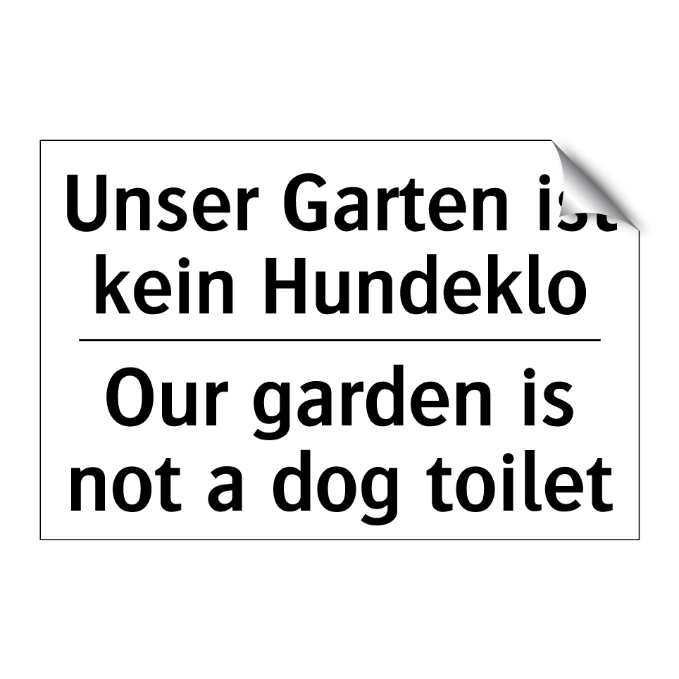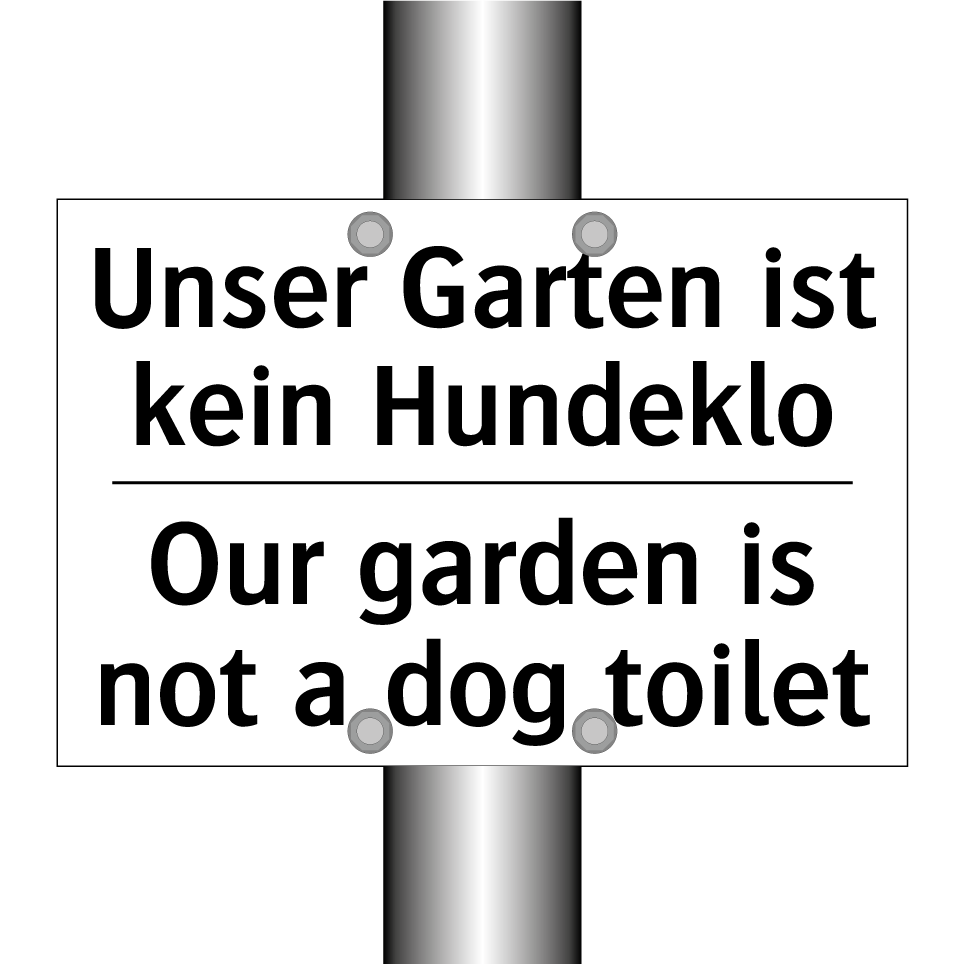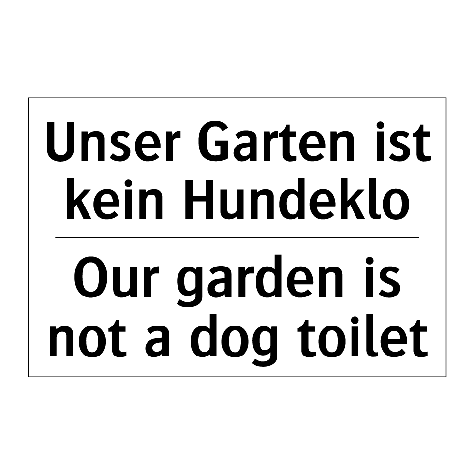 Zweisprachiges Verbotsschild mit deutschem Text Unser Garten ist kein Hundeklo und englischem Text Our garden is not a dog toilet