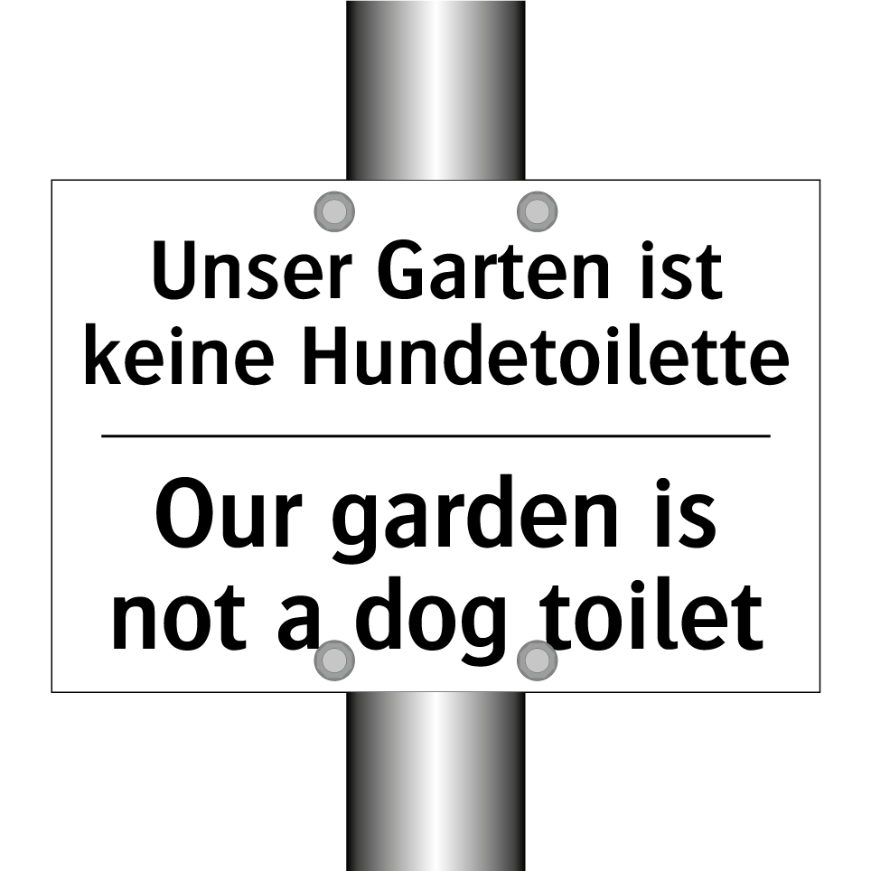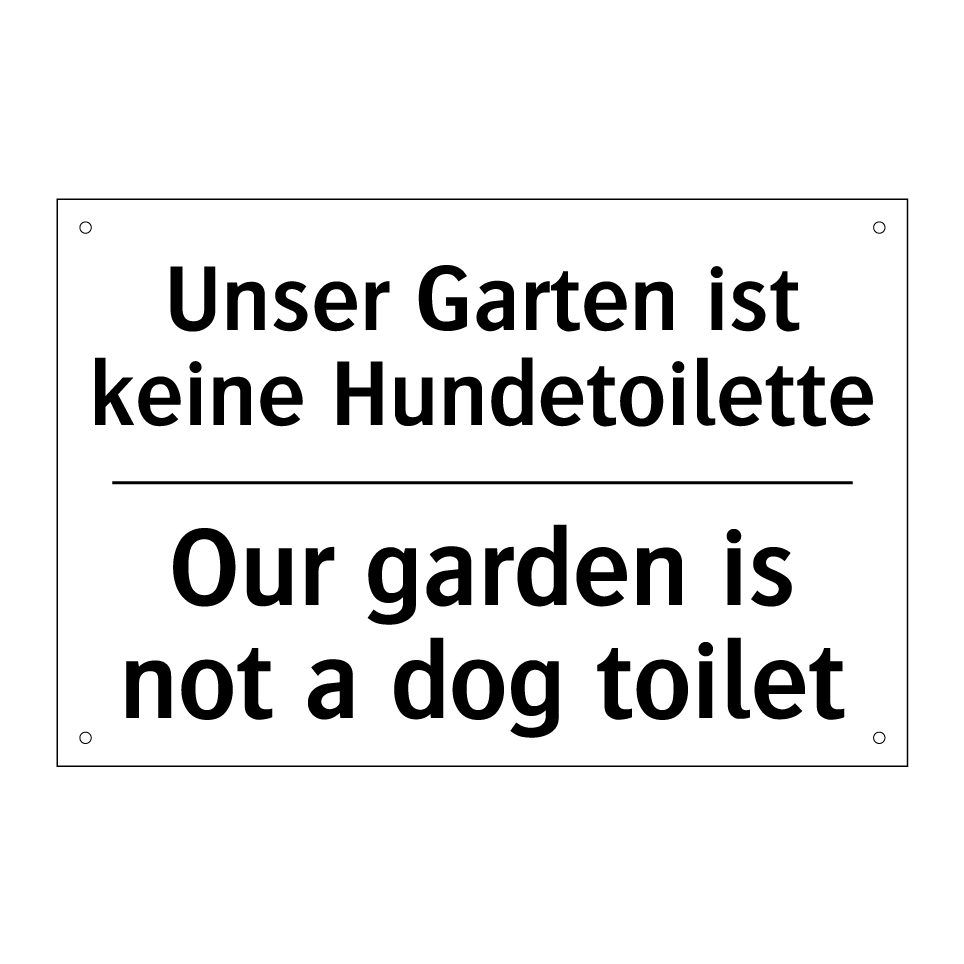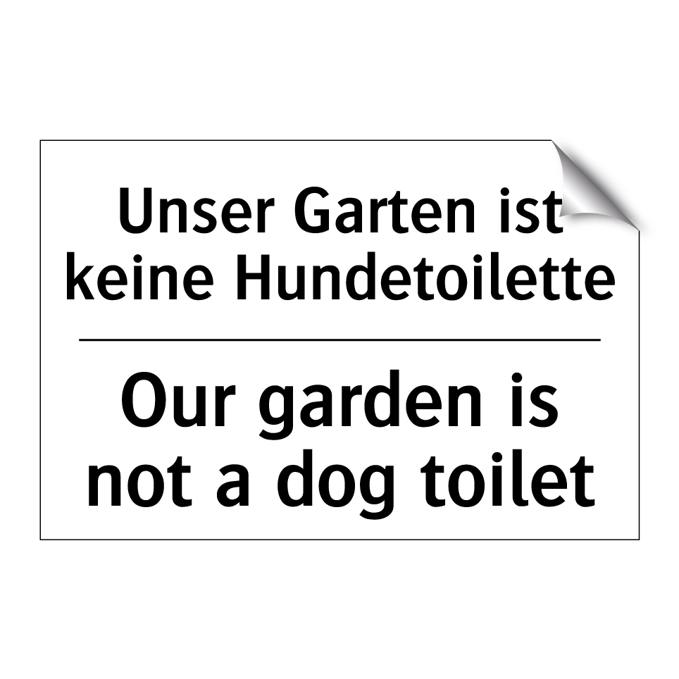 Zweisprachiges Verbotsschild mit deutschem Text Unser Garten ist keine Hundetoilette und englischem Text Our garden is not a dog toilet