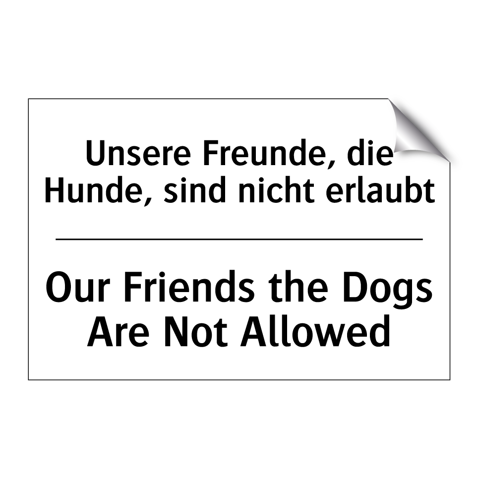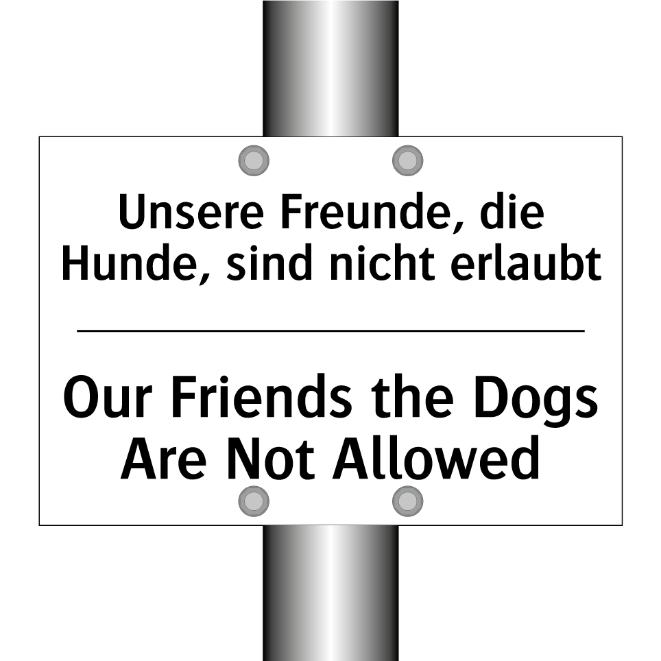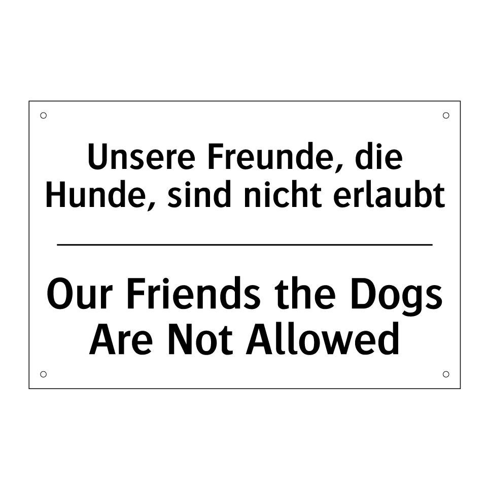 Zweisprachiges Verbotsschild mit deutschem Text Unsere Freunde, die Hunde, sind nicht erlaubt und englischem Text Our Friends the Dogs Are Not Allowed