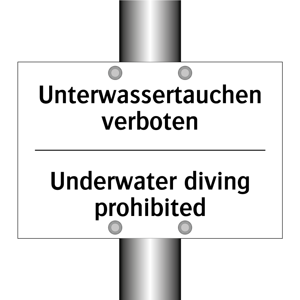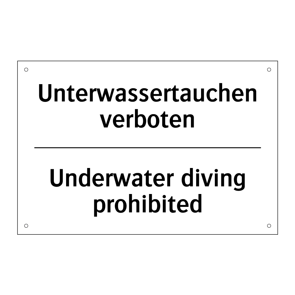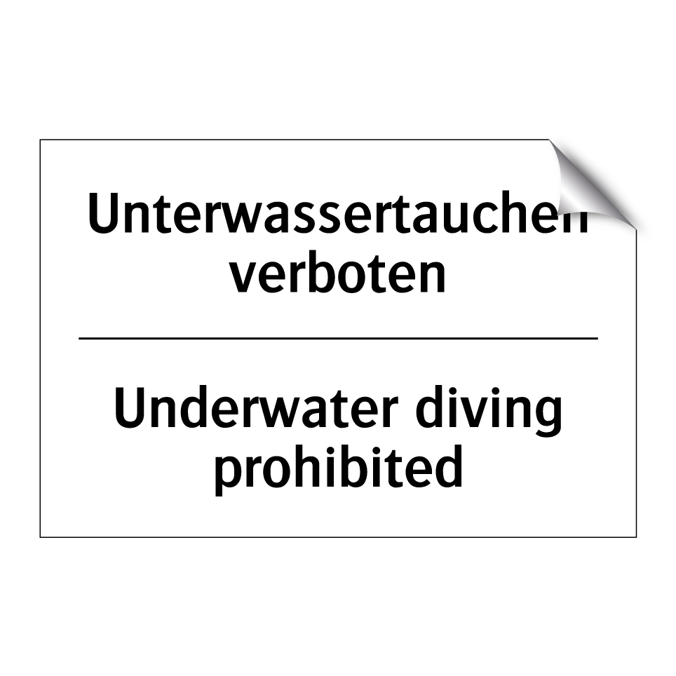 Zweisprachiges Verbotsschild mit deutschem Text Unterwassertauchen verboten und englischem Text Underwater diving prohibited