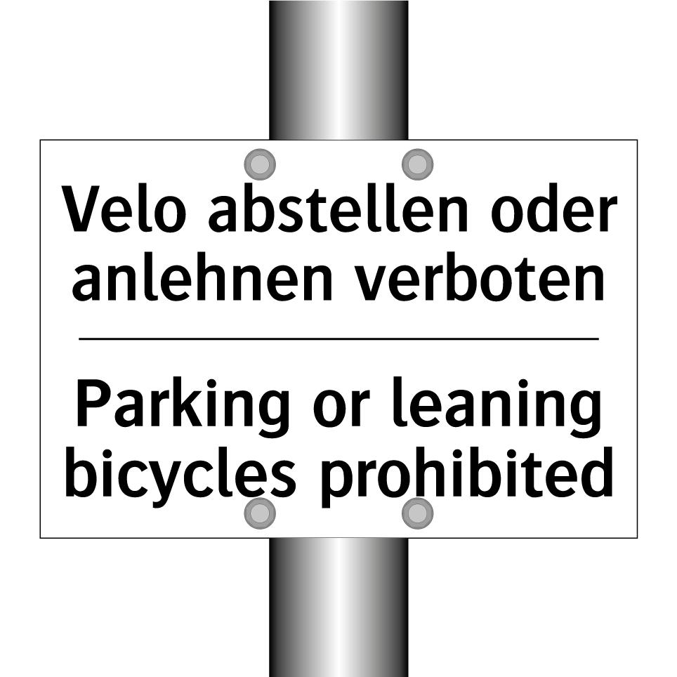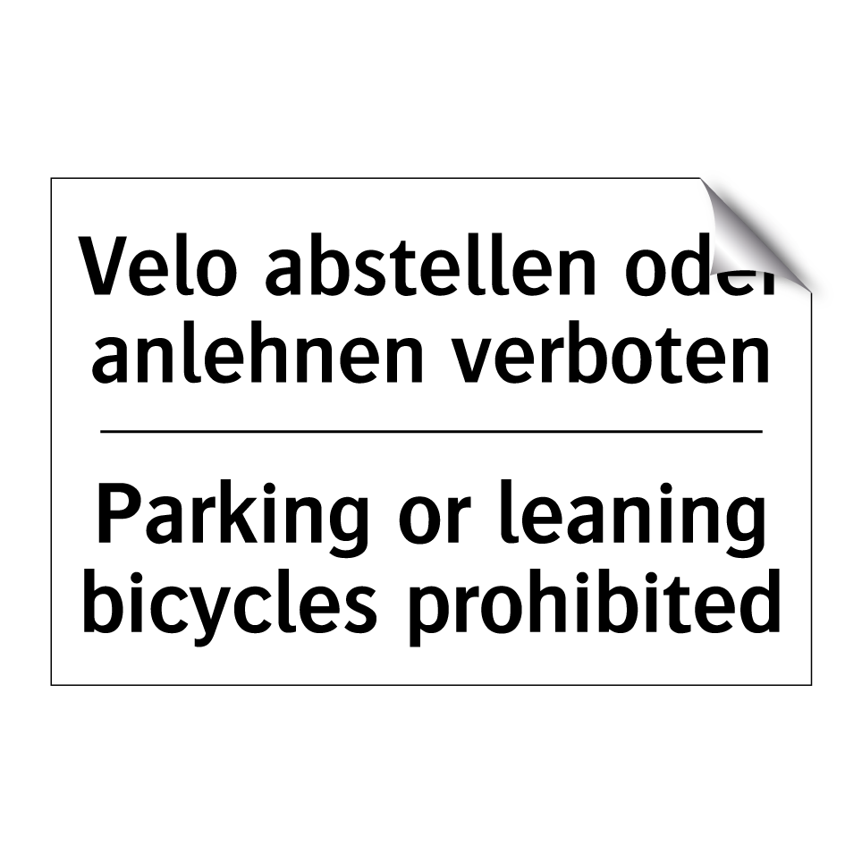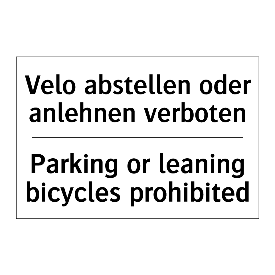 Zweisprachiges Verbotsschild mit deutschem Text Velo abstellen oder anlehnen verboten und englischem Text Parking or leaning bicycles prohibited