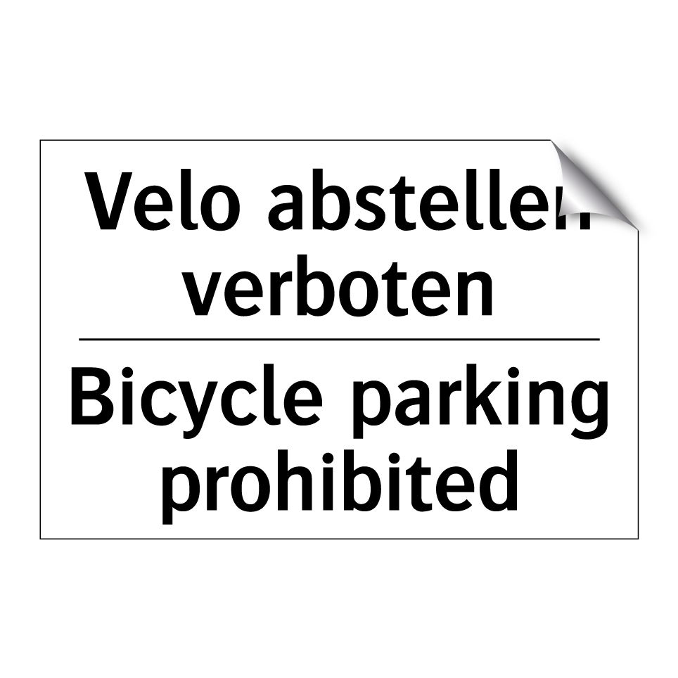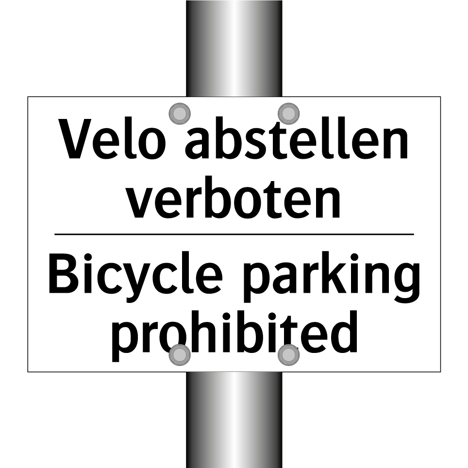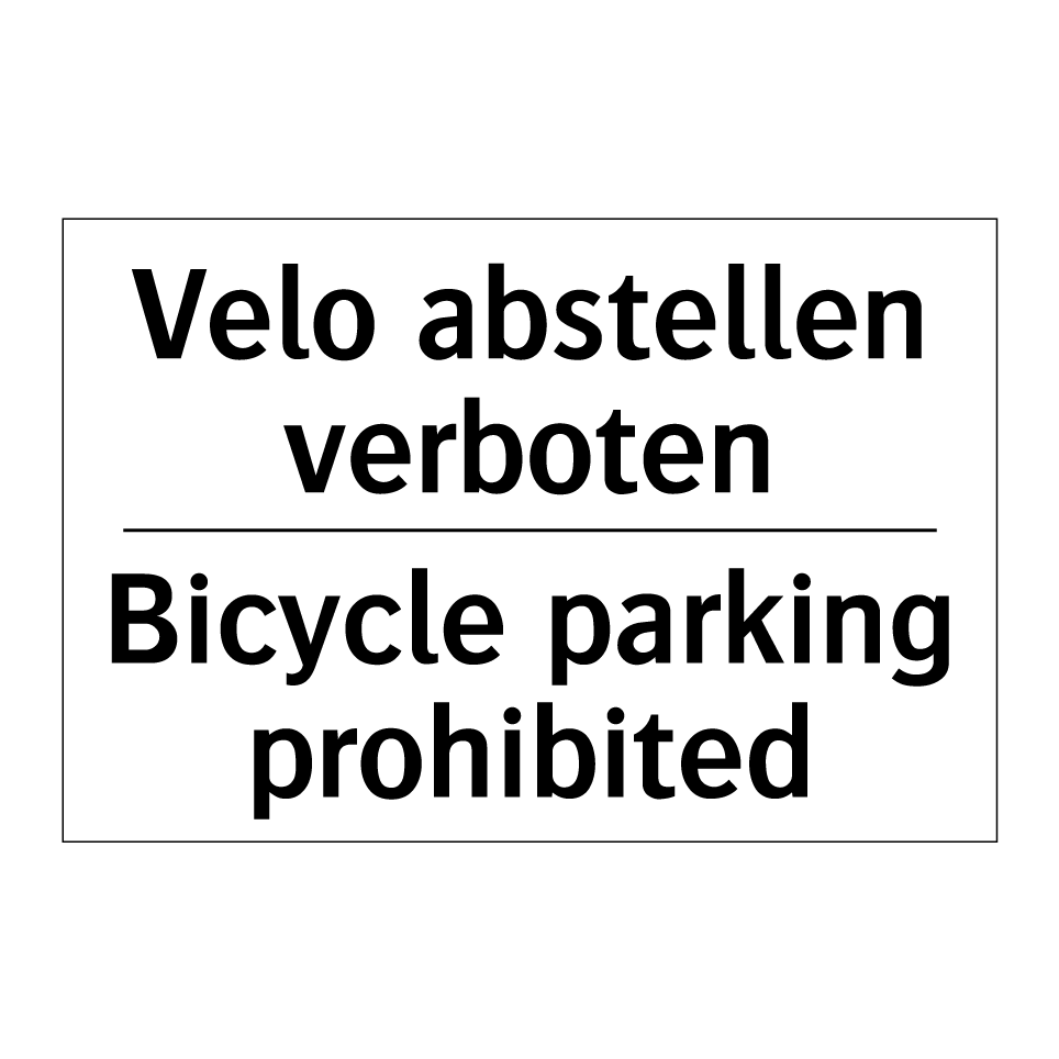Zweisprachiges Verbotsschild mit deutschem Text Velo abstellen verboten und englischem Text Bicycle parking prohibited