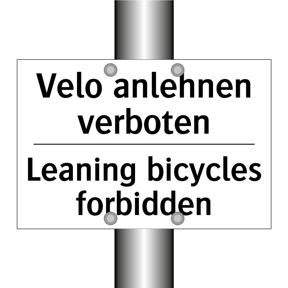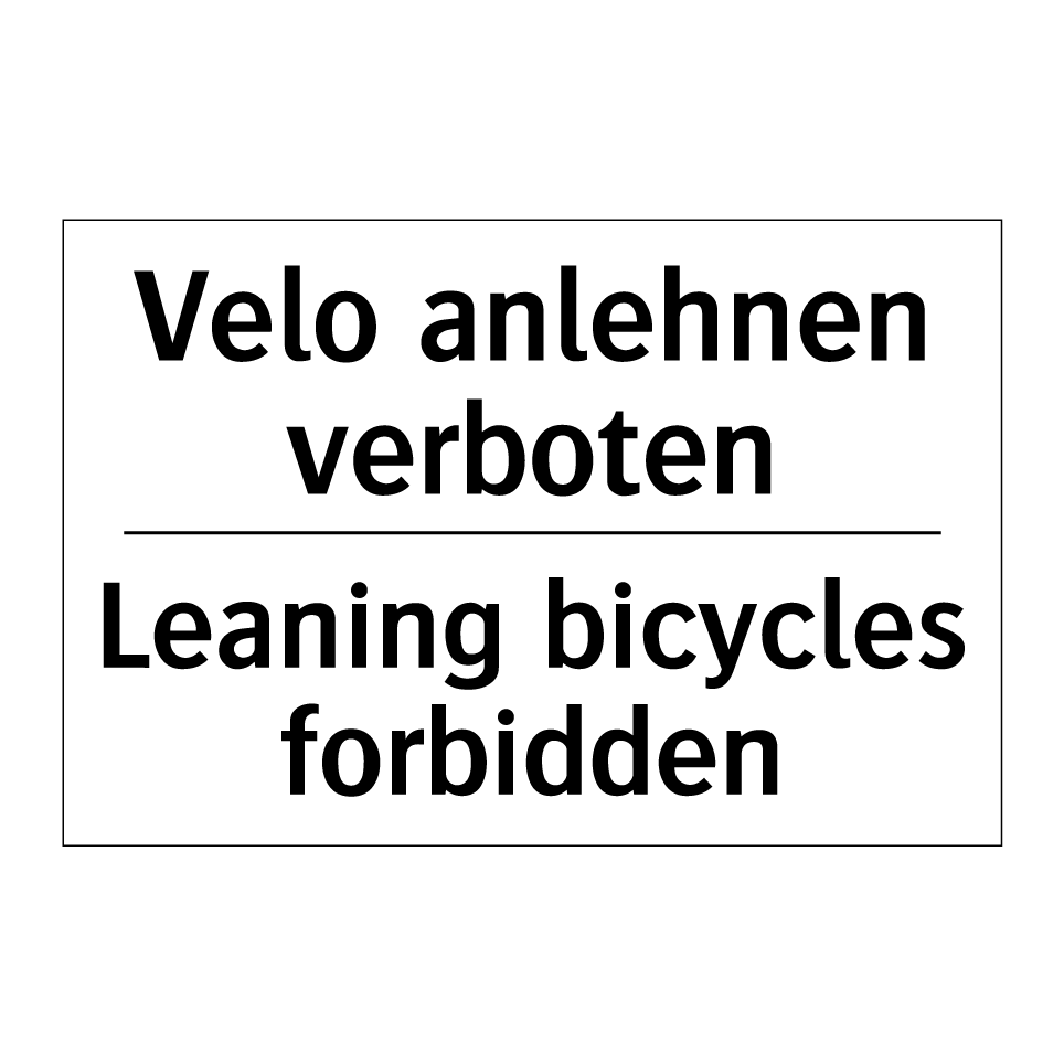 Zweisprachiges Verbotsschild mit deutschem Text Velo anlehnen verboten und englischem Text Leaning bicycles forbidden