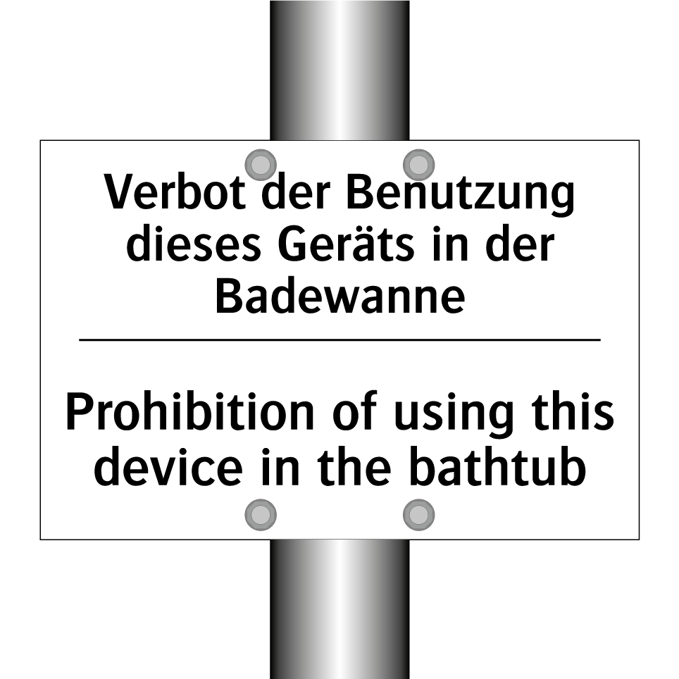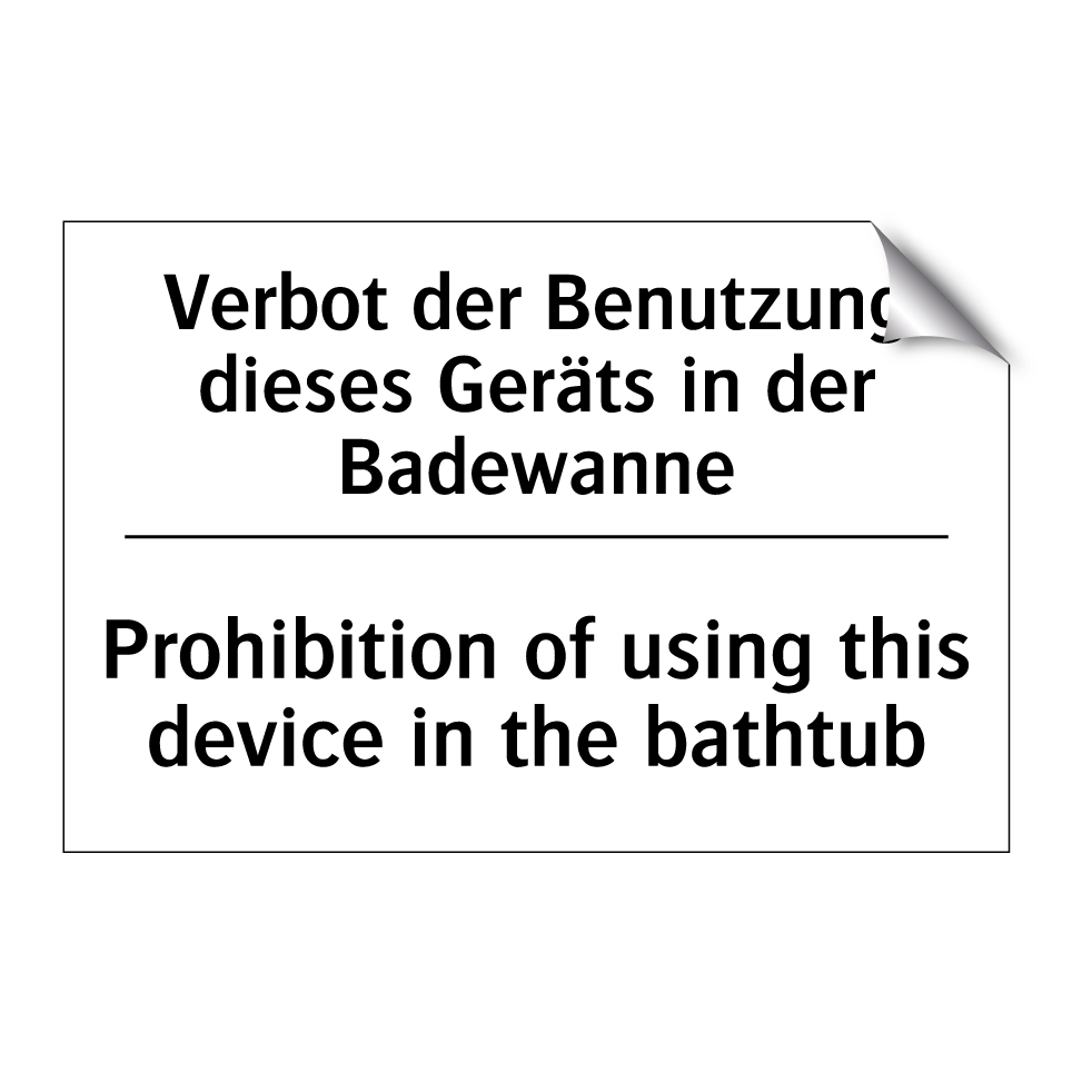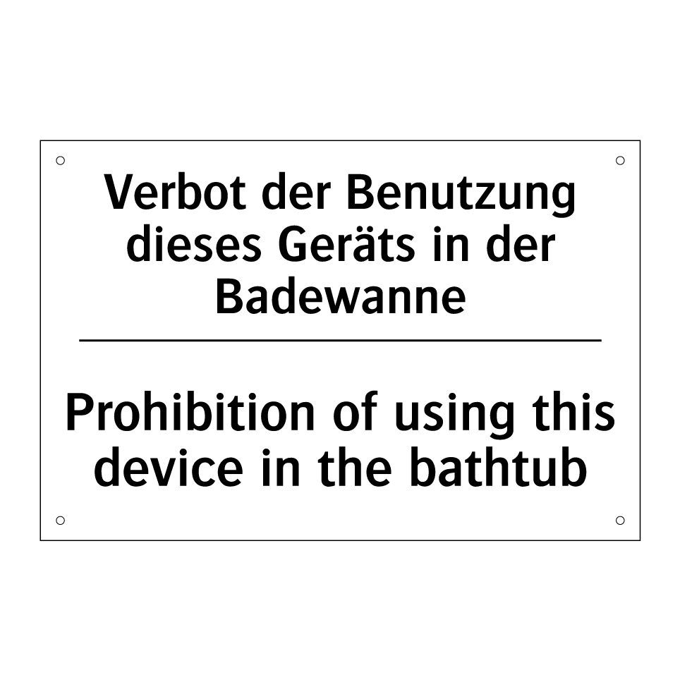 Zweisprachiges Verbotsschild mit deutschem Text Verbot der Benutzung dieses Geräts in der Badewanne und englischem Text Prohibition of using this device in the bathtub