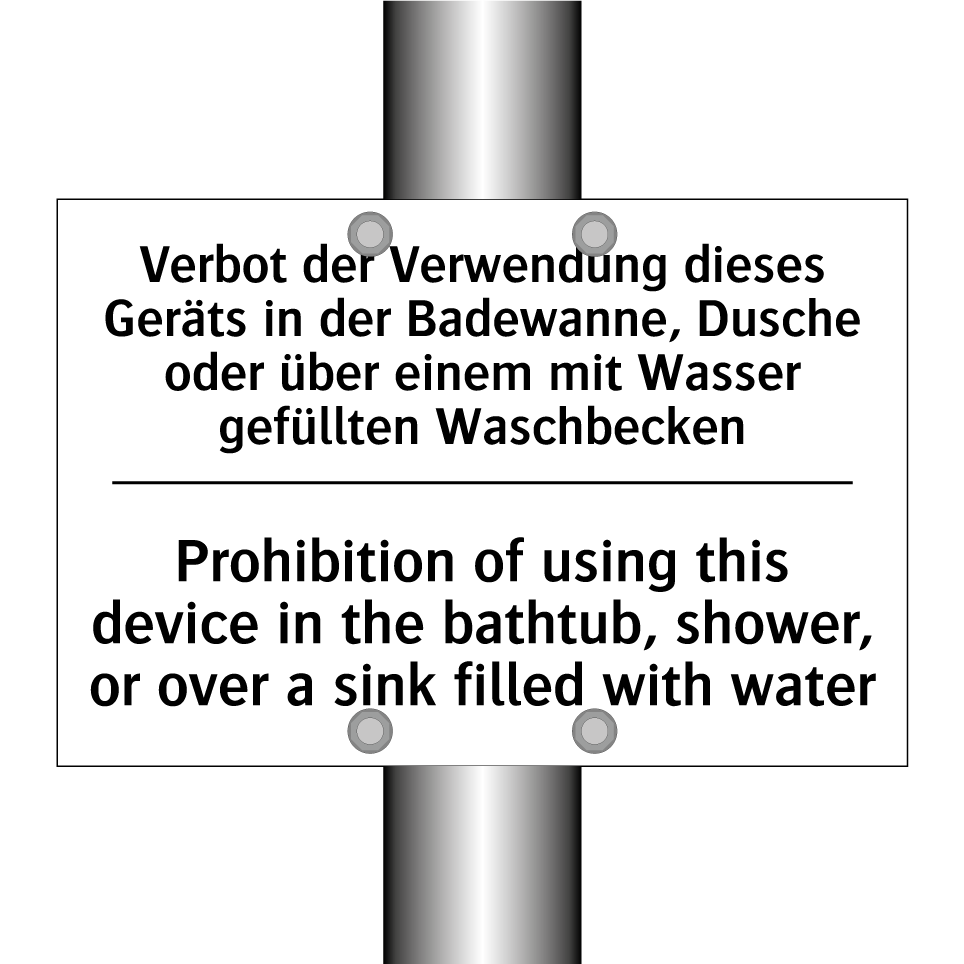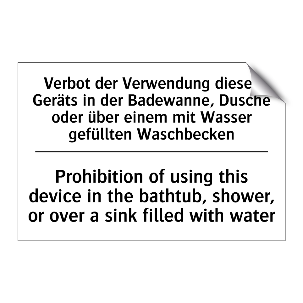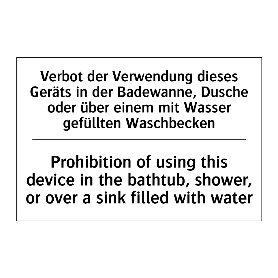 Zweisprachiges Verbotsschild mit deutschem Text Verbot der Verwendung dieses Geräts in der Badewanne, Dusche oder über einem mit Wasser gefüllten Waschbecken und englischem Text Prohibition of using this device in the bathtub, shower, or over a sink filled with water