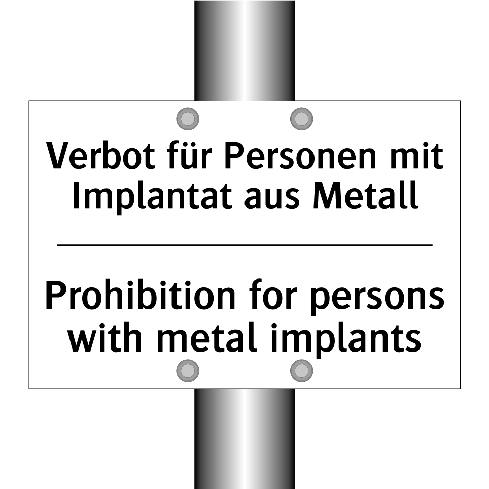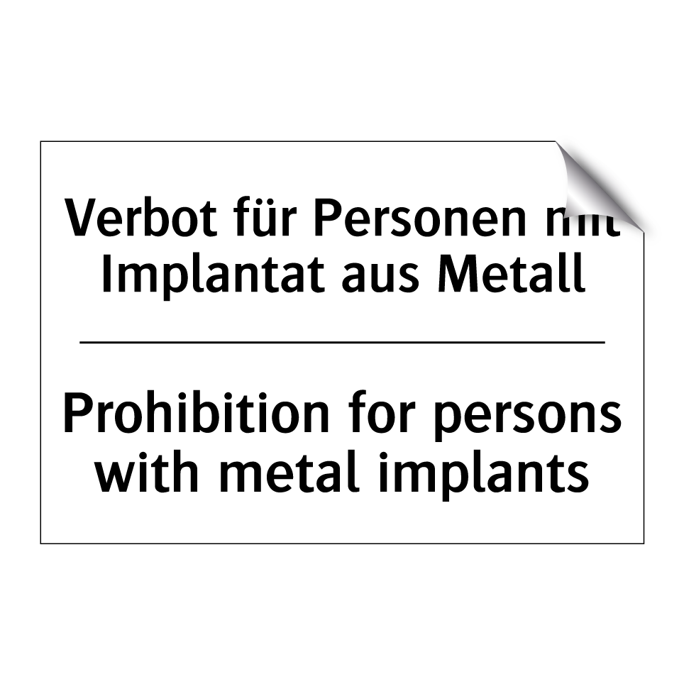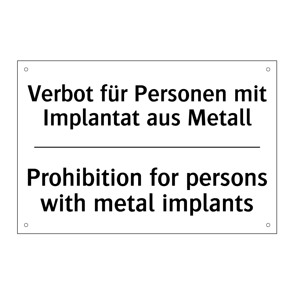 Zweisprachiges Verbotsschild mit deutschem Text Verbot für Personen mit Implantat aus Metall und englischem Text Prohibition for persons with metal implants