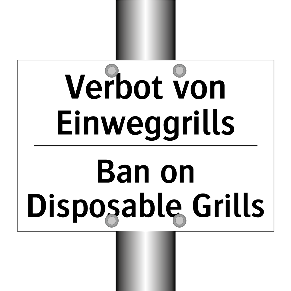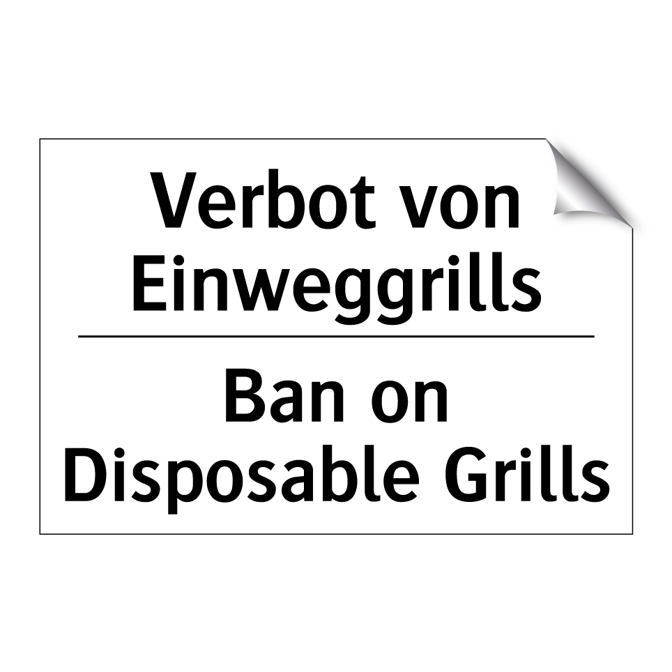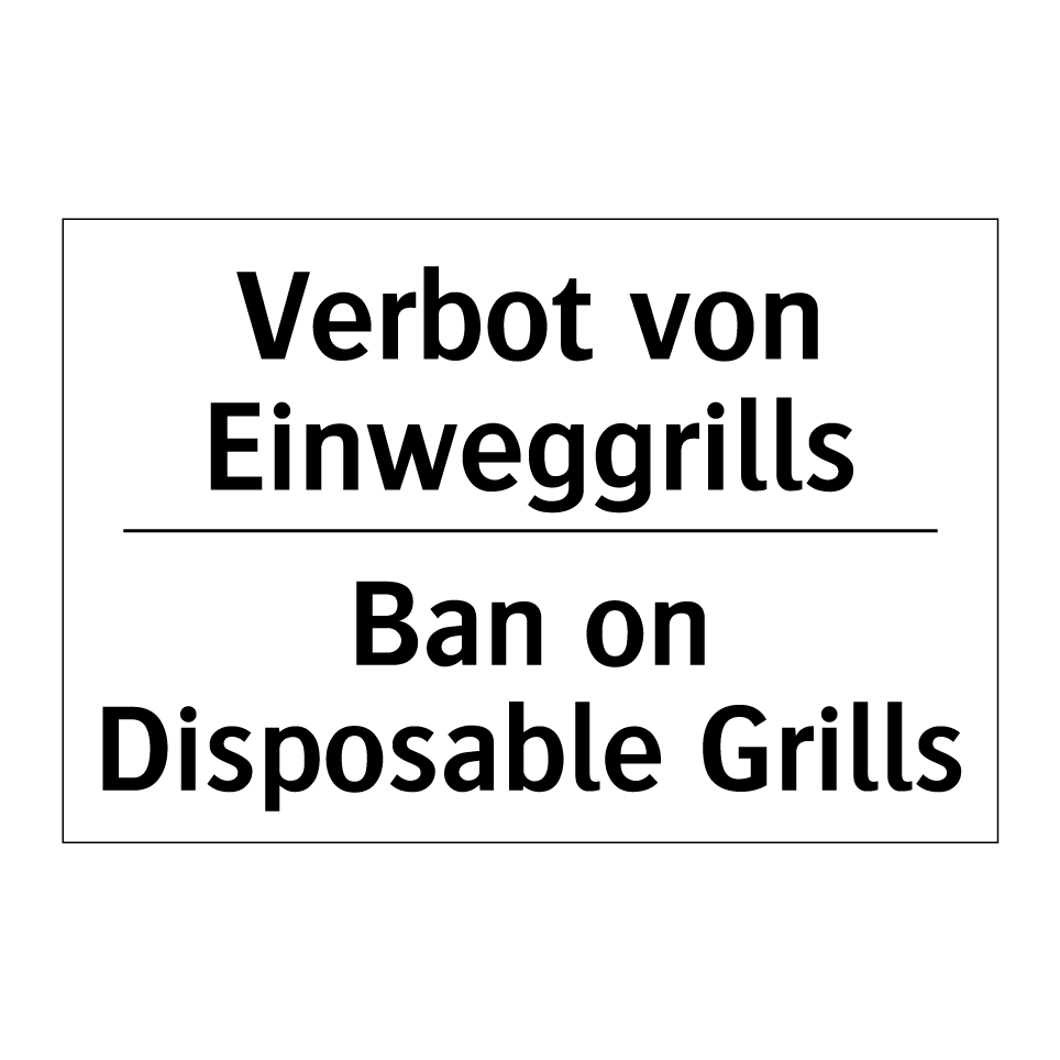 Zweisprachiges Verbotsschild mit deutschem Text Verbot von Einweggrills und englischem Text Ban on Disposable Grills