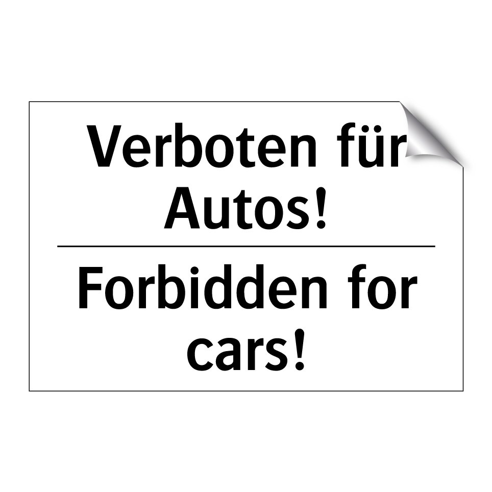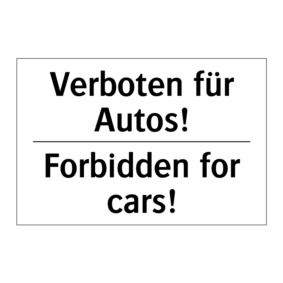 Zweisprachiges Verbotsschild mit deutschem Text Verboten für Autos! und englischem Text Forbidden for cars!