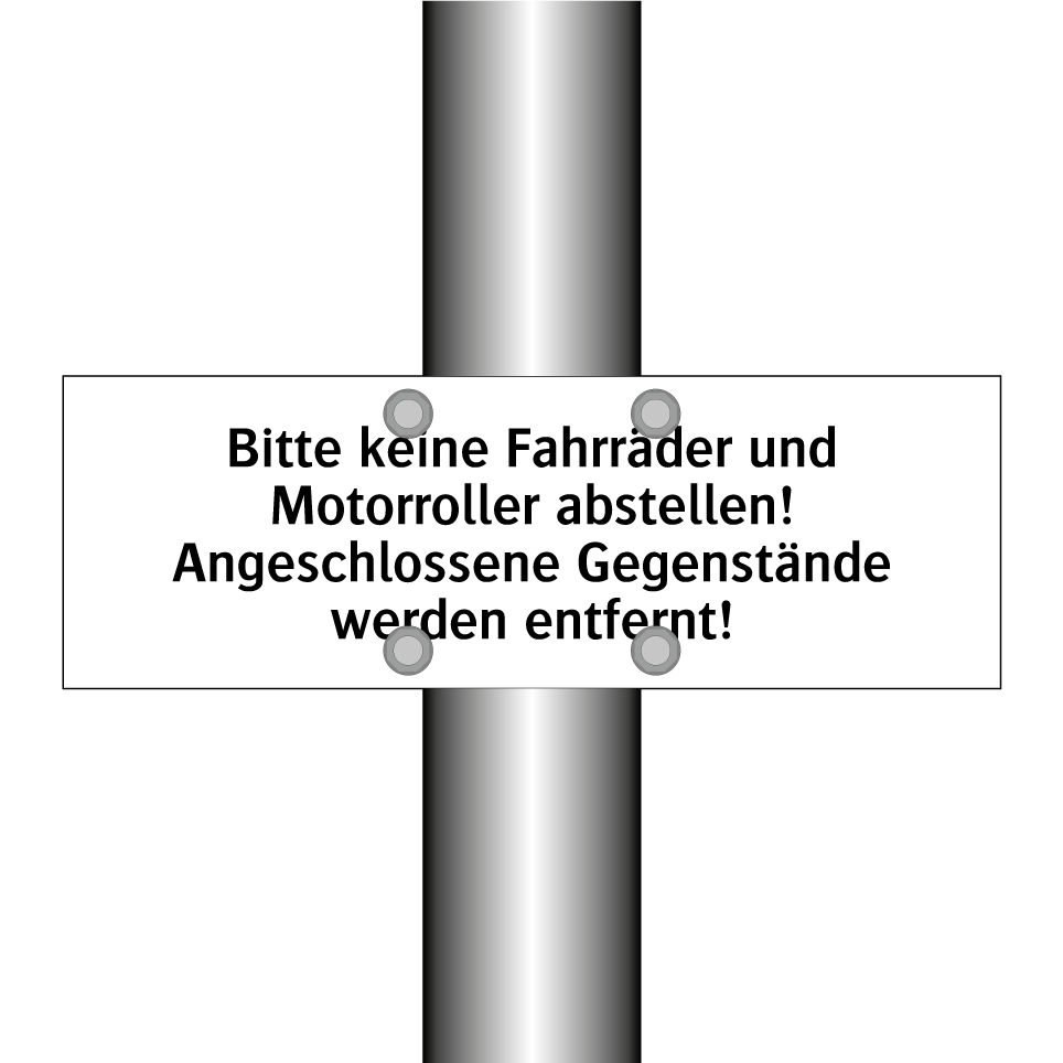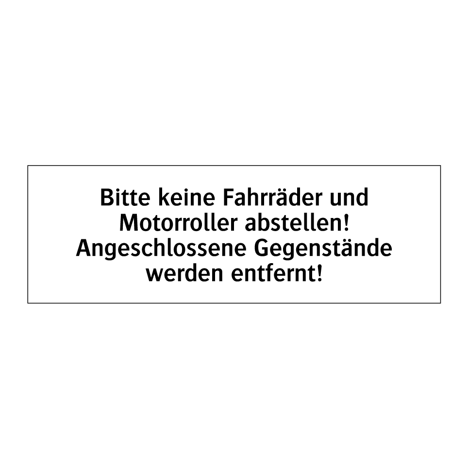 Verbotsschild mit dem Text Bitte keine Fahrräder und Motorroller abstellen! Angeschlossene Gegenstände werden entfernt!