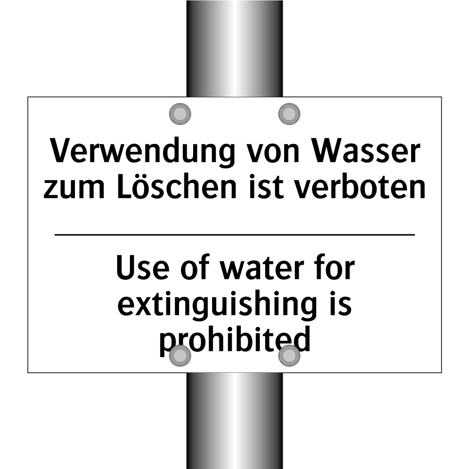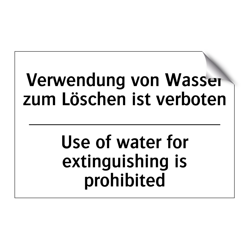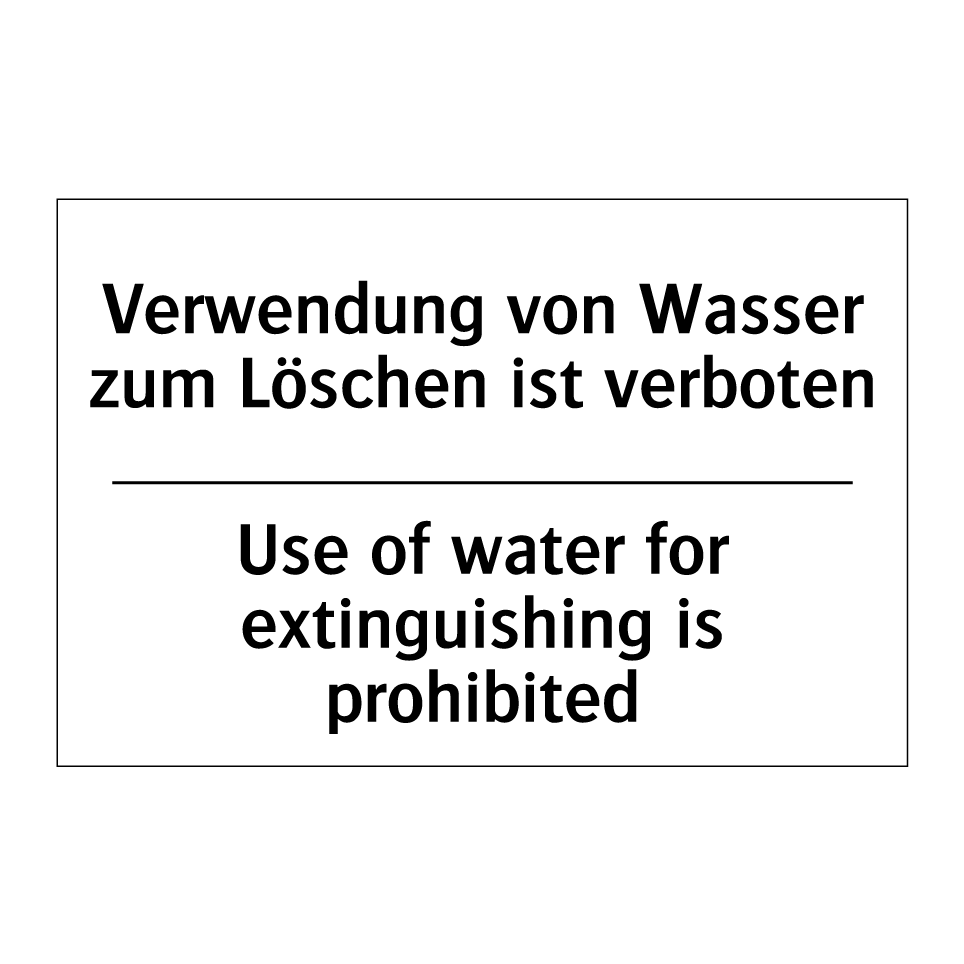 Zweisprachiges Verbotsschild mit deutschem Text Verwendung von Wasser zum Löschen ist verboten und englischem Text Use of water for extinguishing is prohibited