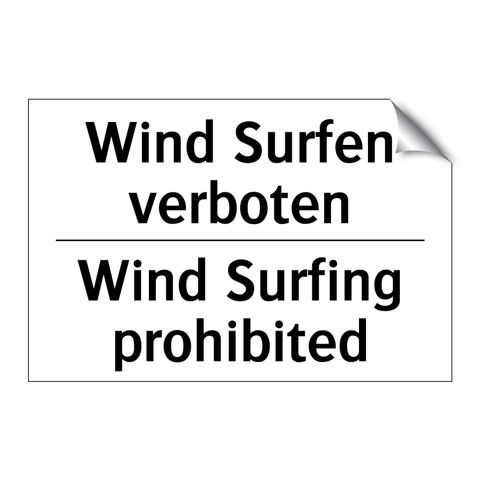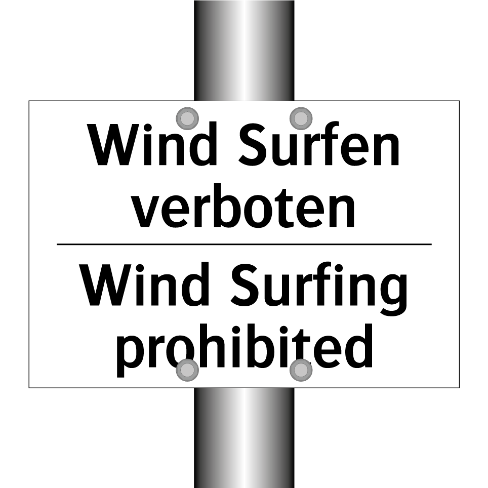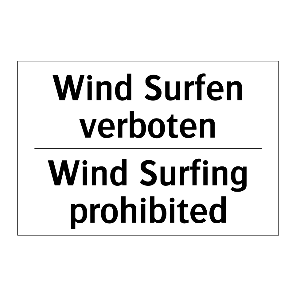 Zweisprachiges Verbotsschild mit deutschem Text Wind Surfen verboten und englischem Text Wind Surfing prohibited