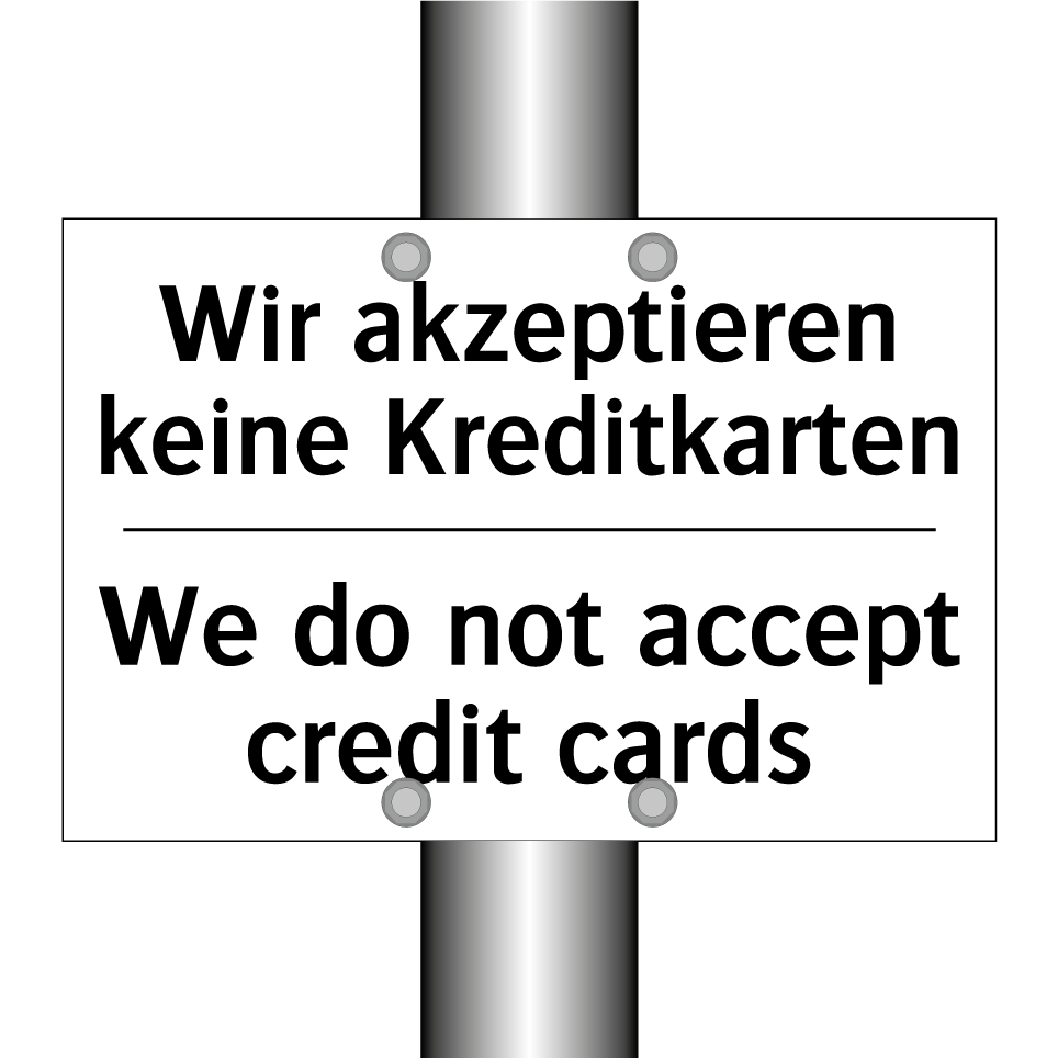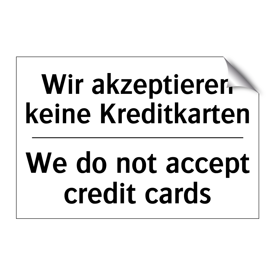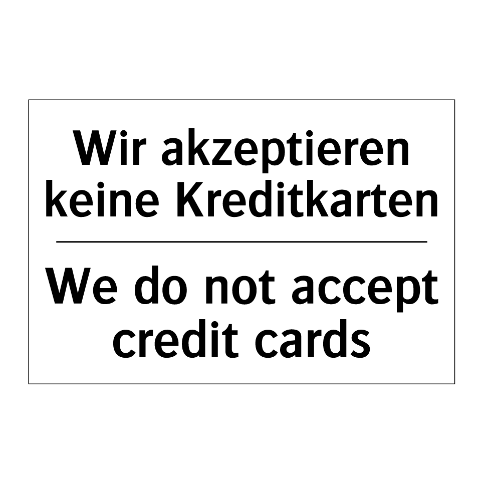 Zweisprachiges Verbotsschild mit deutschem Text Wir akzeptieren keine Kreditkarten und englischem Text We do not accept credit cards