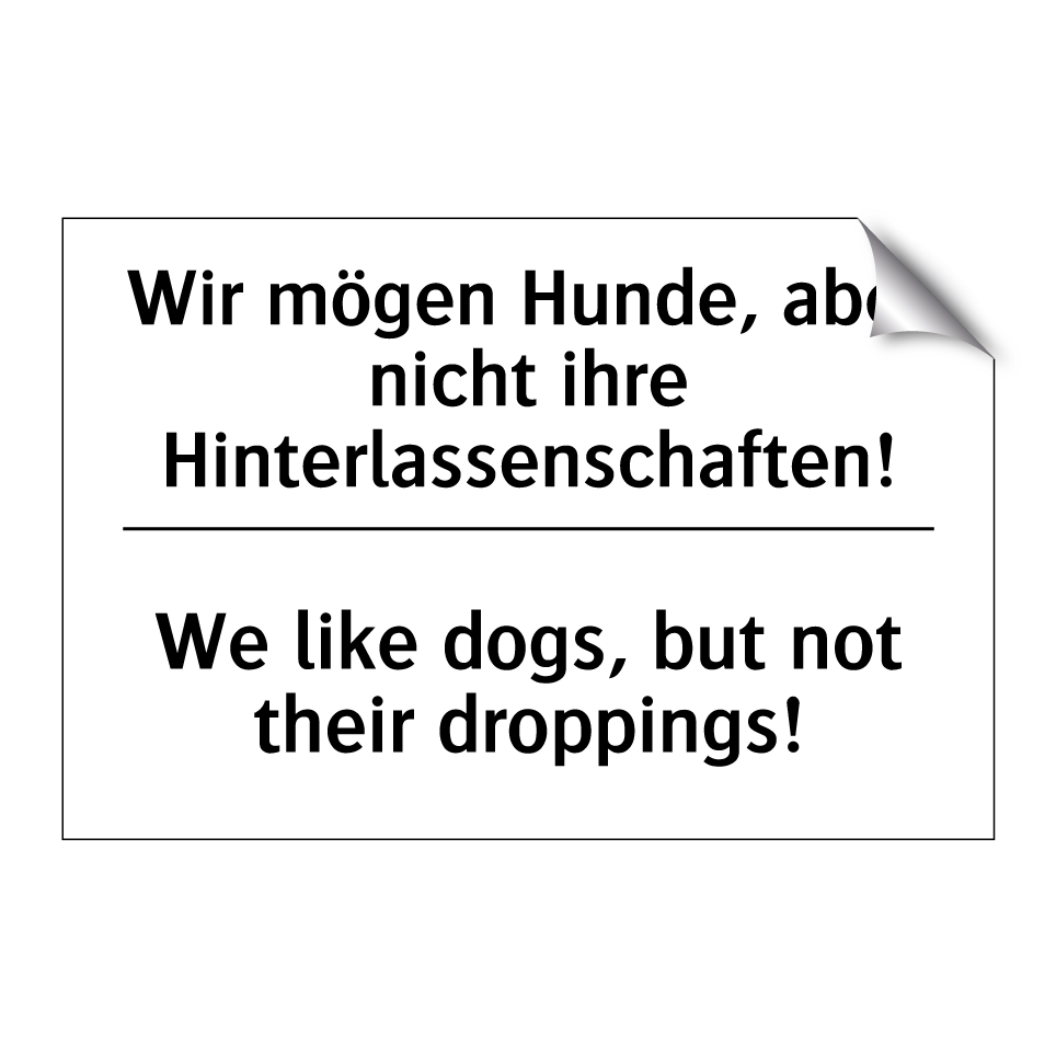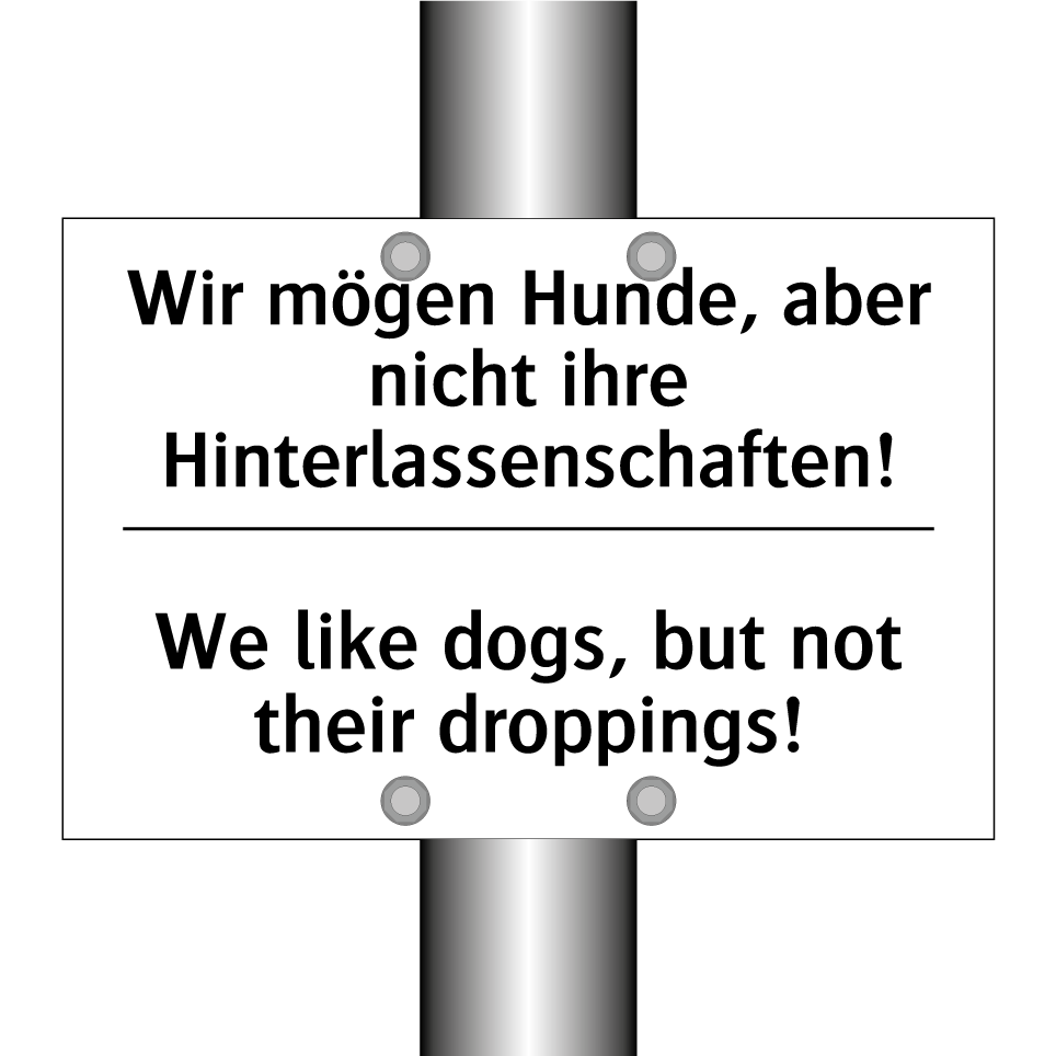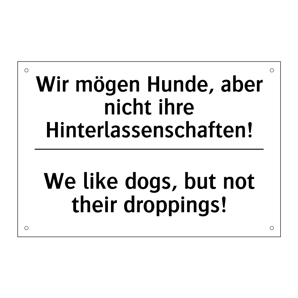 Zweisprachiges Verbotsschild mit deutschem Text Wir mögen Hunde, aber nicht ihre Hinterlassenschaften! und englischem Text We like dogs, but not their droppings!