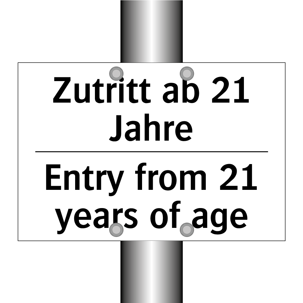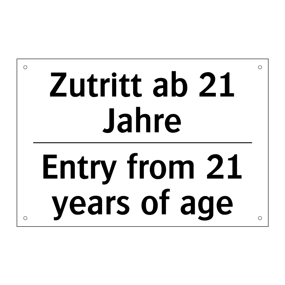 Zweisprachiges Verbotsschild mit deutschem Text Zutritt ab 21 Jahre und englischem Text Entry from 21 years of age