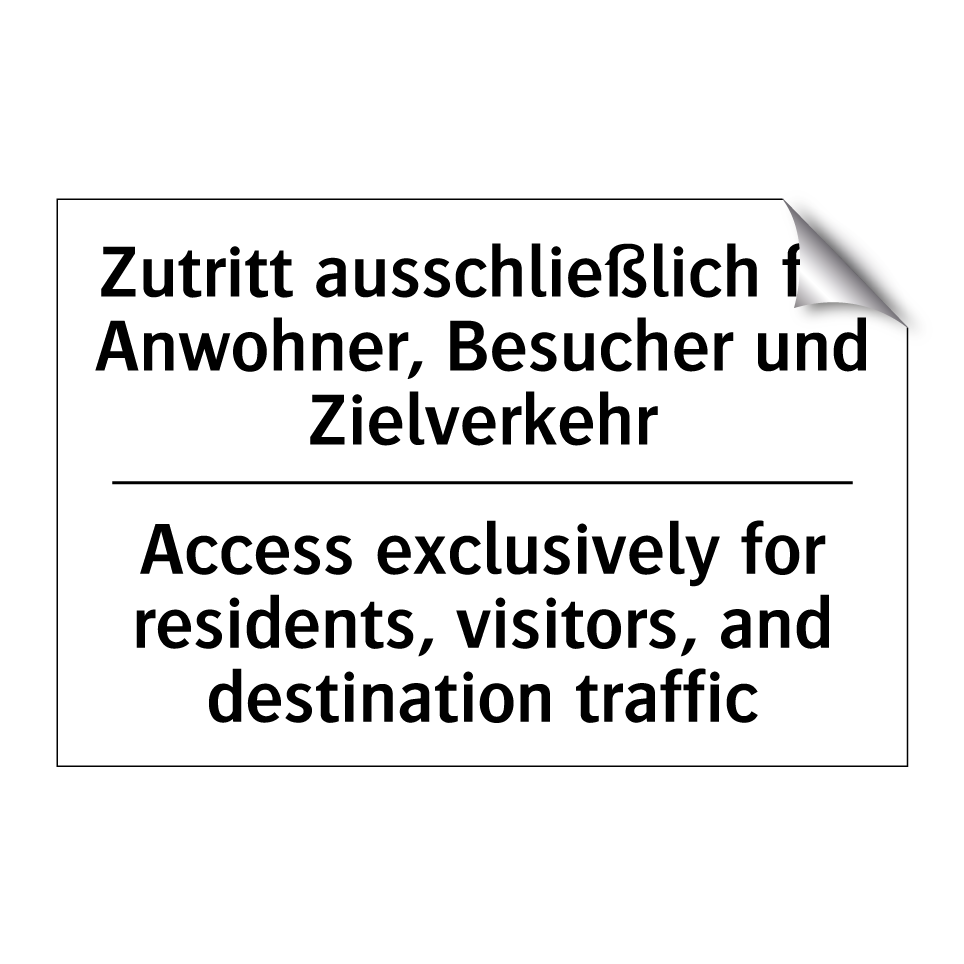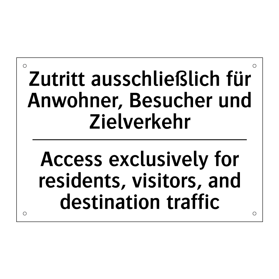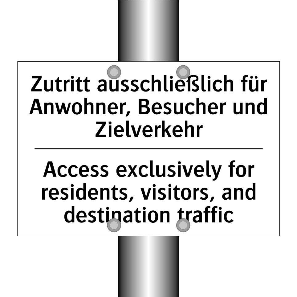 Zweisprachiges Verbotsschild mit deutschem Text Zutritt ausschließlich für Anwohner, Besucher und Zielverkehr und englischem Text Access exclusively for residents, visitors, and destination traffic