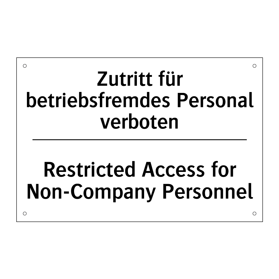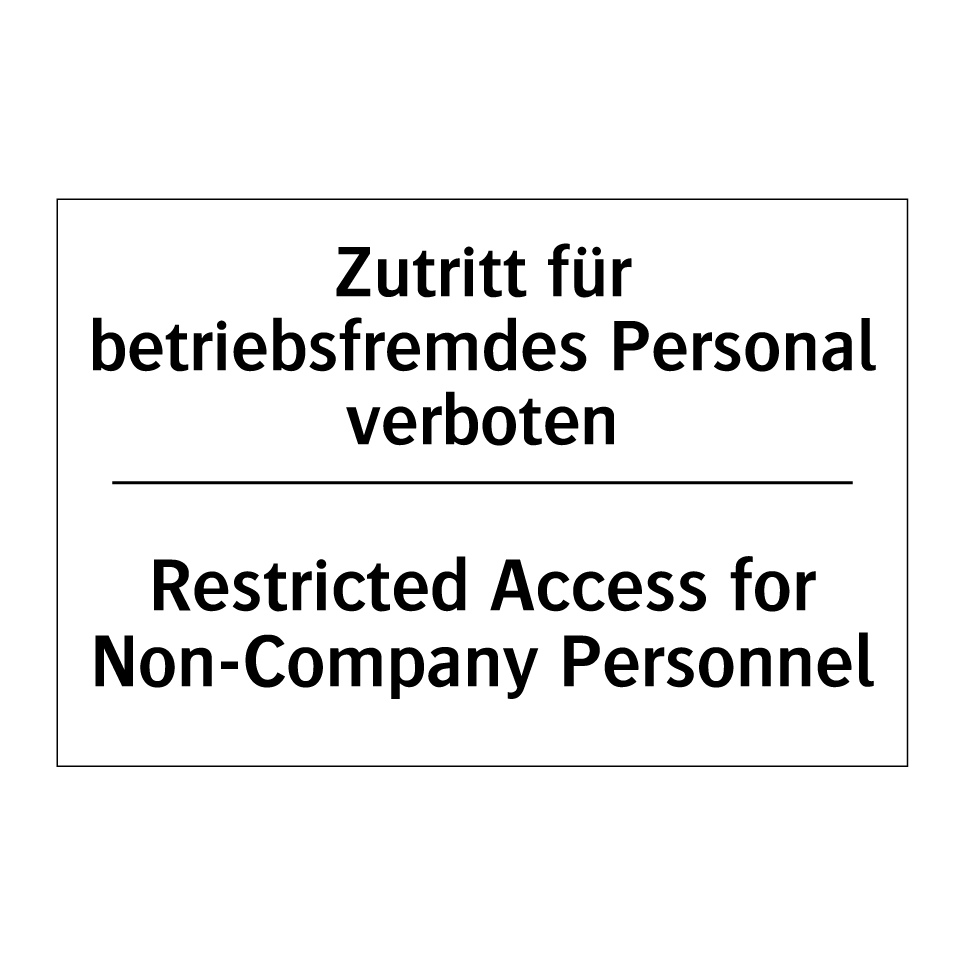 Zweisprachiges Verbotsschild mit deutschem Text Zutritt für betriebsfremdes Personal verboten und englischem Text Restricted Access for Non-Company Personnel