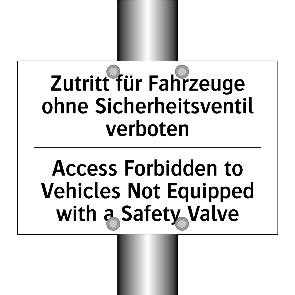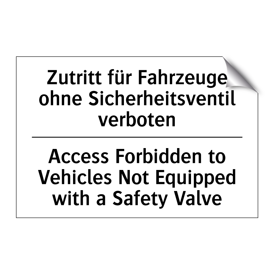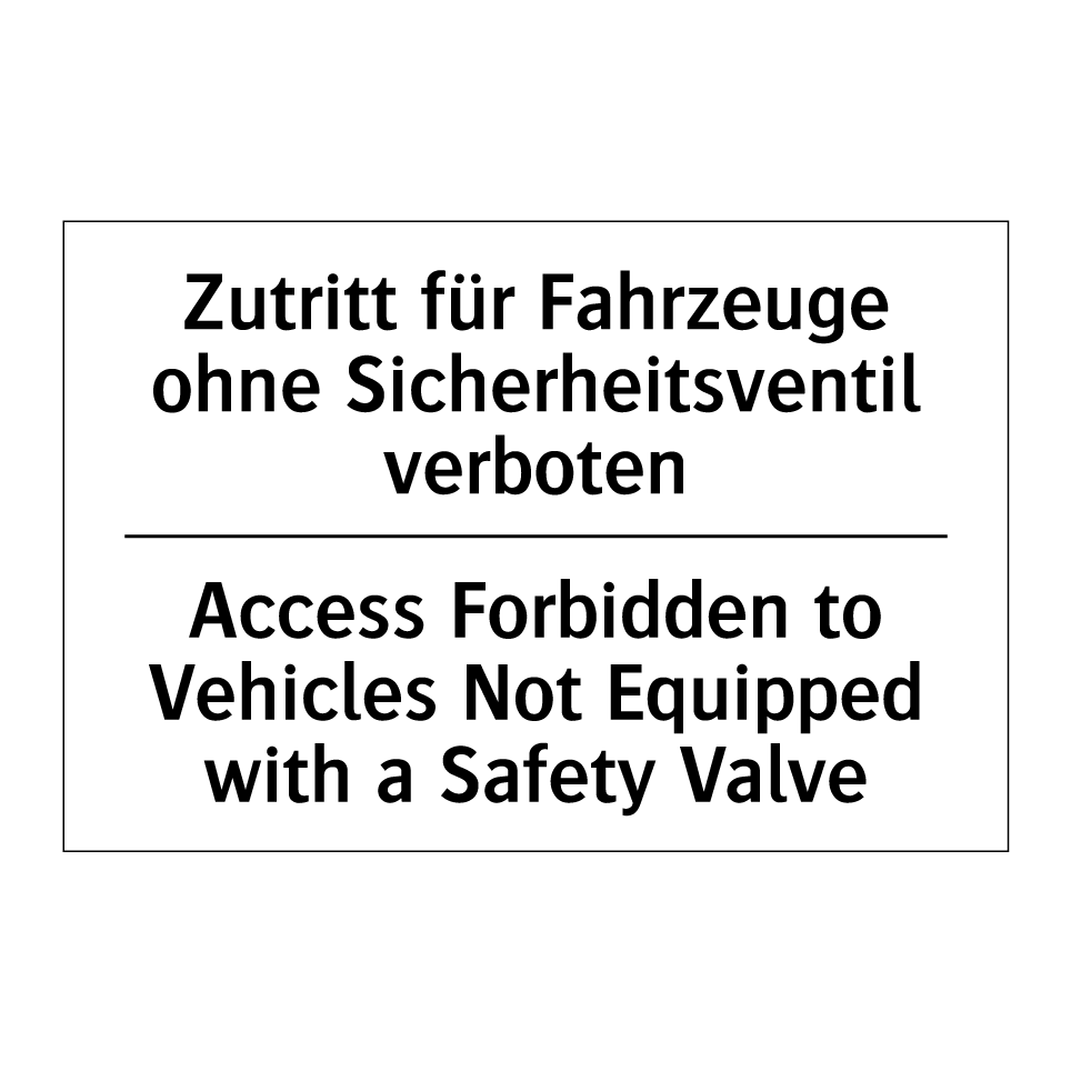 Zweisprachiges Verbotsschild mit deutschem Text Zutritt für Fahrzeuge ohne Sicherheitsventil verboten und englischem Text Access Forbidden to Vehicles Not Equipped with a Safety Valve