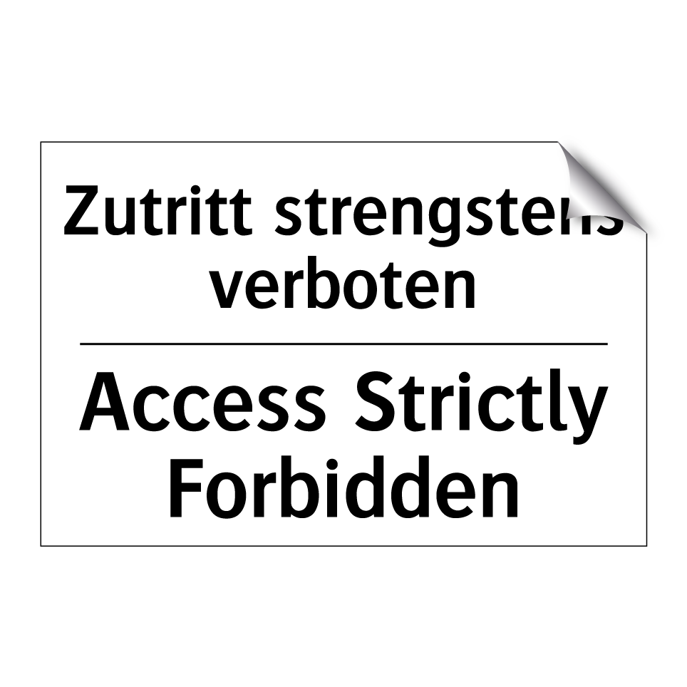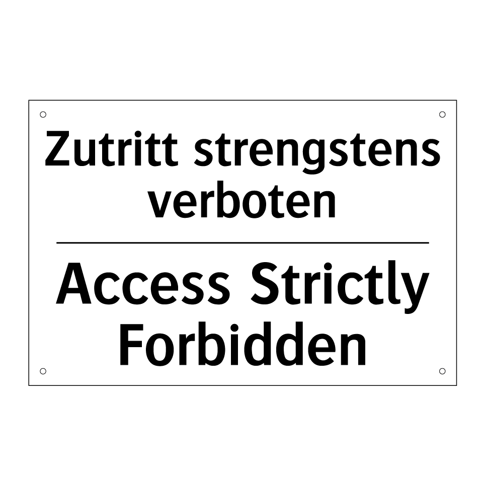 Zweisprachiges Verbotsschild mit deutschem Text Zutritt strengstens verboten und englischem Text Access Strictly Forbidden