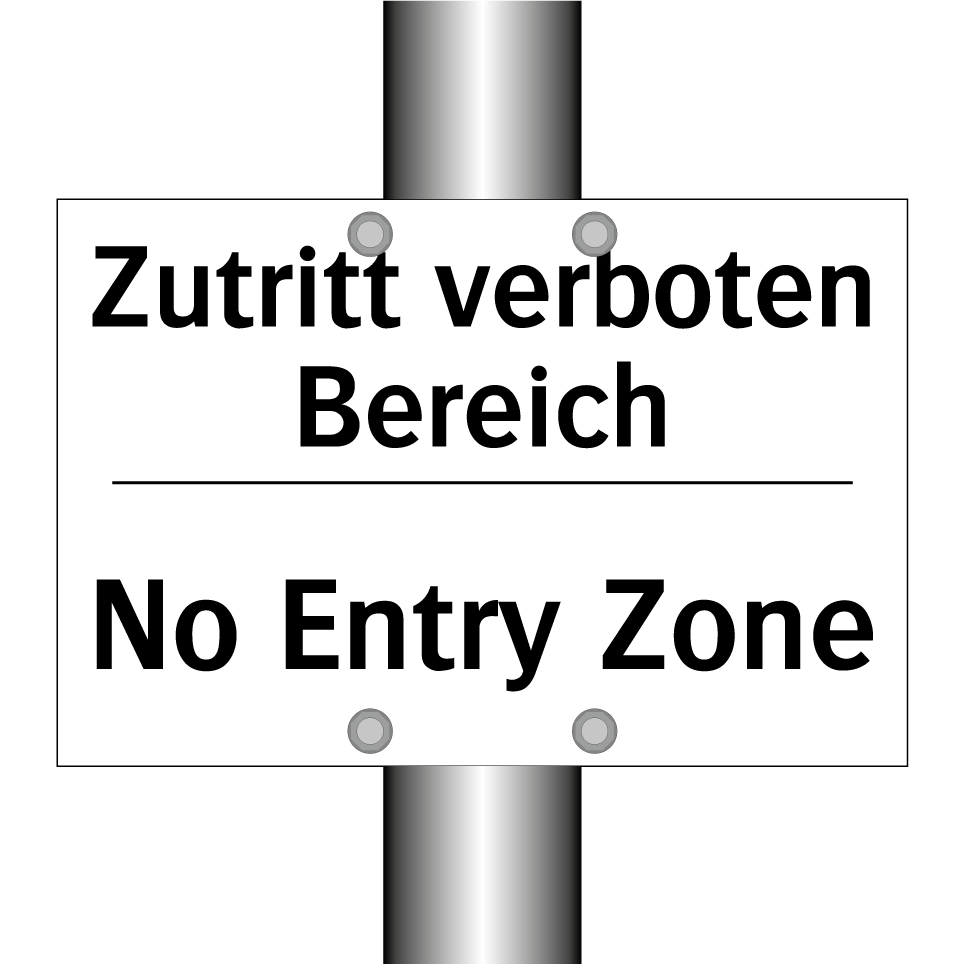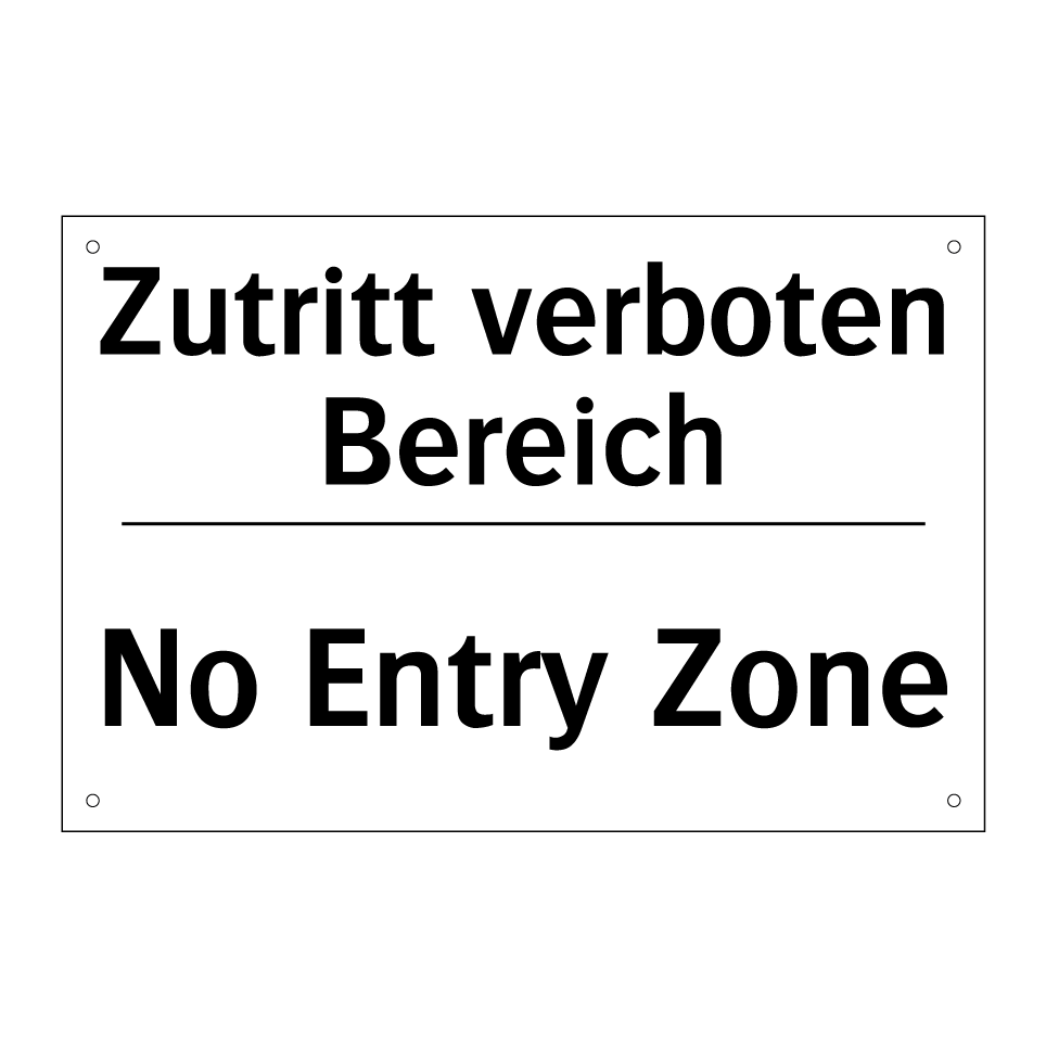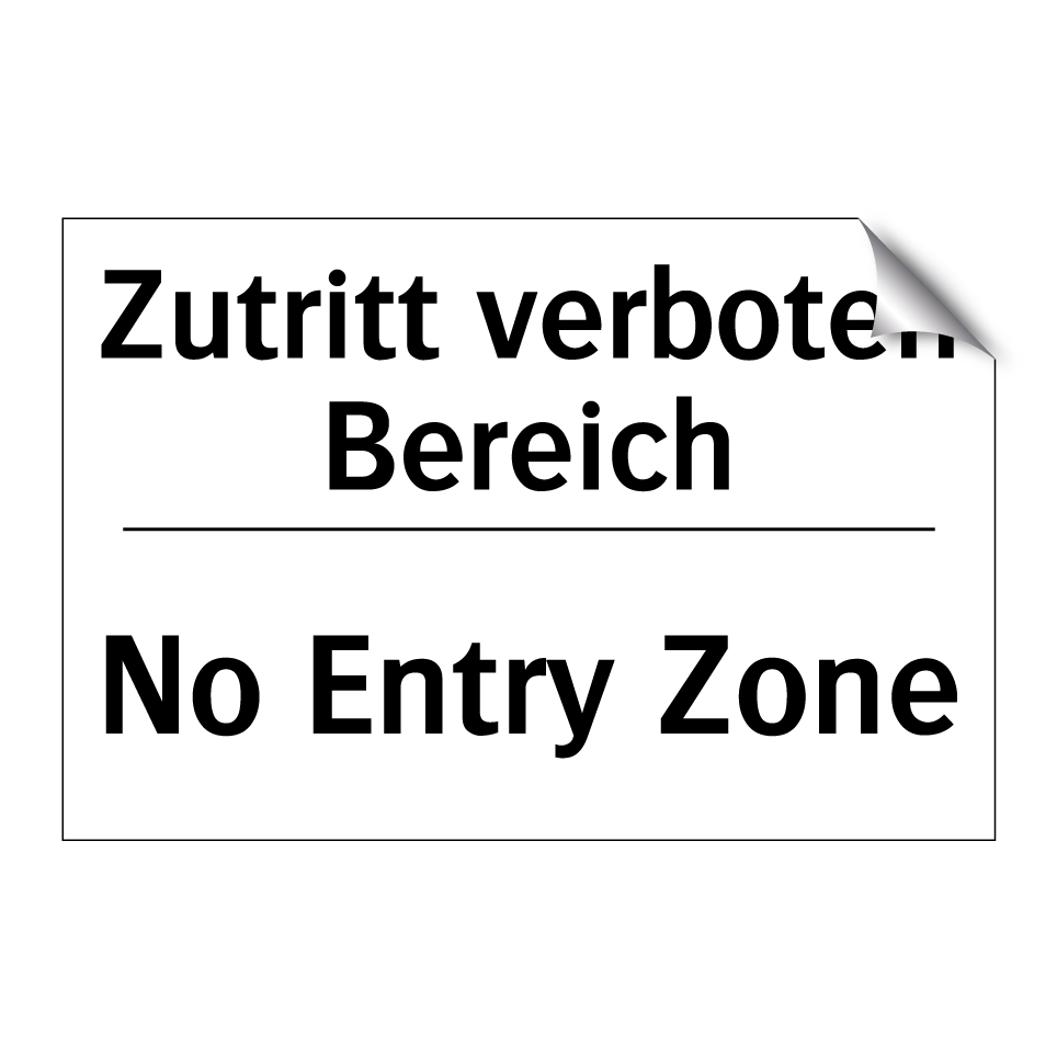 Zweisprachiges Verbotsschild mit deutschem Text Zutritt verboten Bereich und englischem Text No Entry Zone