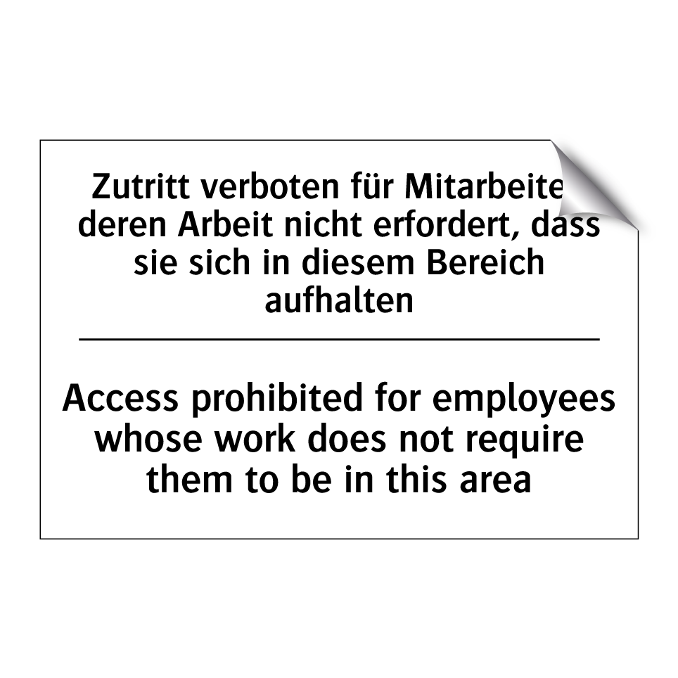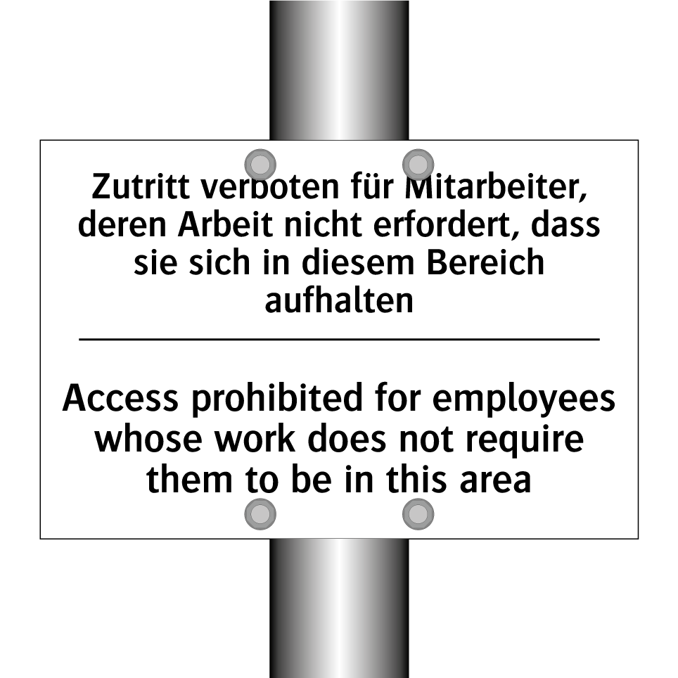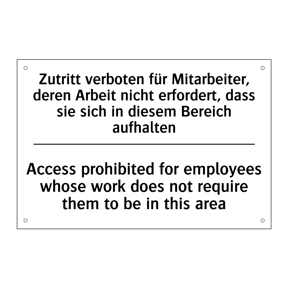 Zweisprachiges Verbotsschild mit deutschem Text Zutritt verboten für Mitarbeiter, deren Arbeit nicht erfordert, dass sie sich in diesem Bereich aufhalten und englischem Text Access prohibited for employees whose work does not require them to be in this area