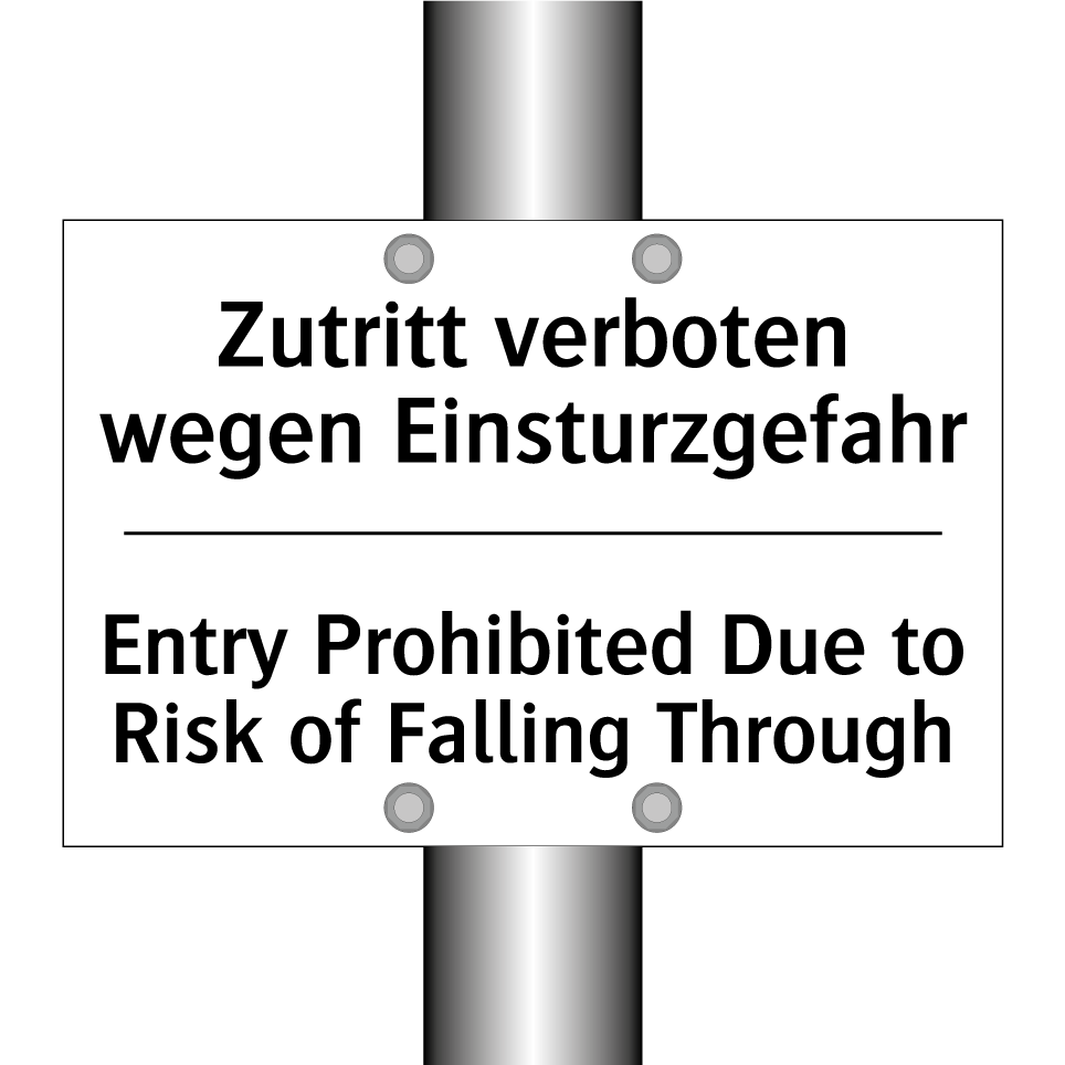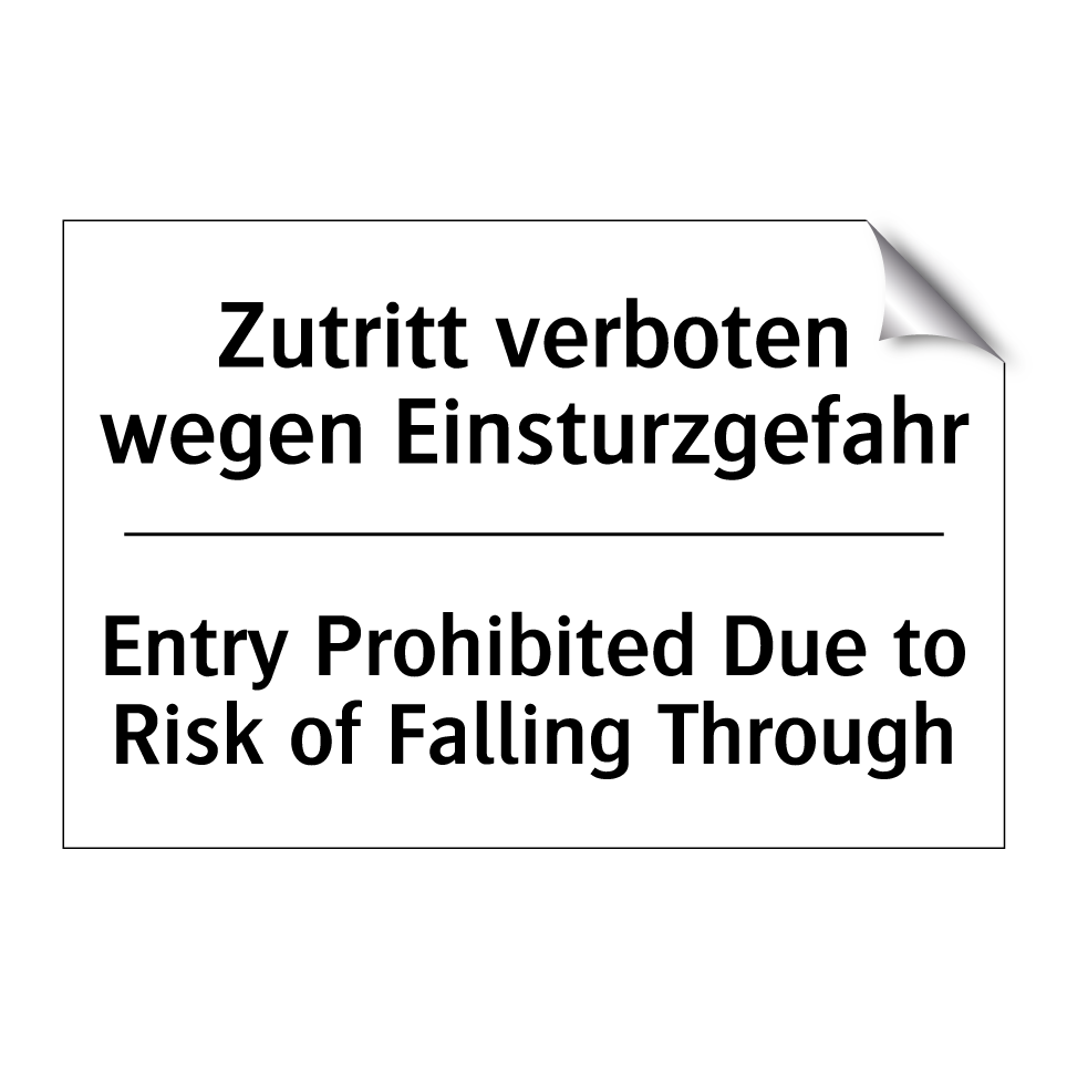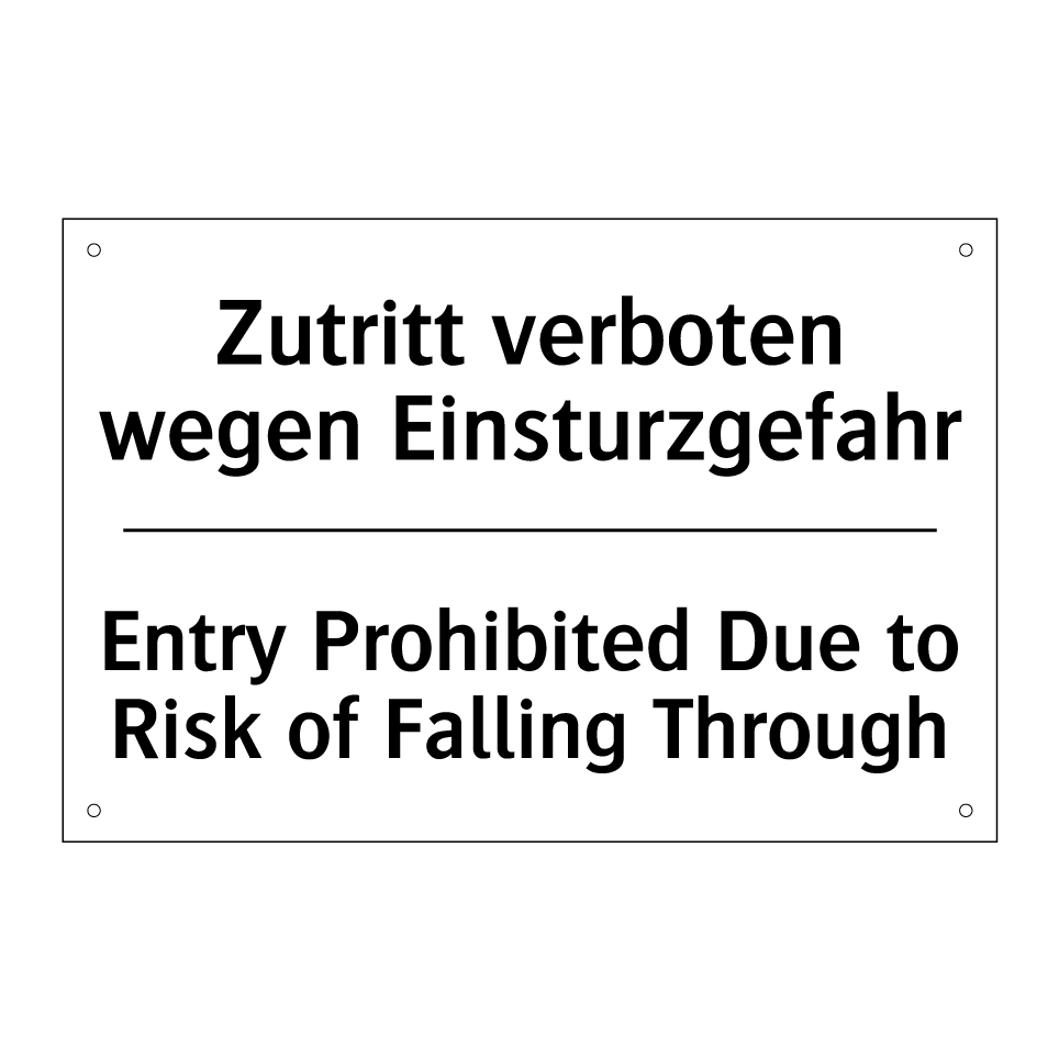 Zweisprachiges Verbotsschild mit deutschem Text Zutritt verboten wegen Einsturzgefahr und englischem Text Entry Prohibited Due to Risk of Falling Through