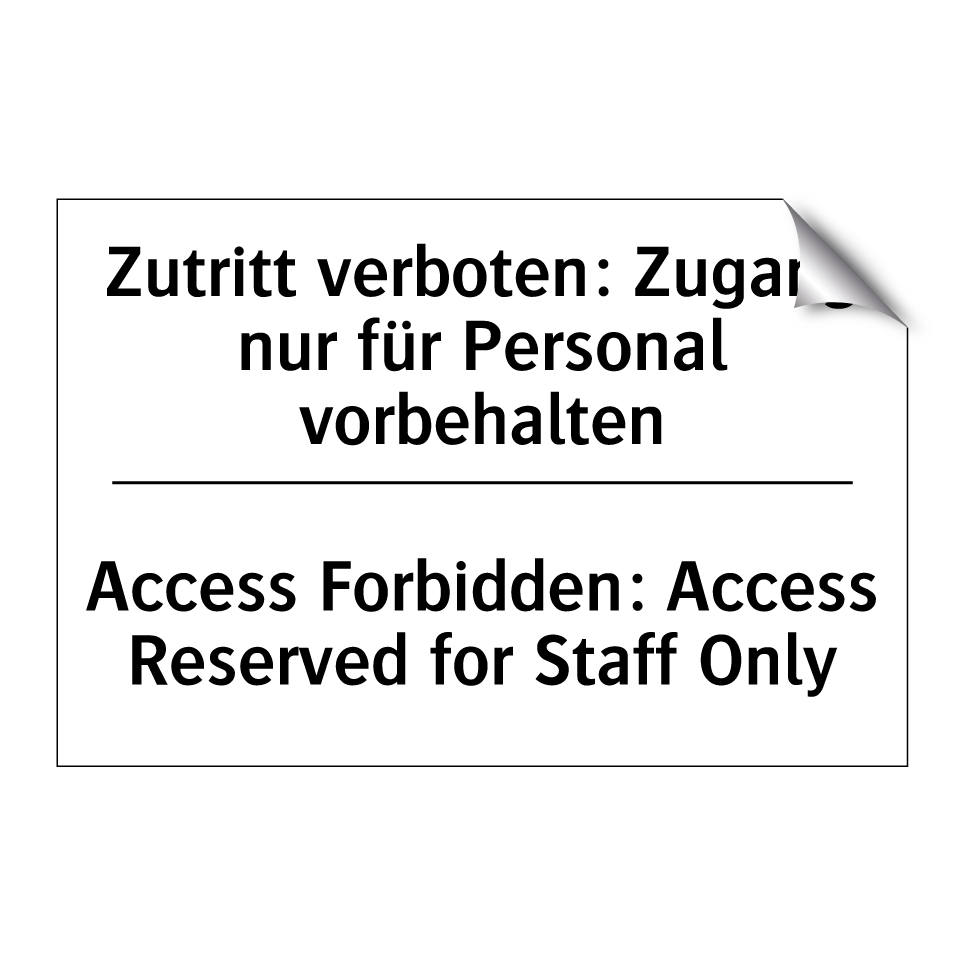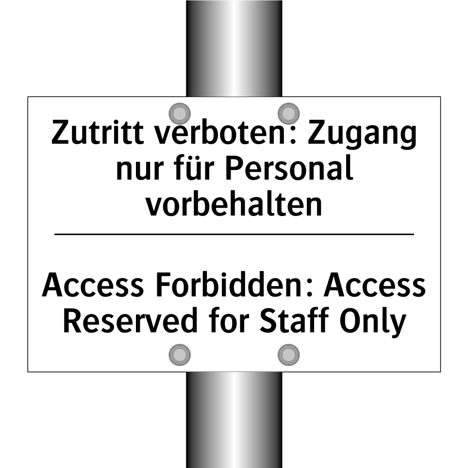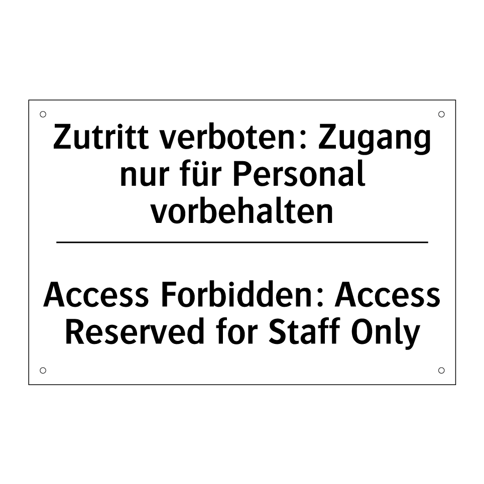Zweisprachiges Verbotsschild mit deutschem Text Zutritt verboten: Zugang nur für Personal vorbehalten und englischem Text Access Forbidden: Access Reserved for Staff Only