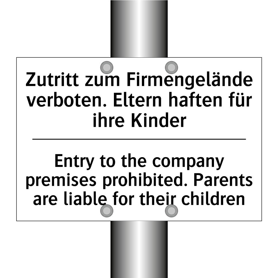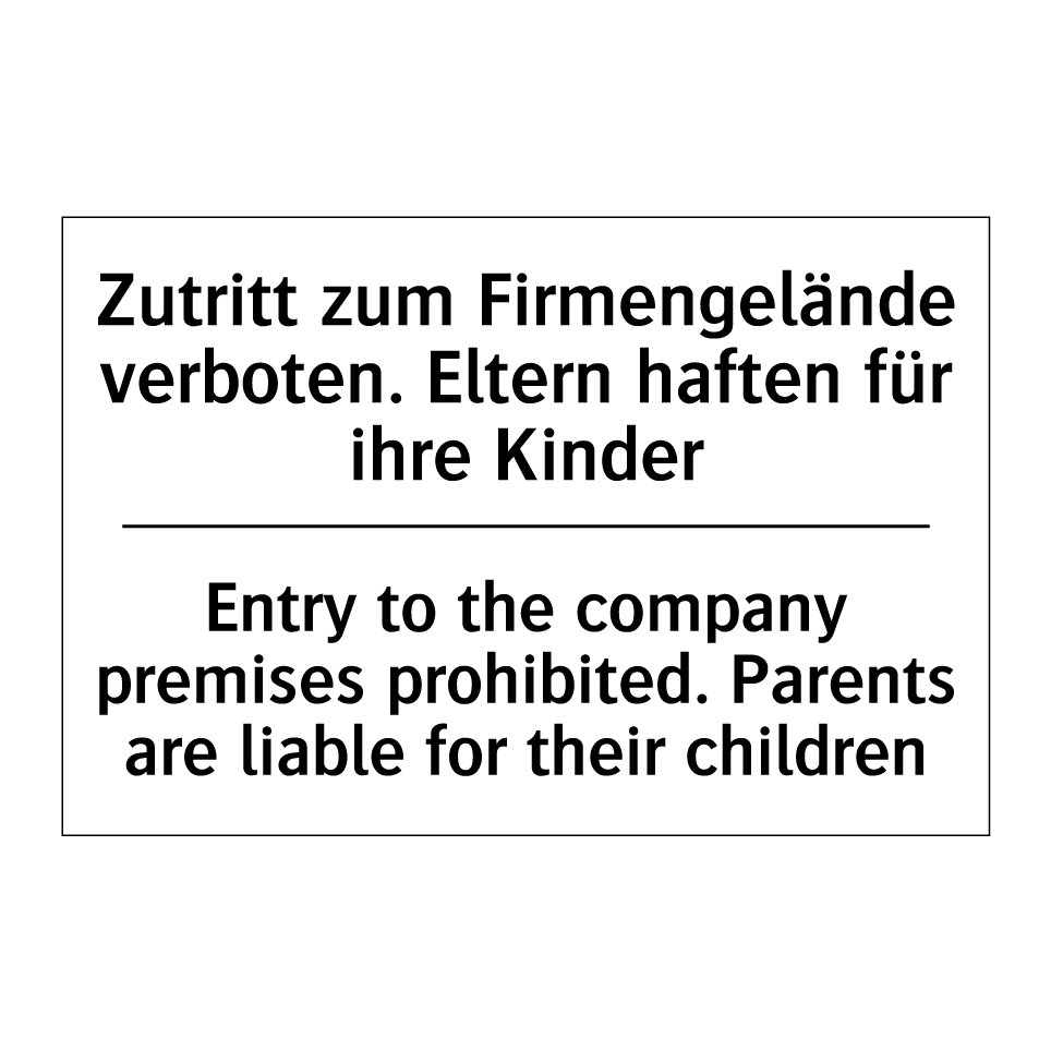 Zweisprachiges Verbotsschild mit deutschem Text Zutritt zum Firmengelände verboten. Eltern haften für ihre Kinder und englischem Text Entry to the company premises prohibited. Parents are liable for their children