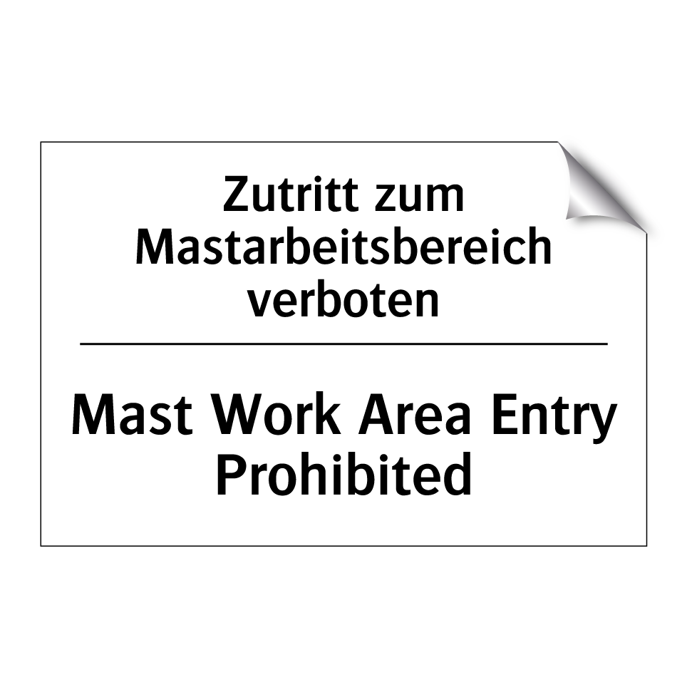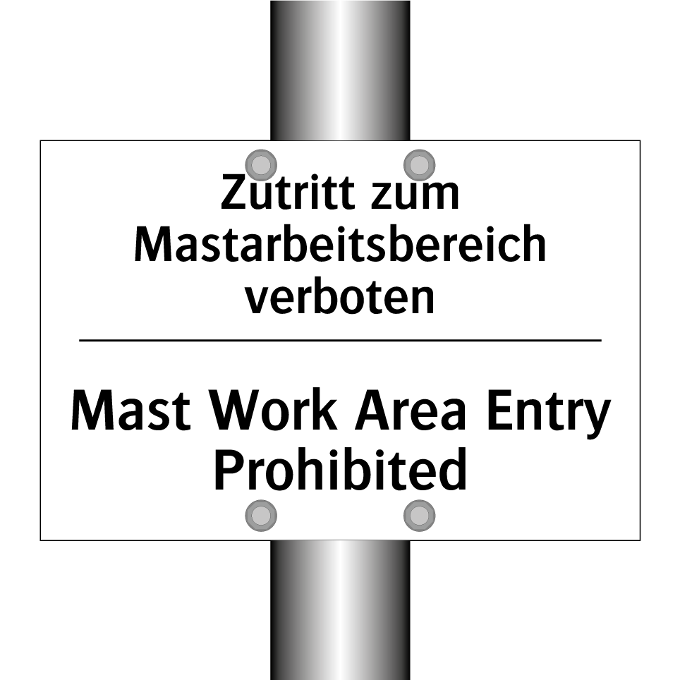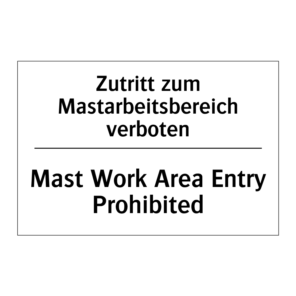 Zweisprachiges Verbotsschild mit deutschem Text Zutritt zum Mastarbeitsbereich verboten und englischem Text Mast Work Area Entry Prohibited
