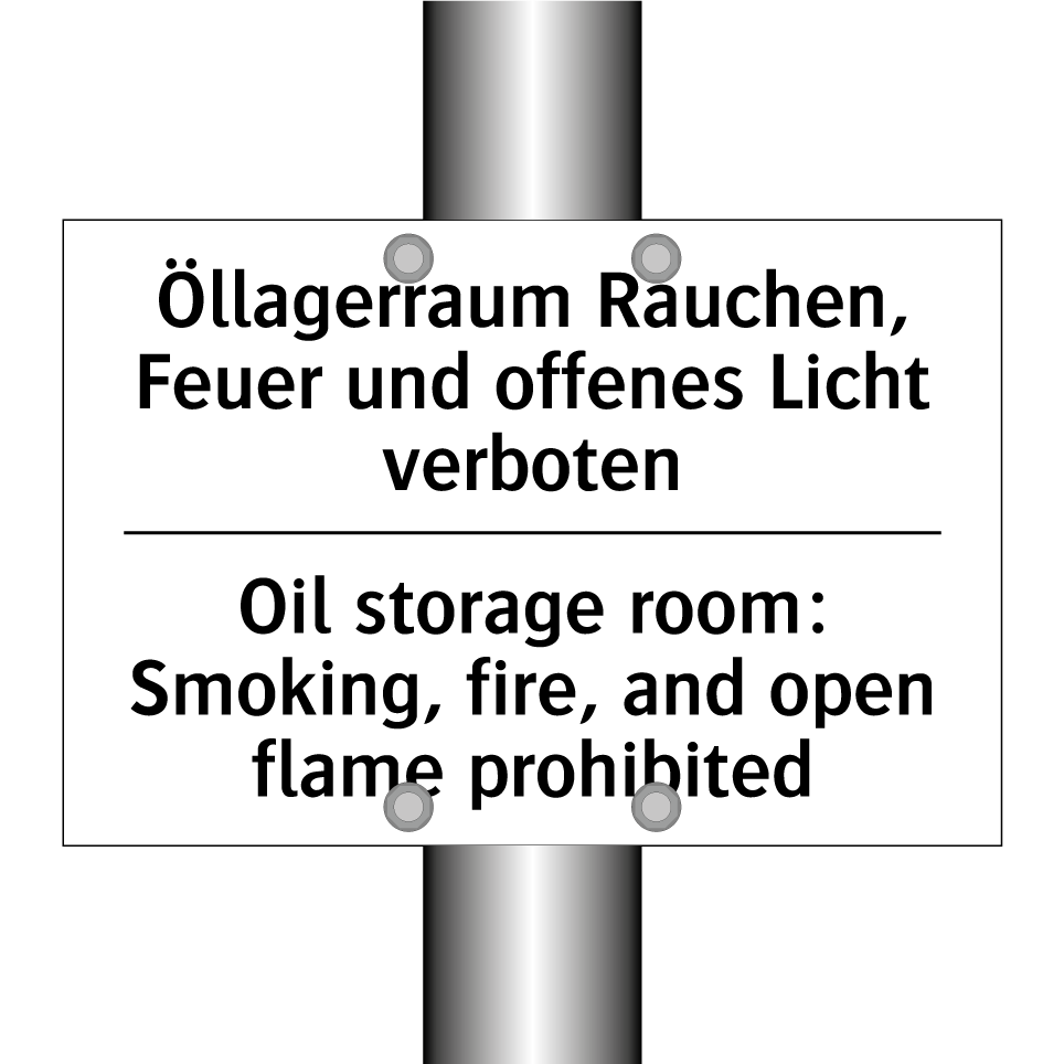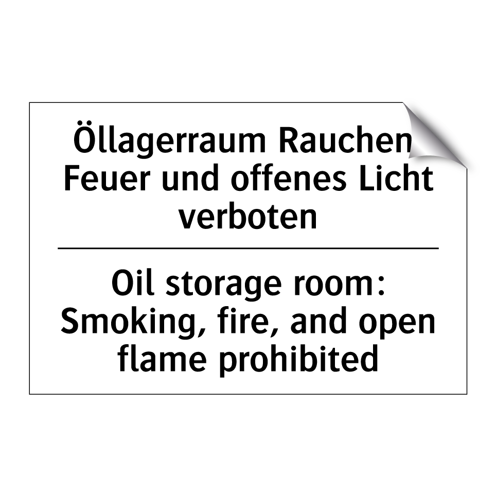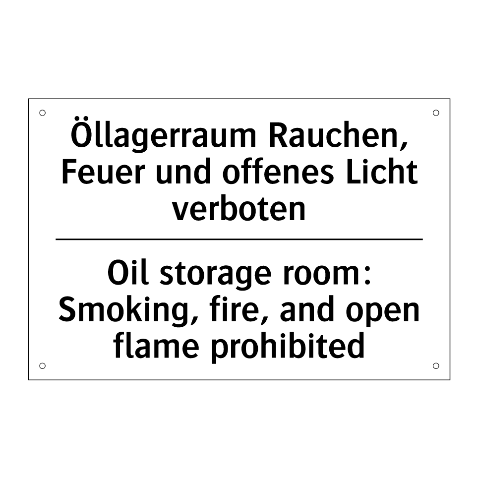 Zweisprachiges Verbotsschild mit deutschem Text Öllagerraum Rauchen, Feuer und offenes Licht verboten und englischem Text Oil storage room: Smoking, fire, and open flame prohibited