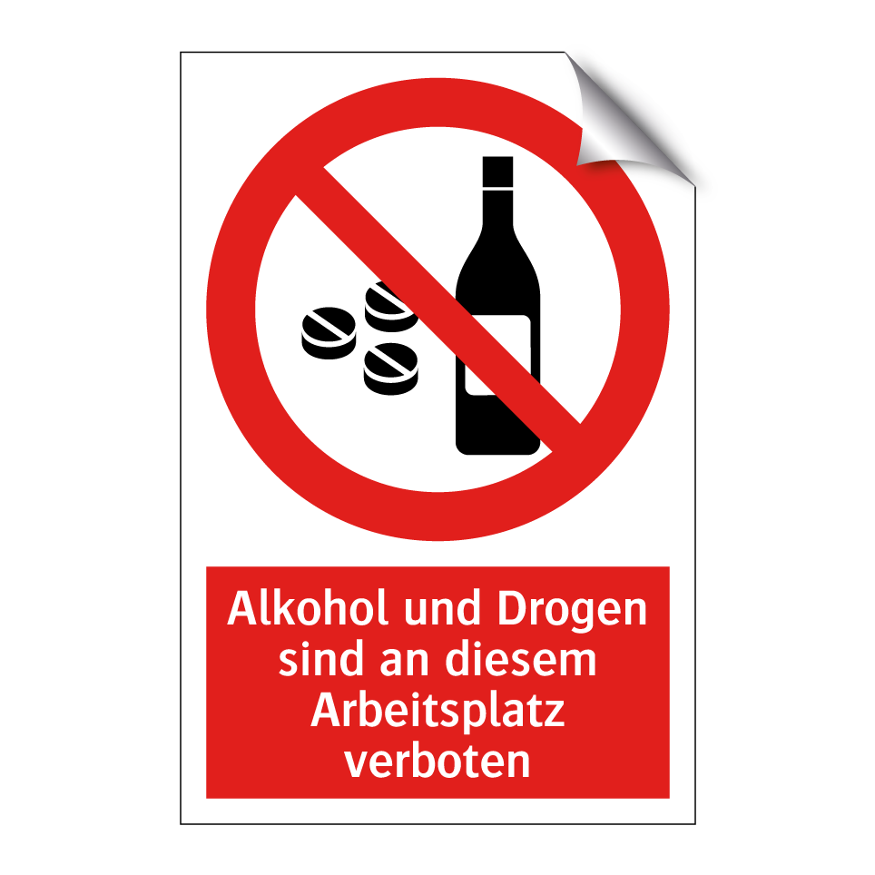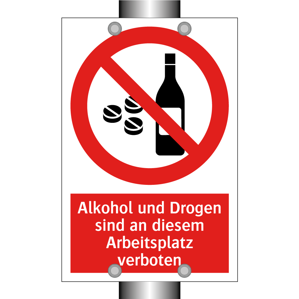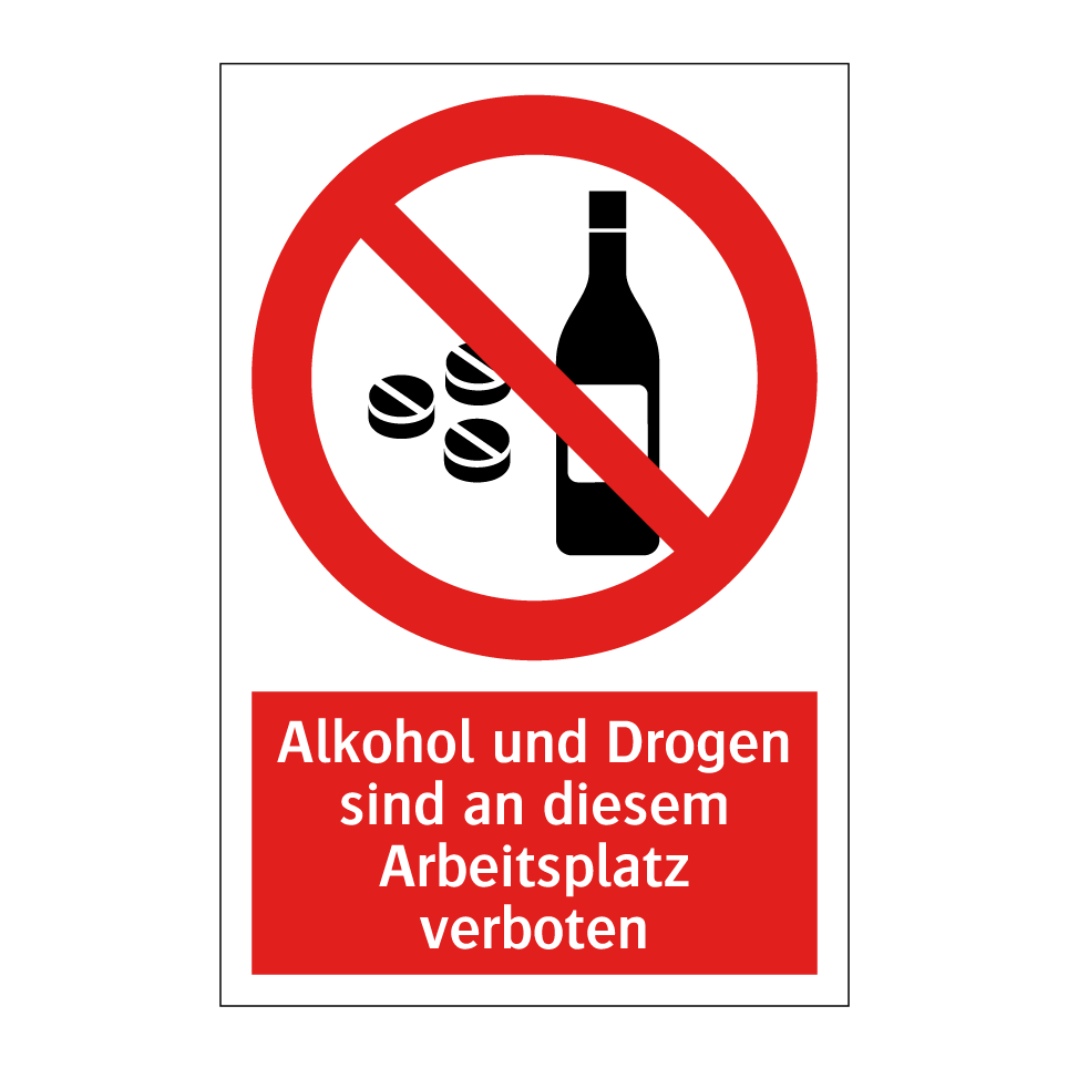 Verbotsschild mit dem Text Alkohol und Drogen sind an diesem Arbeitsplatz verboten