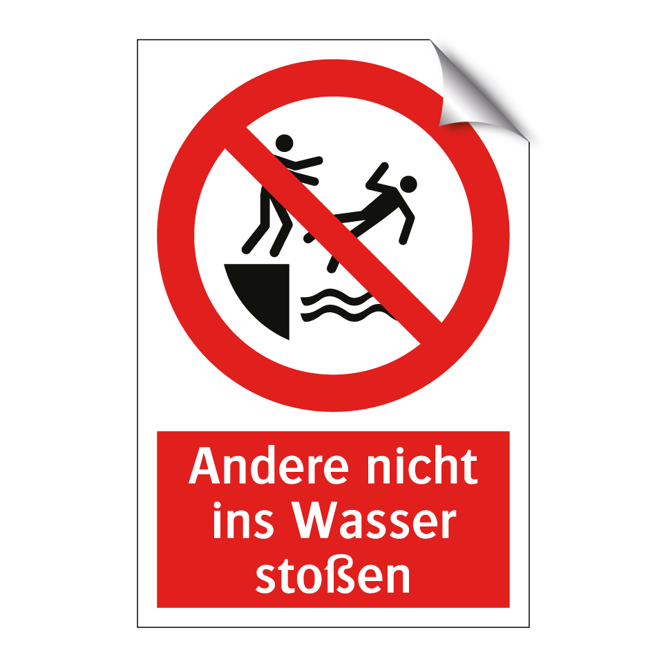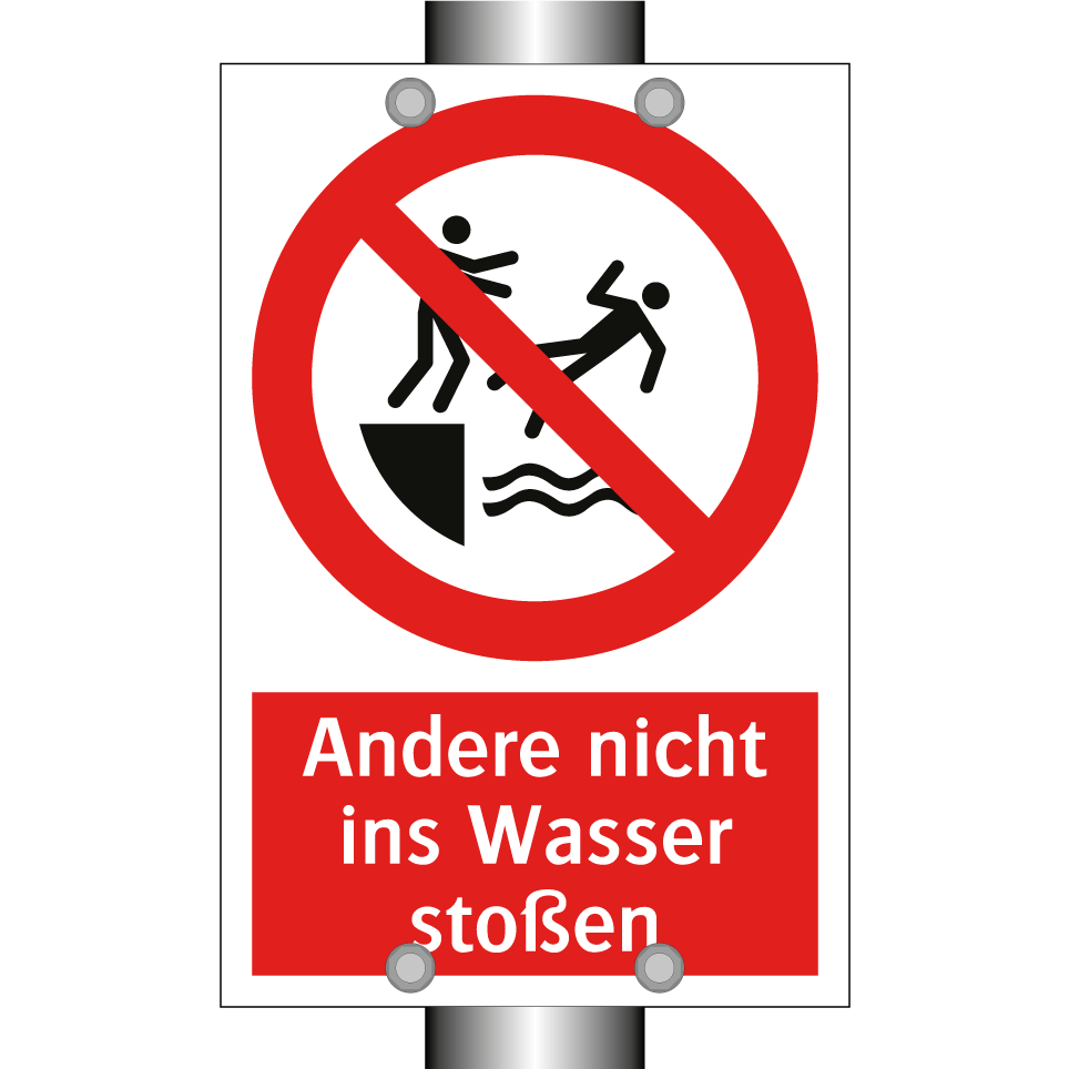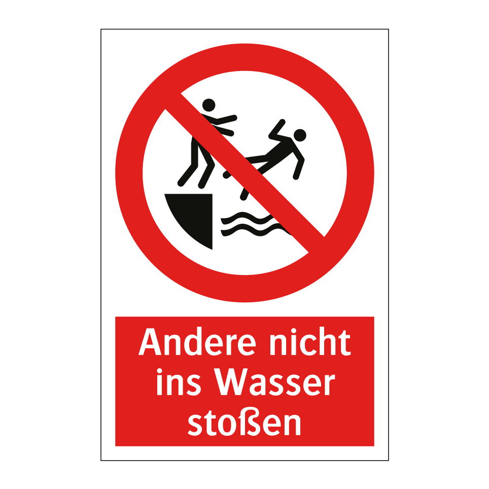 Verbotsschild mit dem Text Andere nicht ins Wasser stoßen