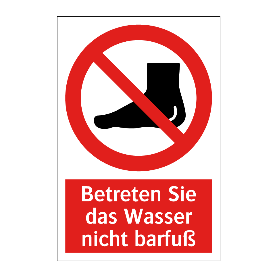 Verbotsschild mit dem Text Betreten Sie das Wasser nicht barfuß