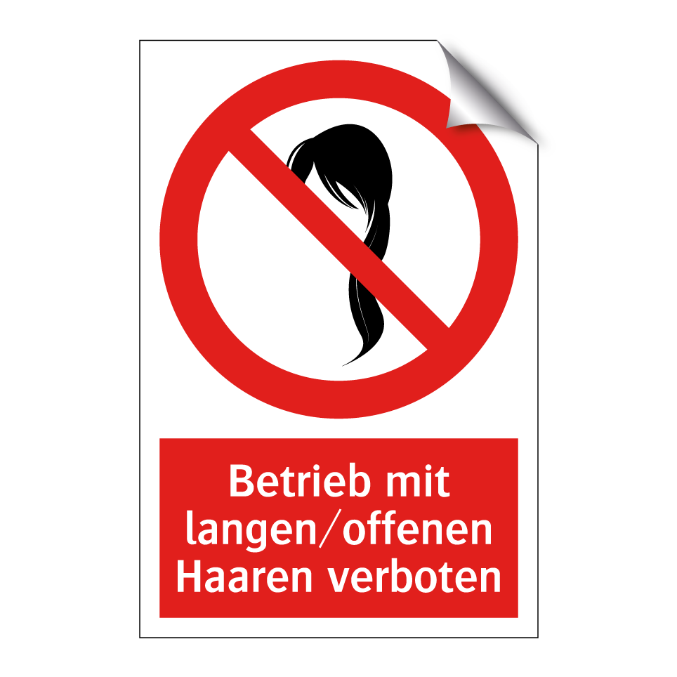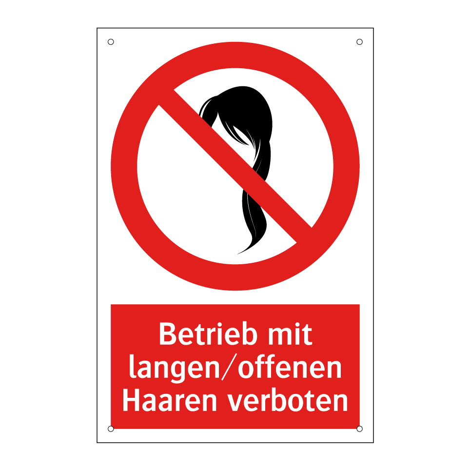 Verbotsschild mit dem Text Betrieb mit langen/offenen Haaren verboten