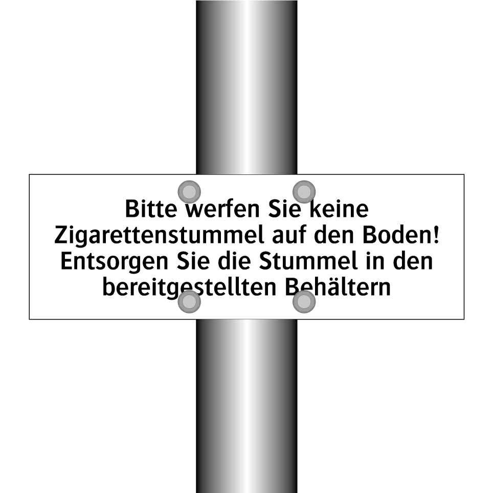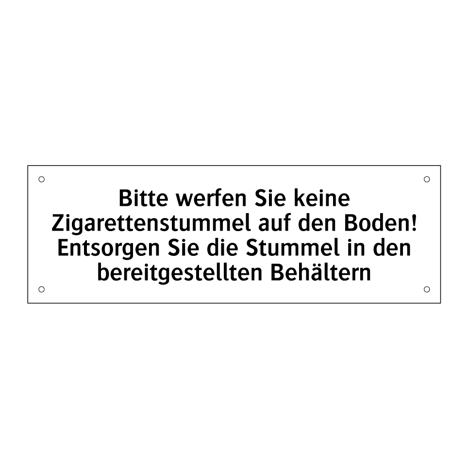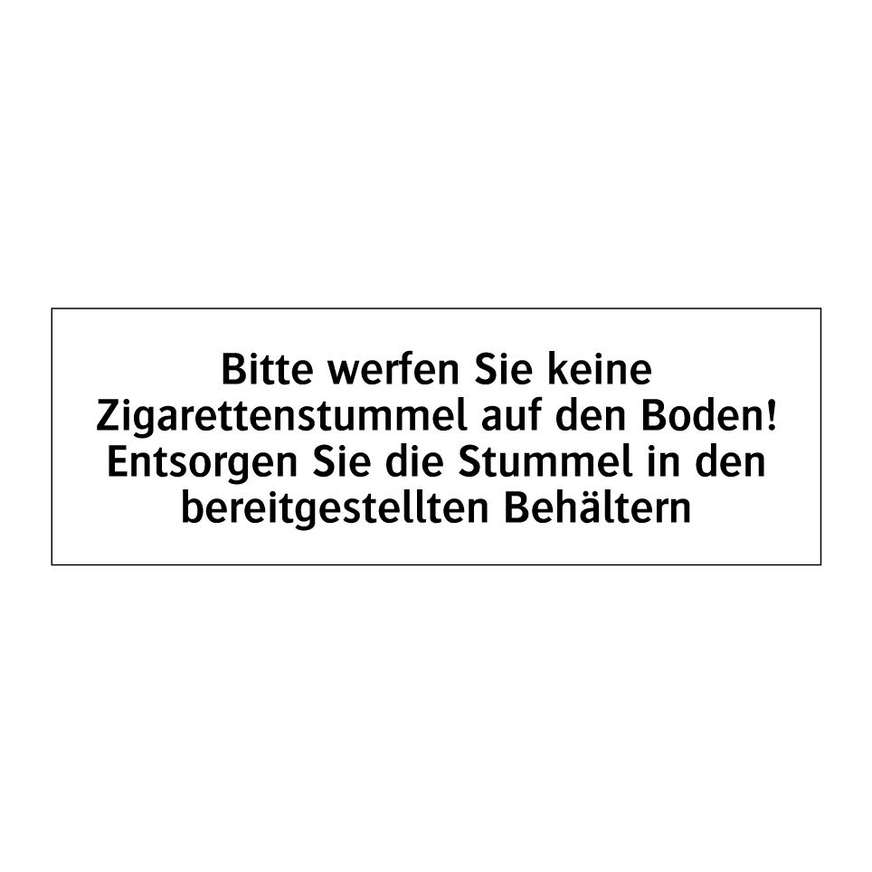 Verbotsschild mit dem Text Bitte werfen Sie keine Zigarettenstummel auf den Boden! Entsorgen Sie die Stummel in den bereitgestellten Behältern