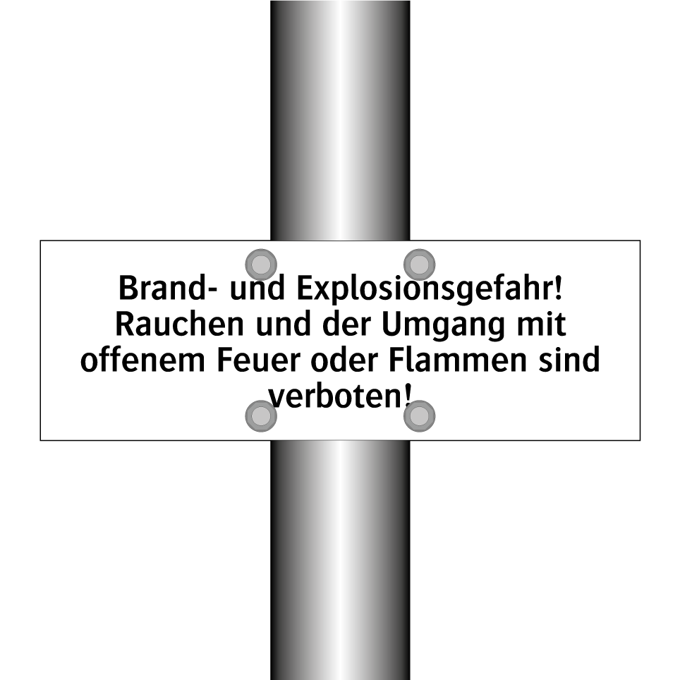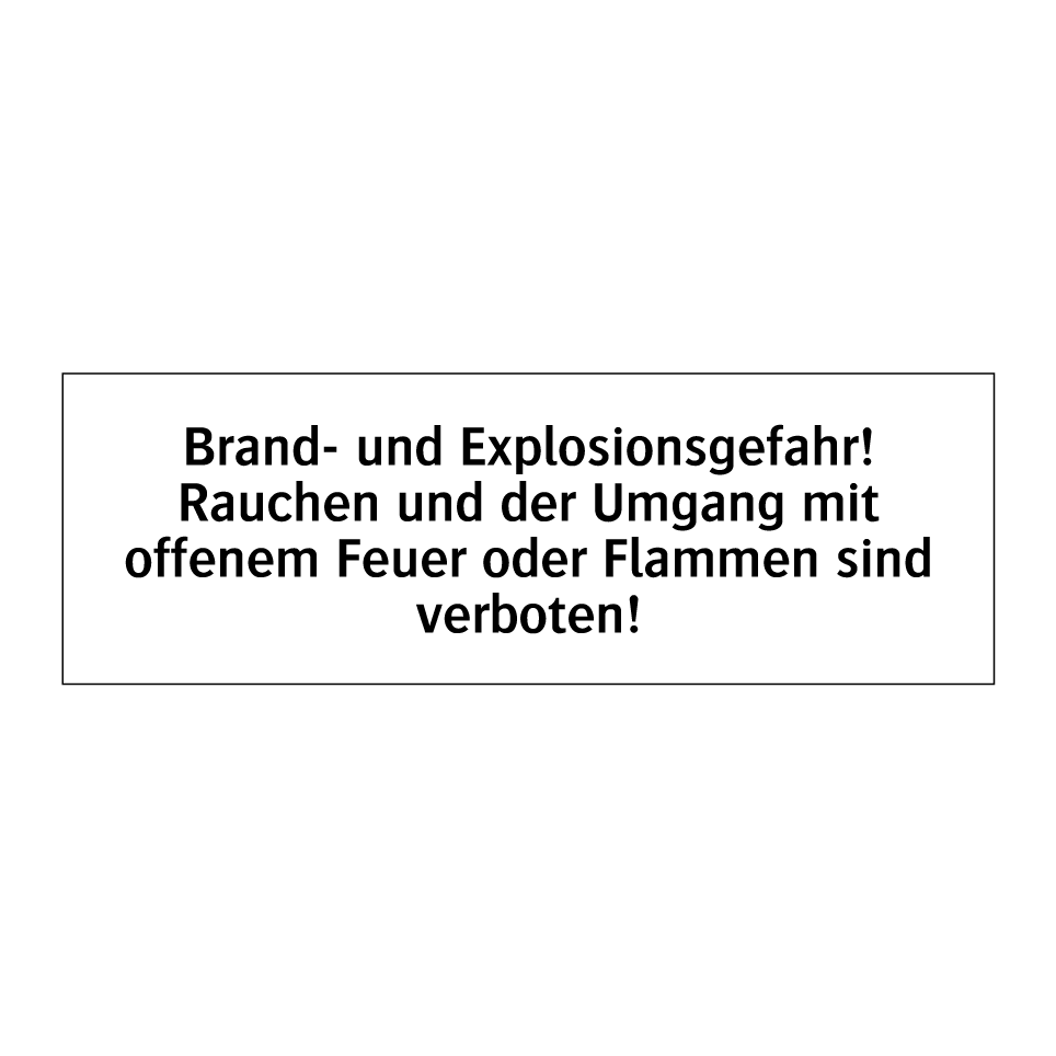 Verbotsschild mit dem Text Brand- und Explosionsgefahr! Rauchen und der Umgang mit offenem Feuer oder Flammen sind verboten!